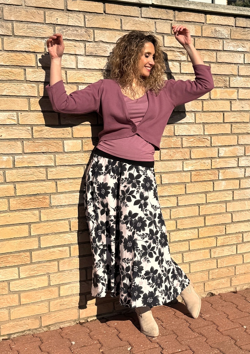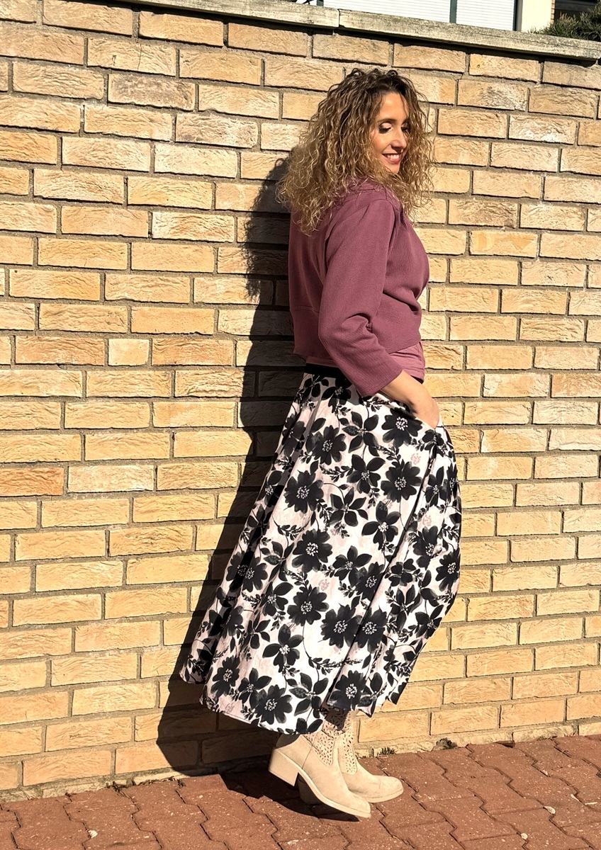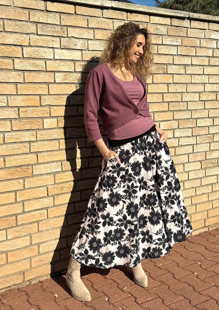 Polokolová sukně  je ušitá z úpletu 60% bavlna, 40% viskóza. Pásek je vyztužený proti vytažení.