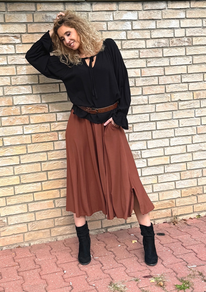 Rozšířená sukně je ušitá z pružného úpletu viskóza /elastan. Pásek je vyztužený proti vytažení. V bočních švech jsou kapsy a ve spodní části malé rozparky.