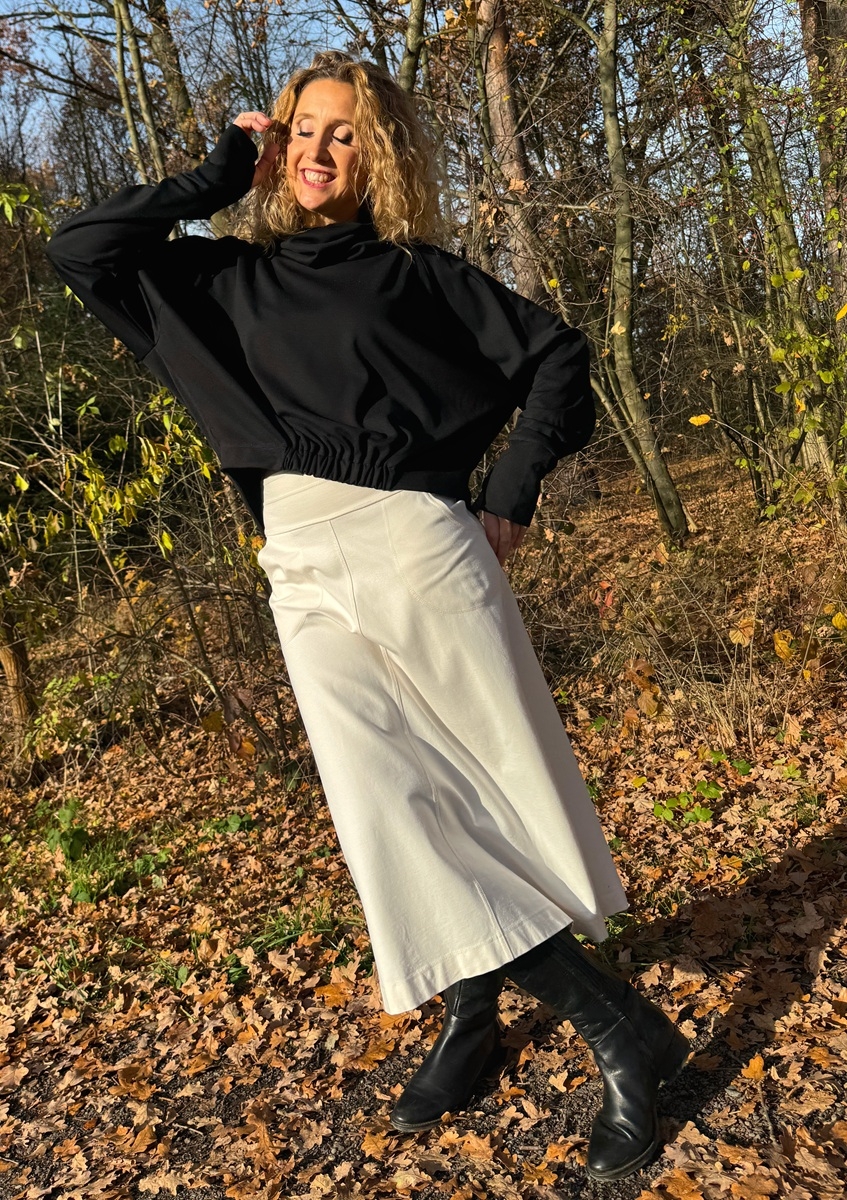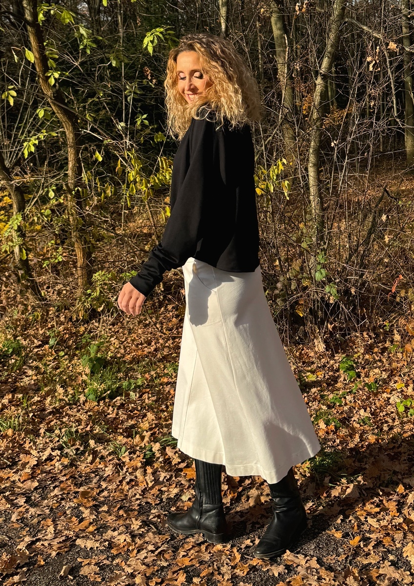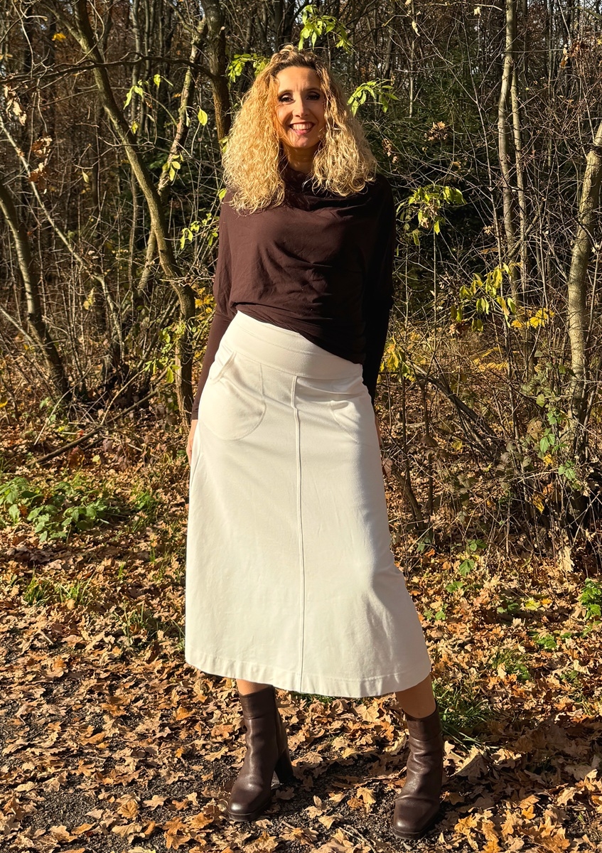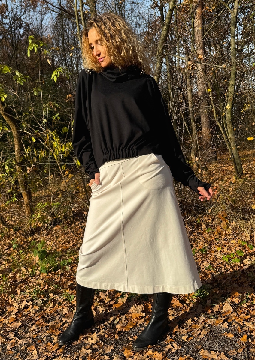 Zvonová sukně je ušitá ze silnějšího zátěžového úpletu (Vis/pes/el) punto . Pásek je pružný. Sukně má klasické vnitřní kapsy.