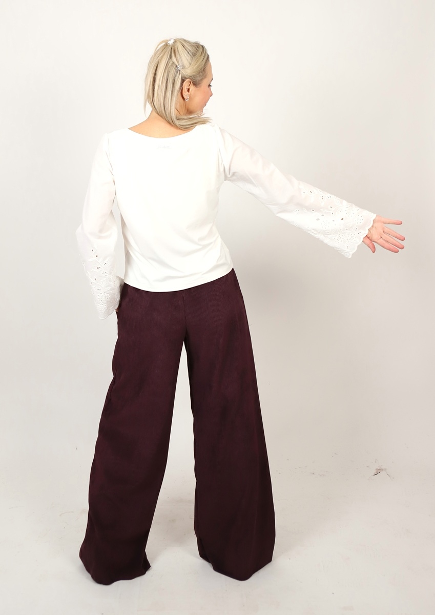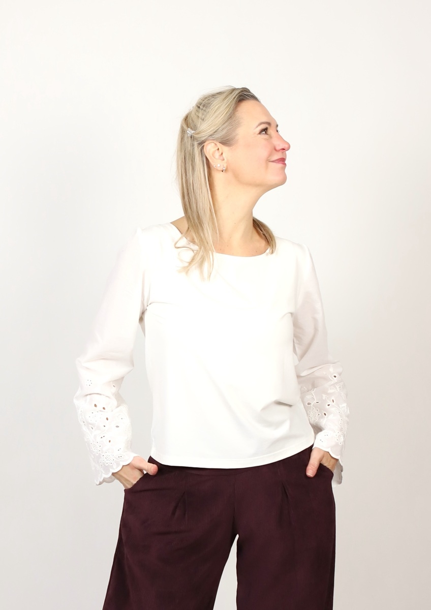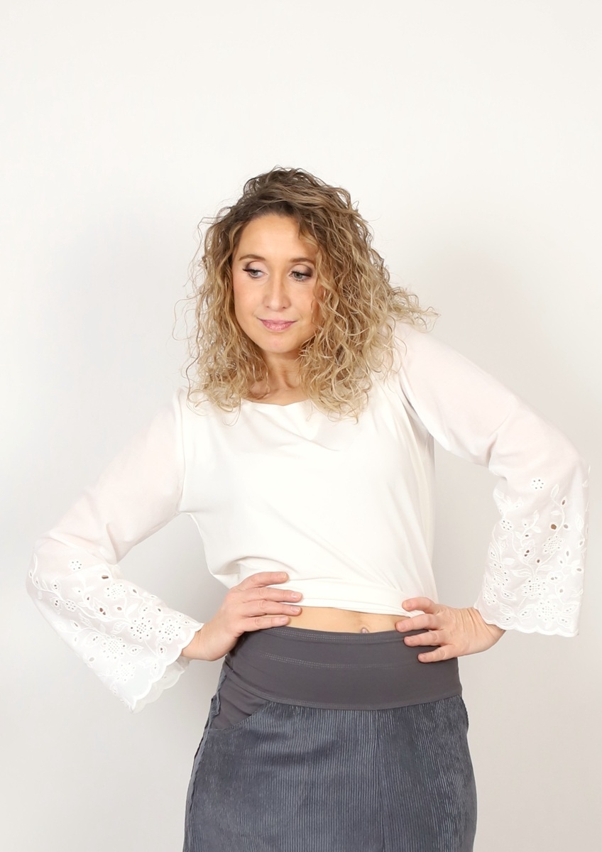 Tričko je ušité z úpletu viskóza/elastan se zdobenými krajkovými rukávy z bavlněné madeiry.