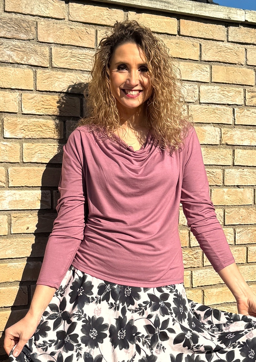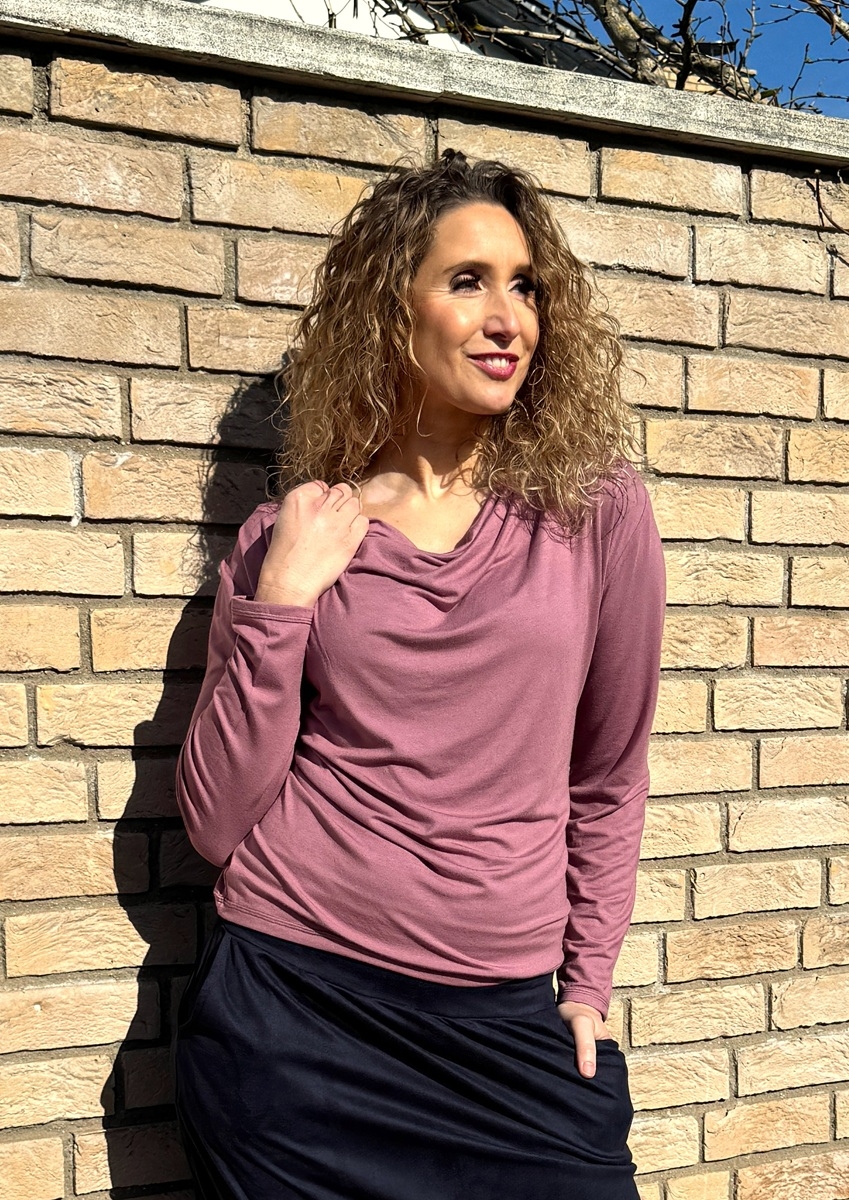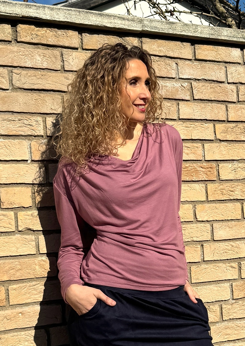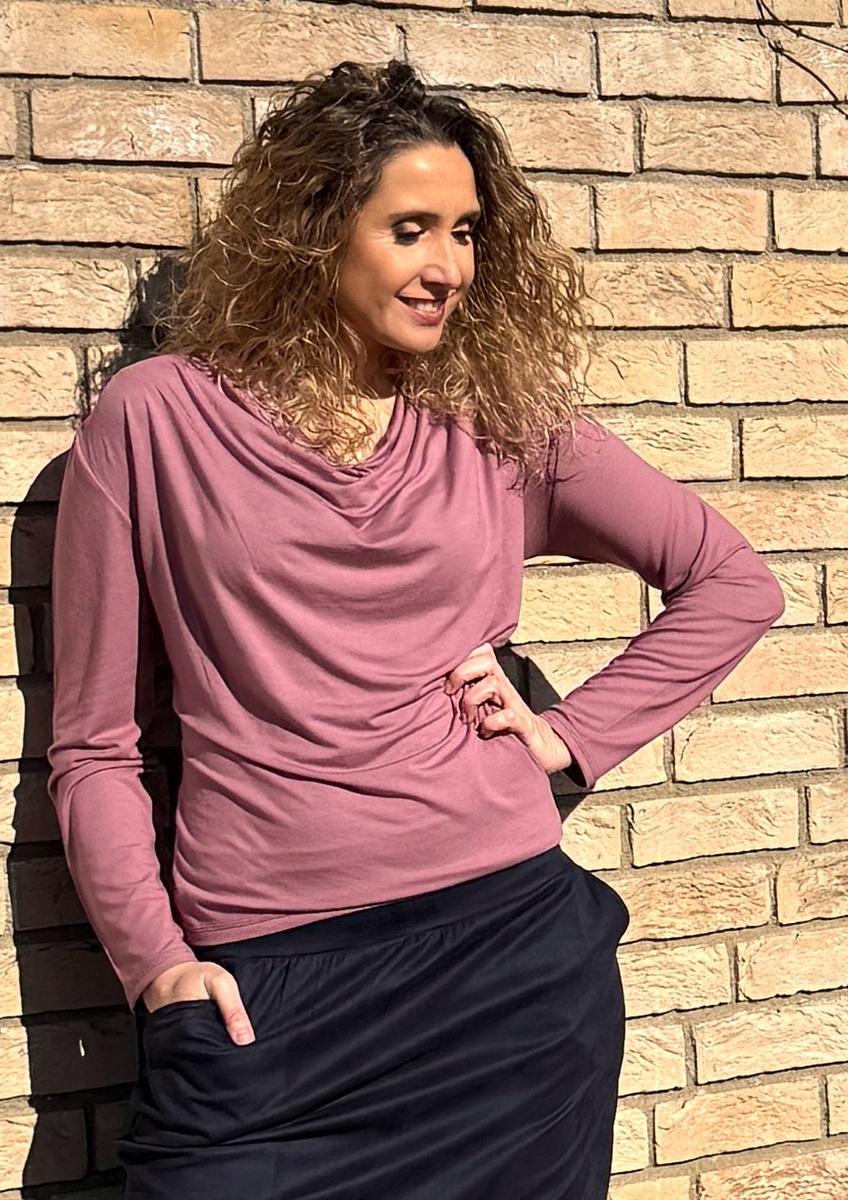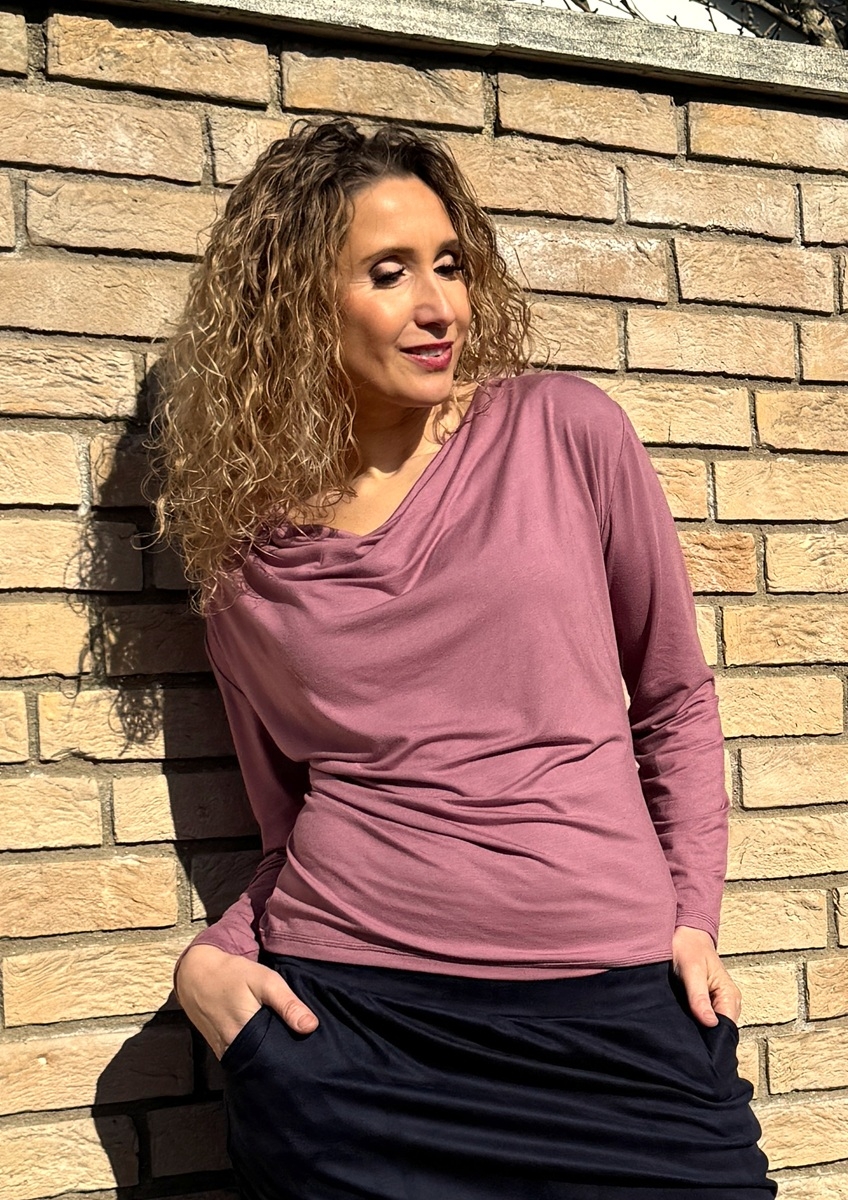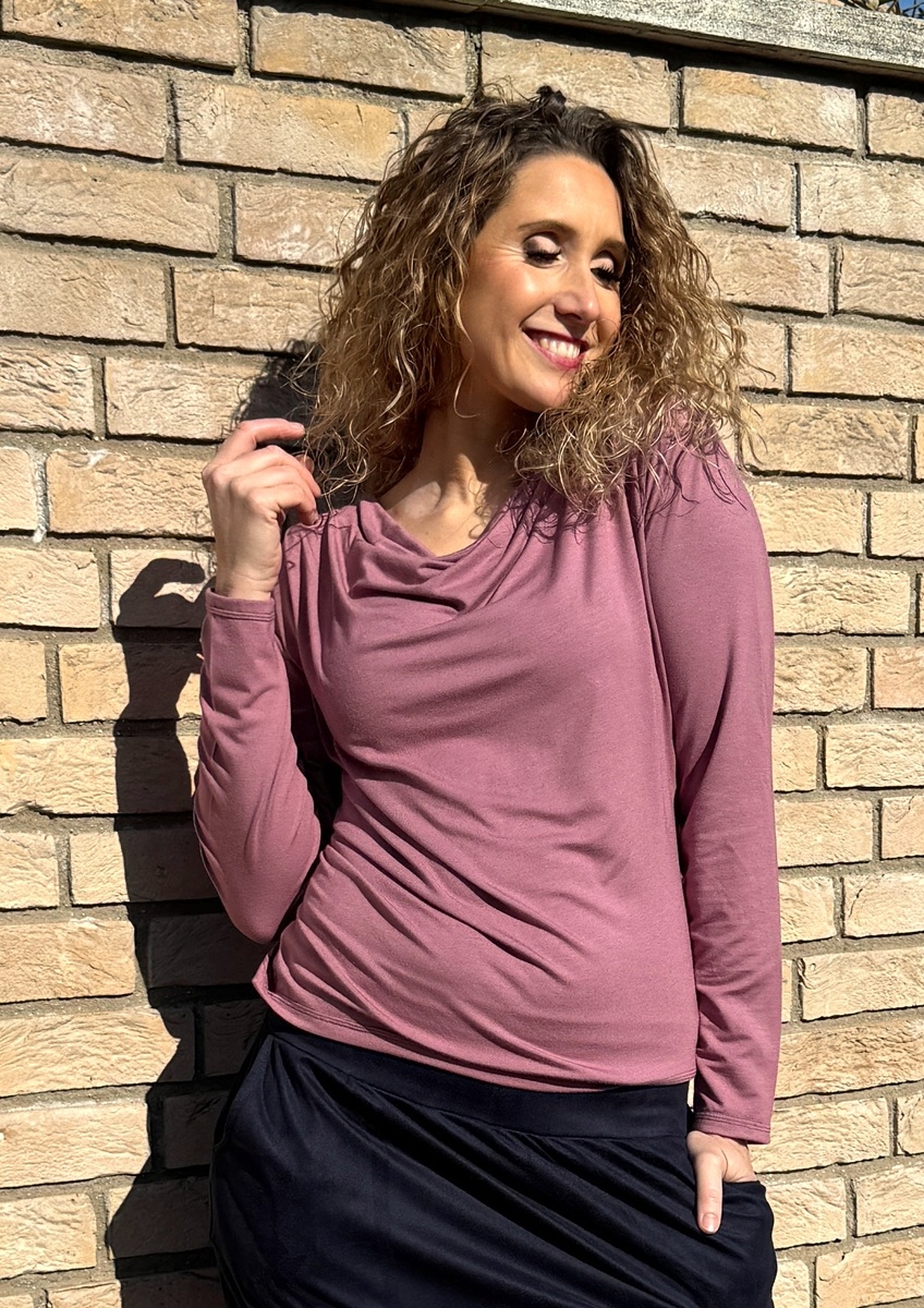 Tričko s navolněným výstřihem (vodou) je ušité z příjemného splývavého modalového úpletu (viskóza/elastan).