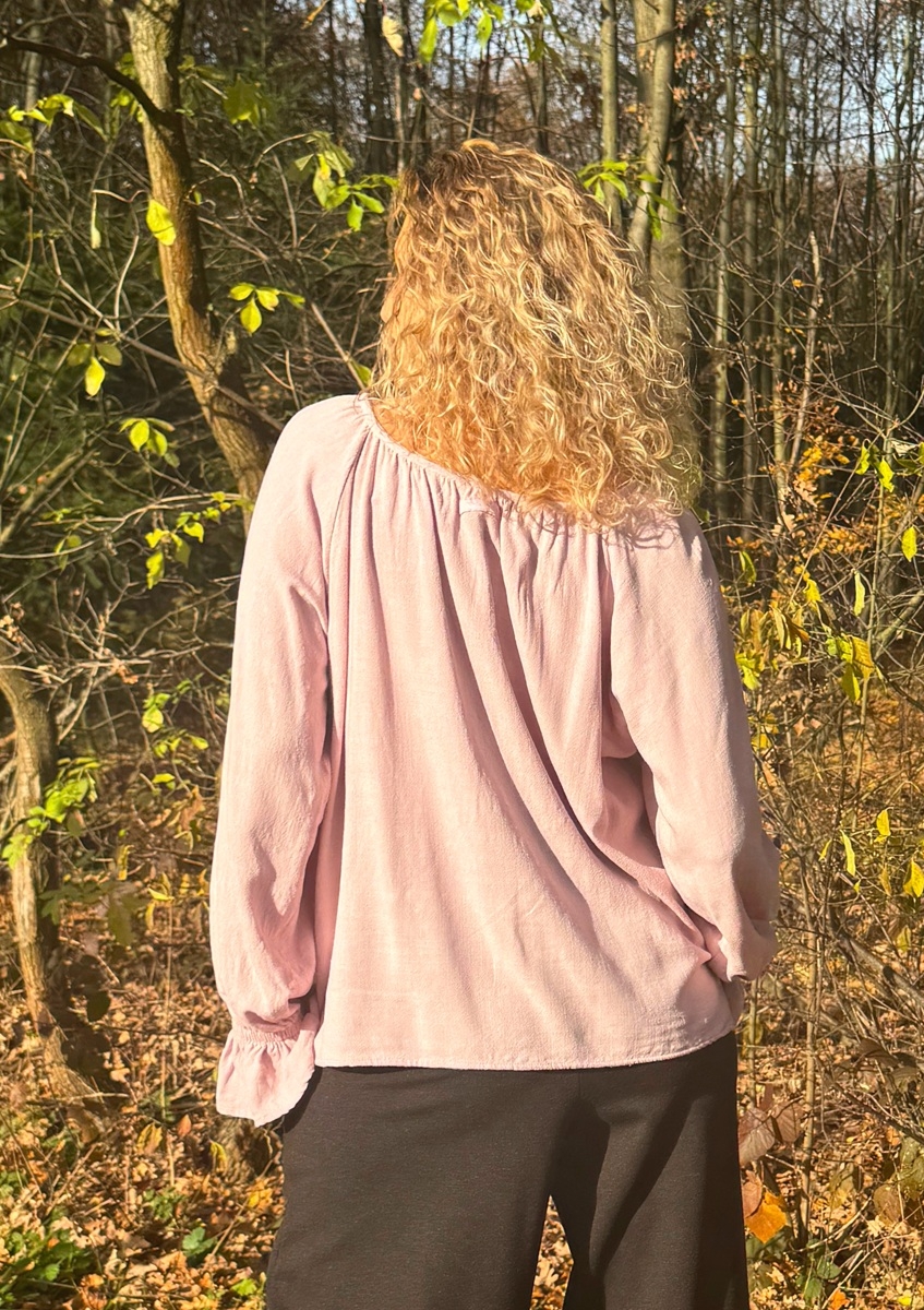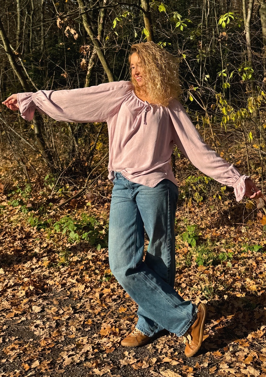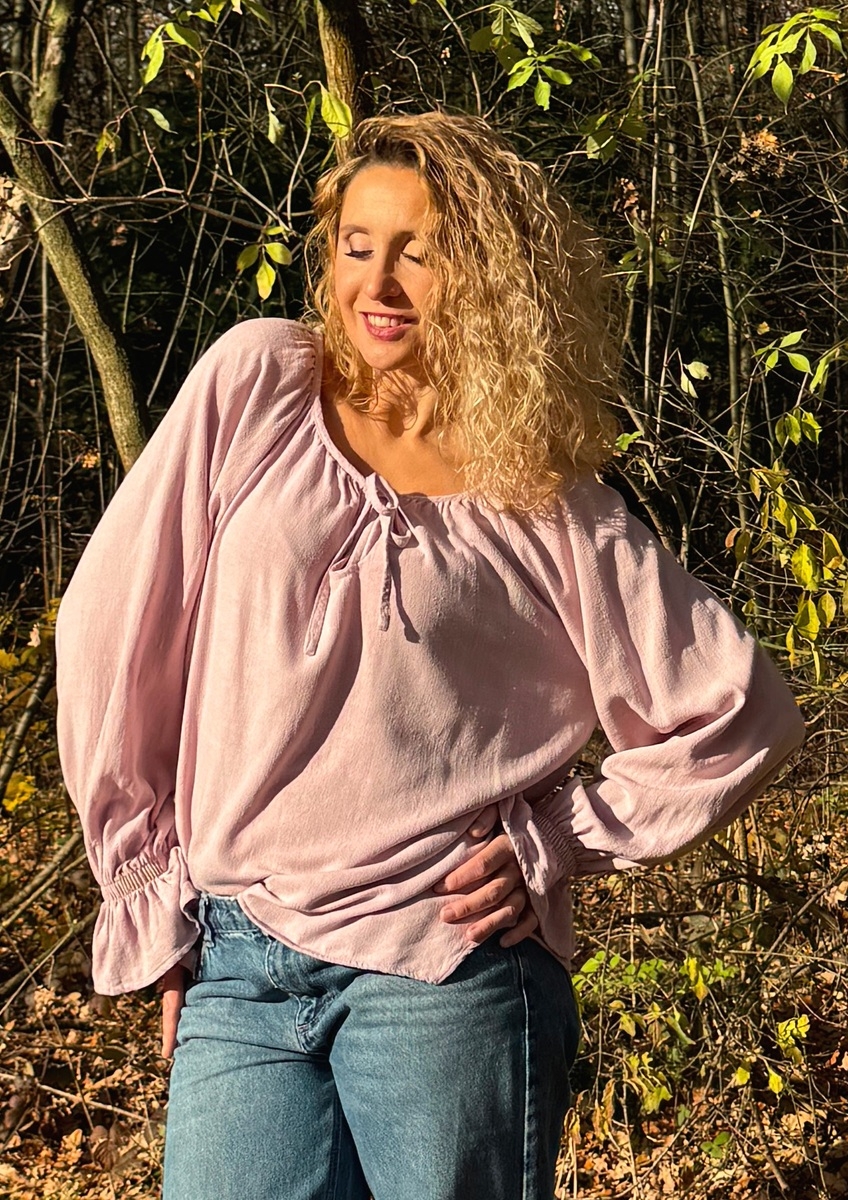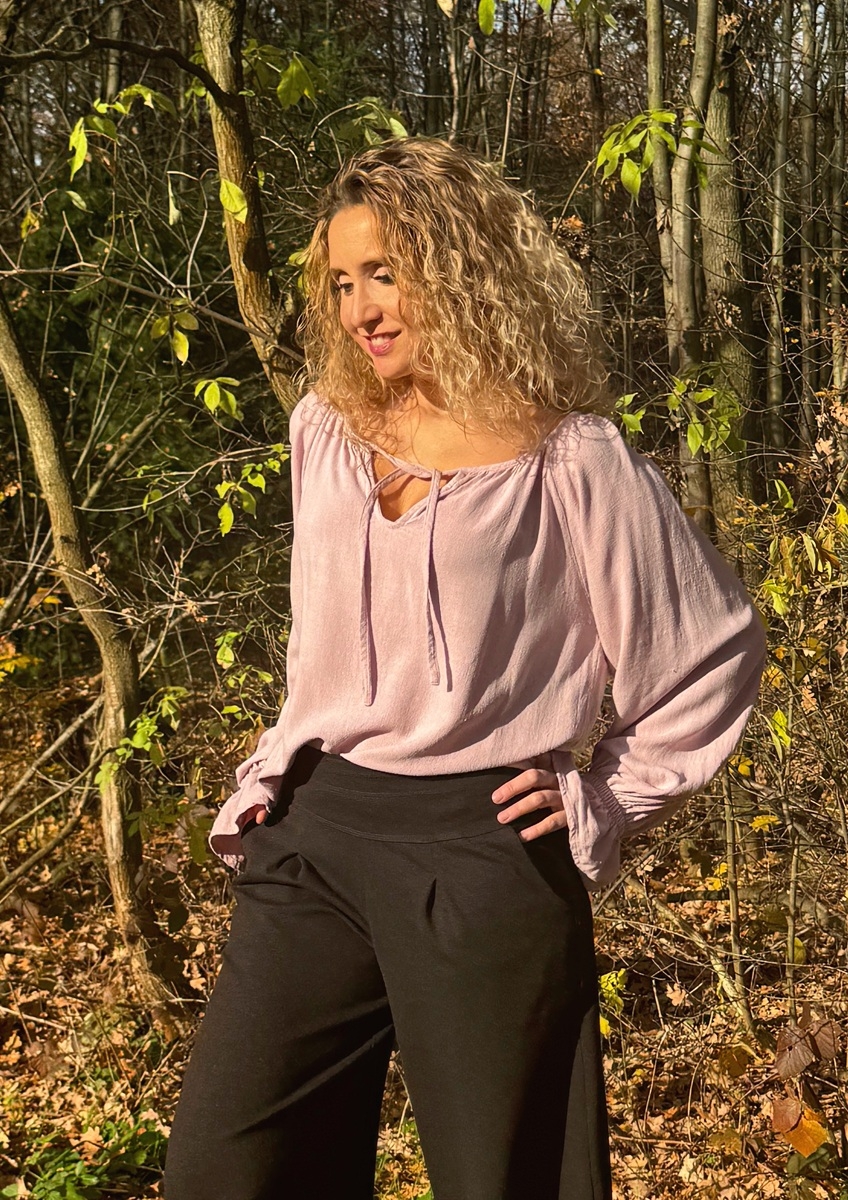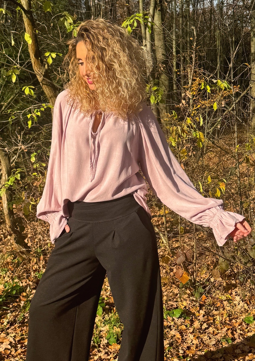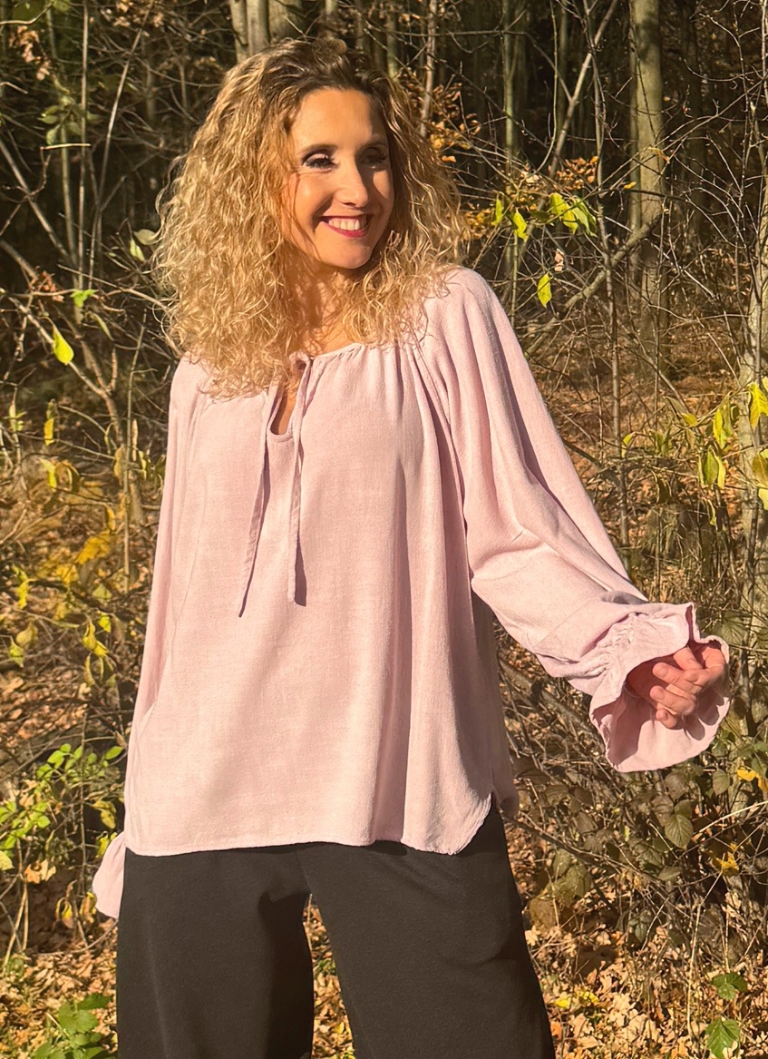 Volná tunika s dlouhými rukávy (stažené do gumičky) je ušitá z luxusního plandavého a měkkého materiálu viskóza 78% a len 22%.