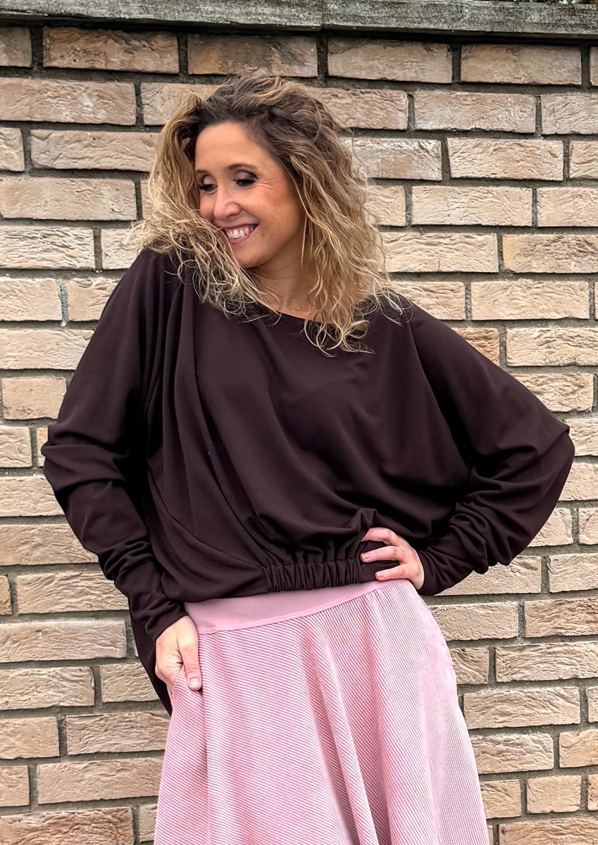 Má dlouhé rukávy se všitými nátepníky. Ne předním díle je v pase zdobený nařasením do široké gumy. Délka se mírně svažuje dozadu.