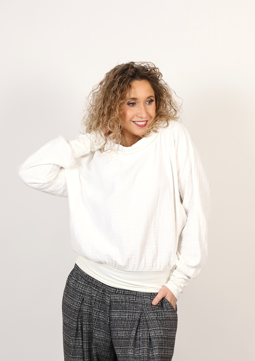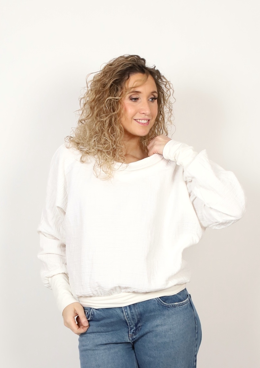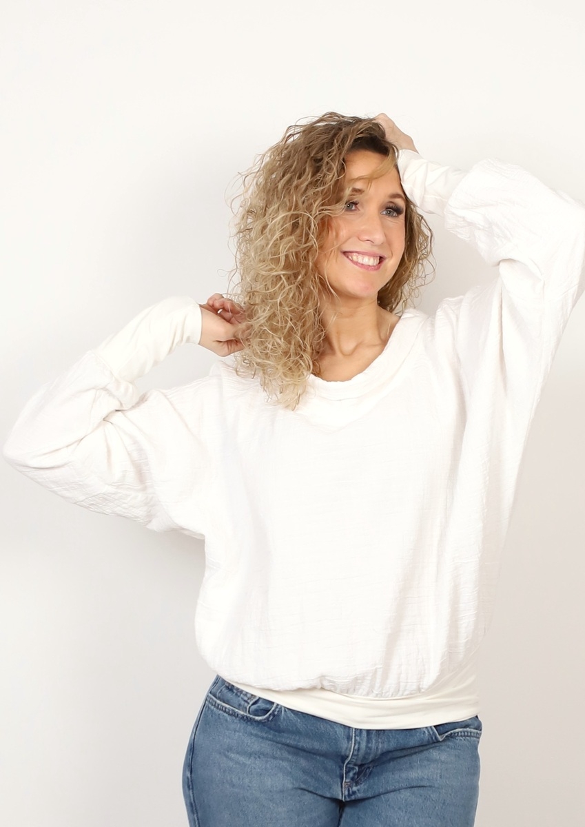 Tunika  s dlouhým rukávem je ušitá ze zdvojené  bavlněné gázoviny. V pase je stažený do širokého lemu.