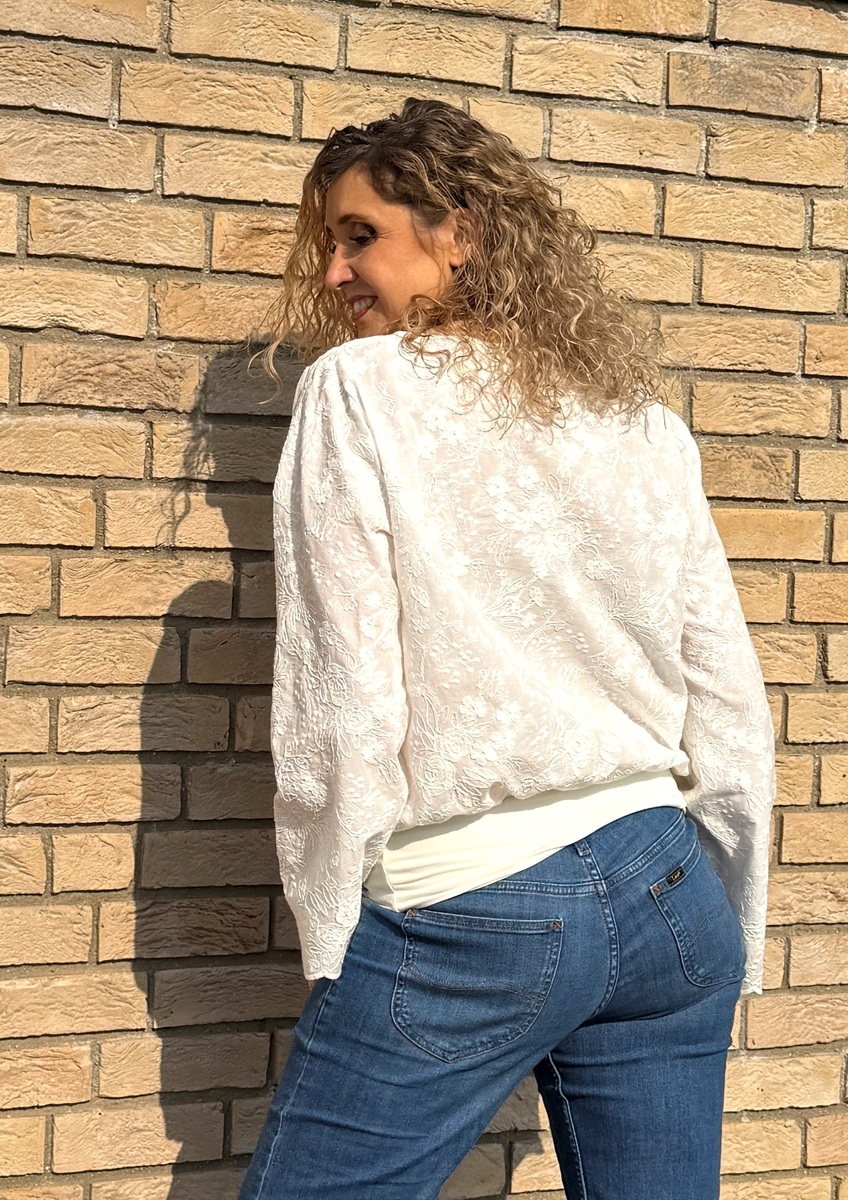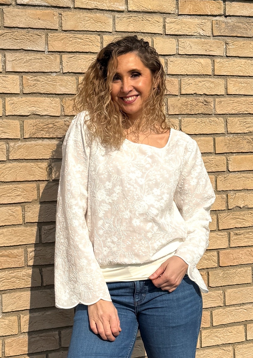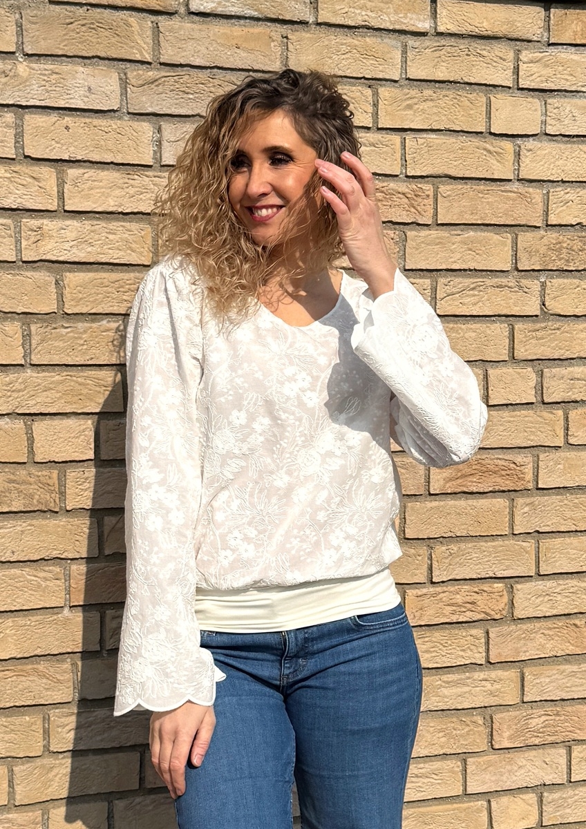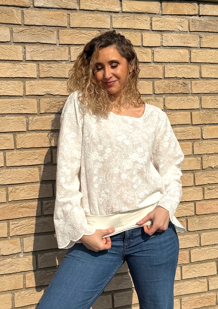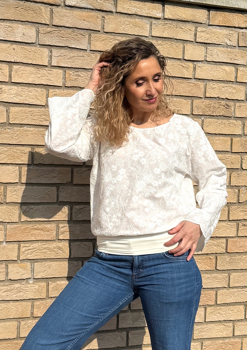 Tričko volného střihu, které má spodní díl stažený do širokého pásku je ušité z bavlněné madeiry. S dlouhým rukávem.