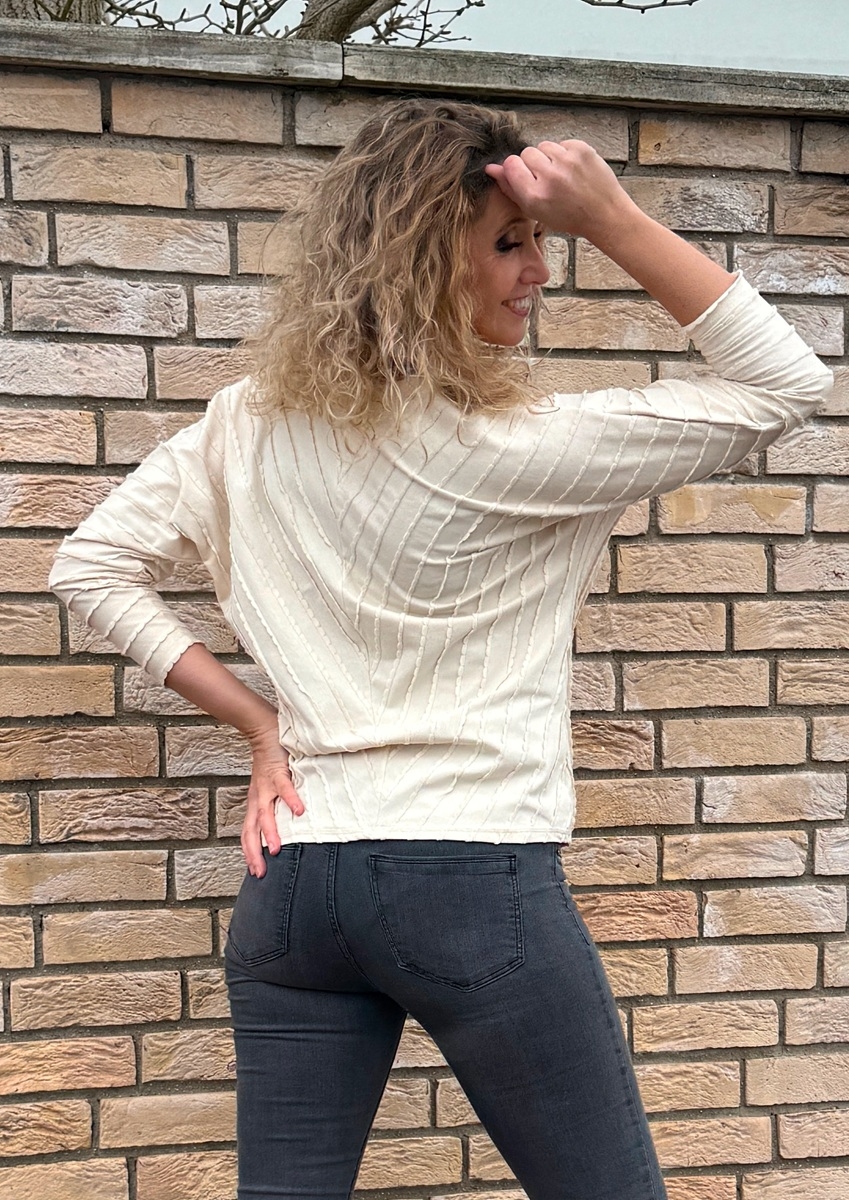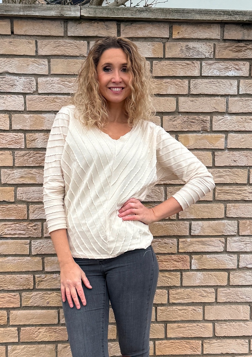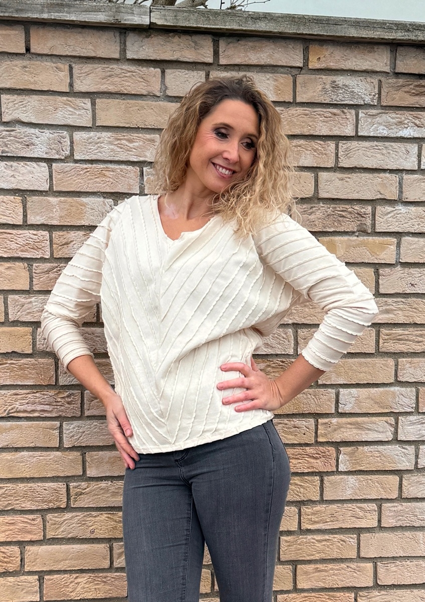 Tunika volného netopýřího střihu s výstřihem do V je ušitá z příjemného bavlněného upletu (95% bavlna/5%elastan)  s plastickým vzorem. Rukávy jsou ve 3/4 délce.