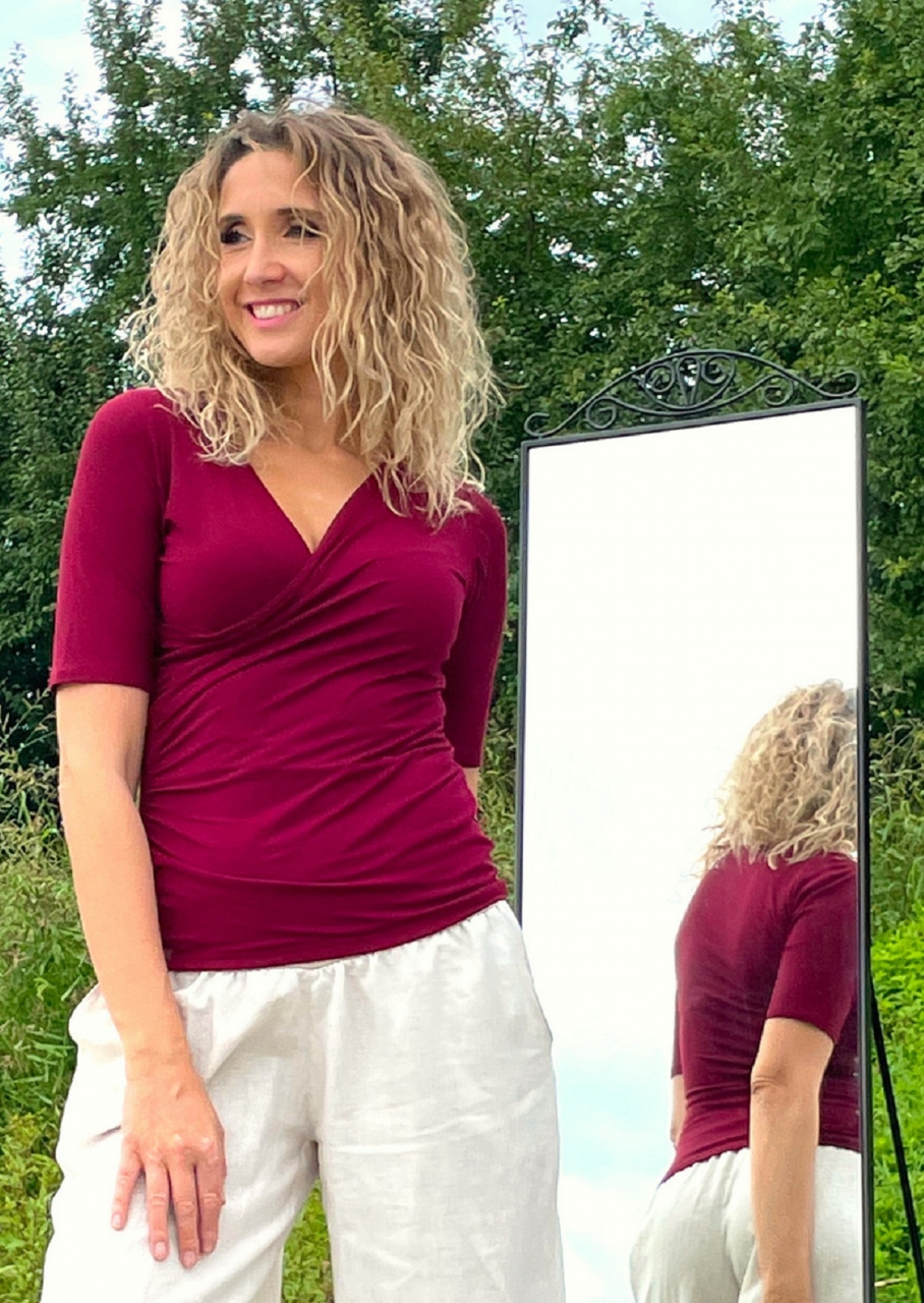Tričko s překříženým a nařaseným předním dílem, ušité z úpletu  viskóza/elastan. Výstřih se může libovolně upravovat na uzavřenější nebo otevřenější. Také v dalších barvách.