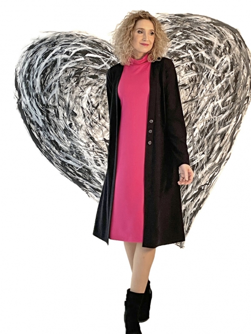 Dlouhý kardigan z úpletu viskóza/polyester/elastan. Je mírně projmutý, v pase je sedýlko střižené dokulata. Vepředu jsou malé kapsičky.  Zapíná se na 3 knoflíky.