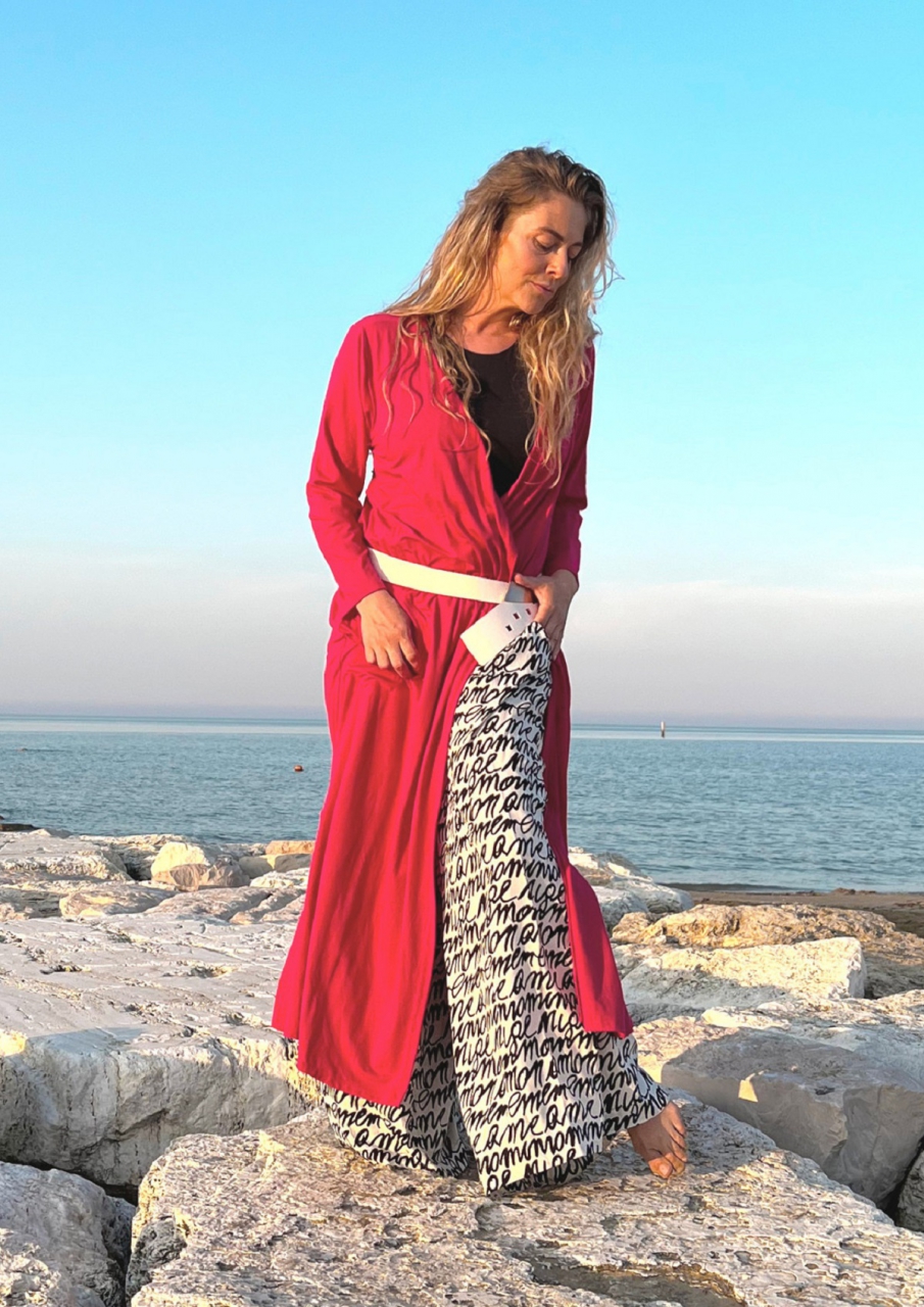 Volný kardigan je ušitý z úpletu viskóza/elastan . Může se nosit volně nebo přepásaný páskem. V bocích jsou kapsy. Rukáv ve 3/4 délce.