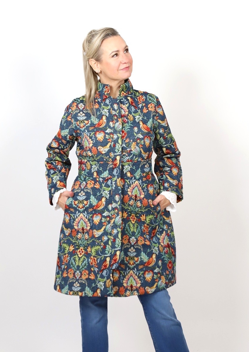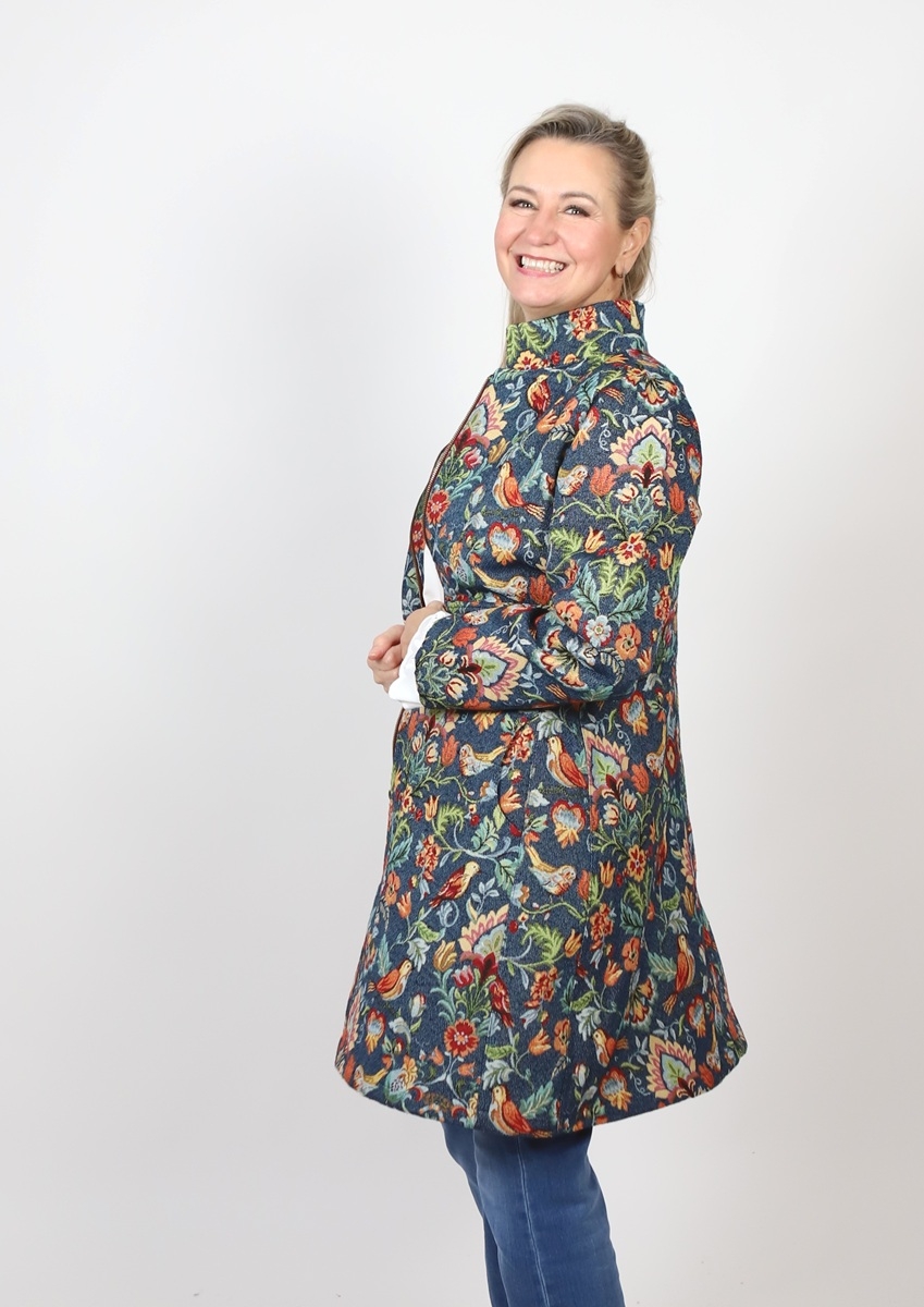 Kabátek je ušitý z žakárového materiálu s přírodním vzorem. Horní část je stažená do pásku, sukně je zvonová, v bočních švech jsou kapsy. Stojáčkový límec. (50%ba/50%Pes)