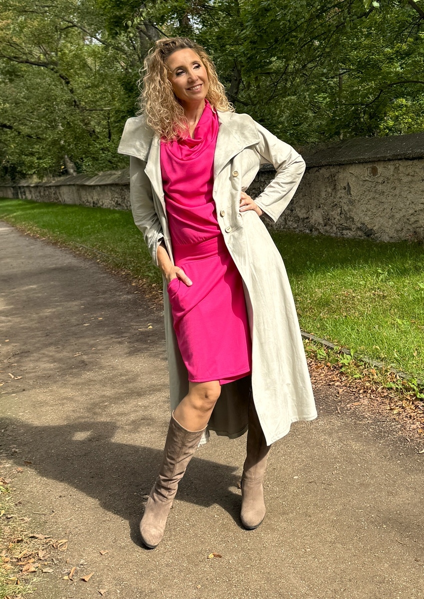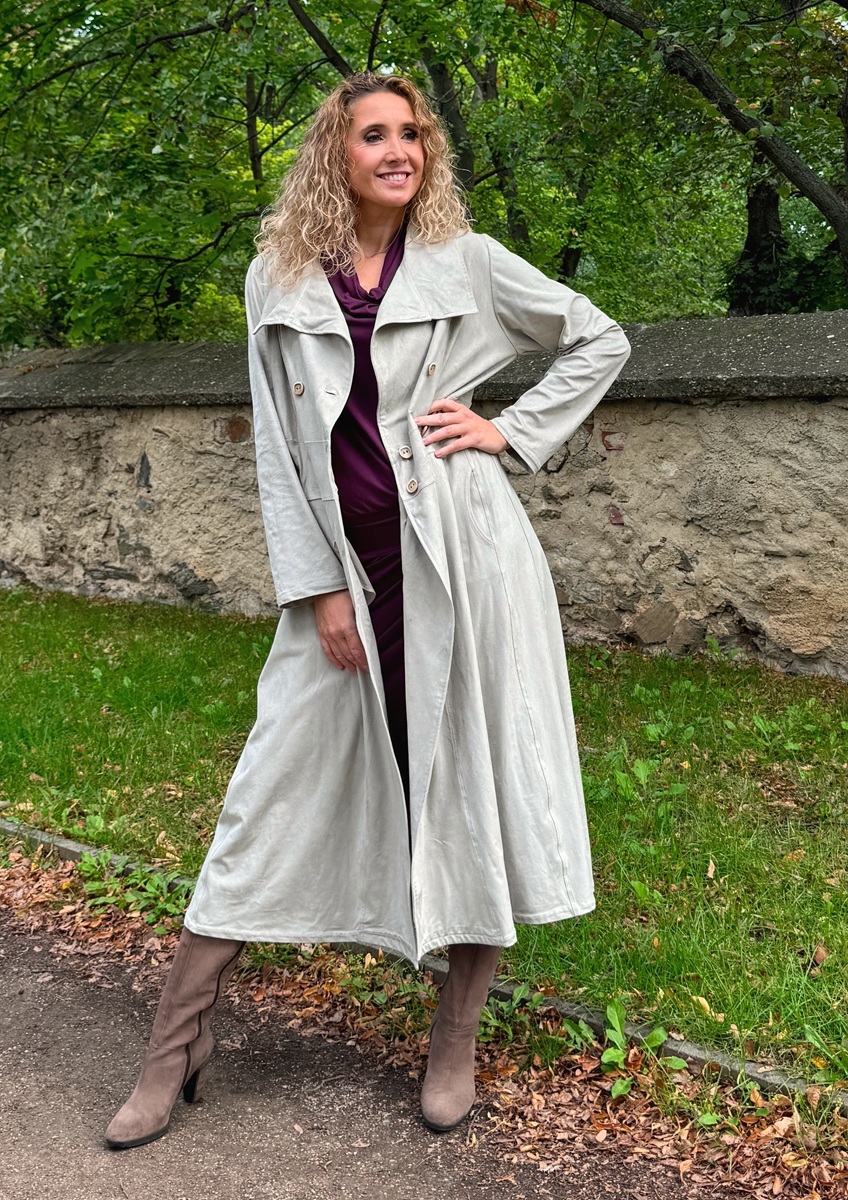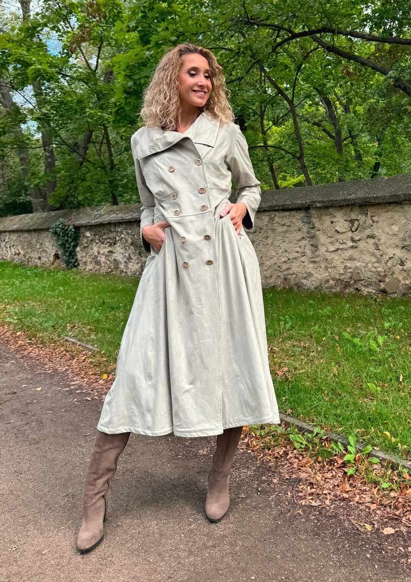 Kabátek je ušitý z jemného splývavého syntetického semiše. Horní část je mírně stažená do pásku, sukně je zvonová a zapínání je dvouřadové, bez podšívky.