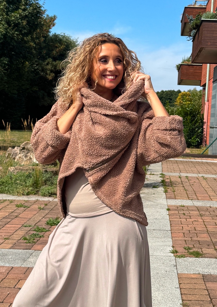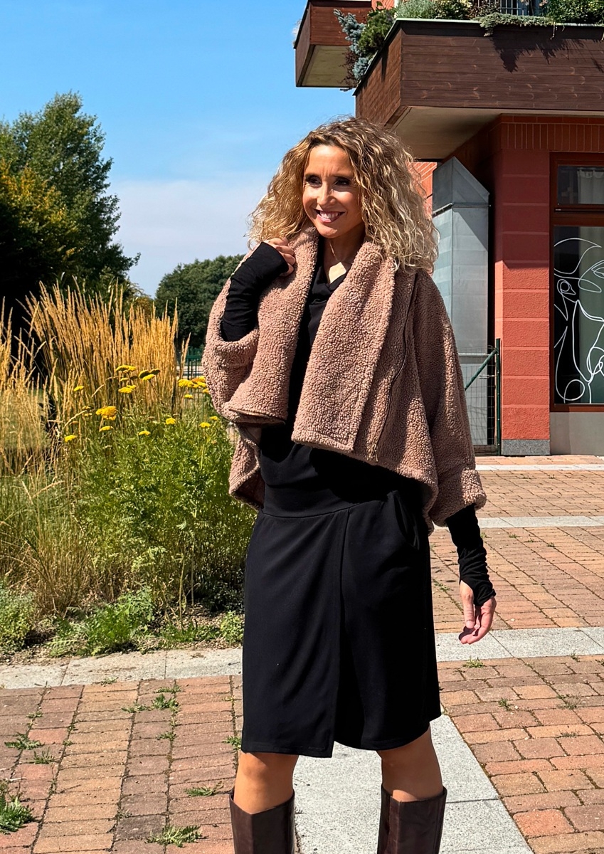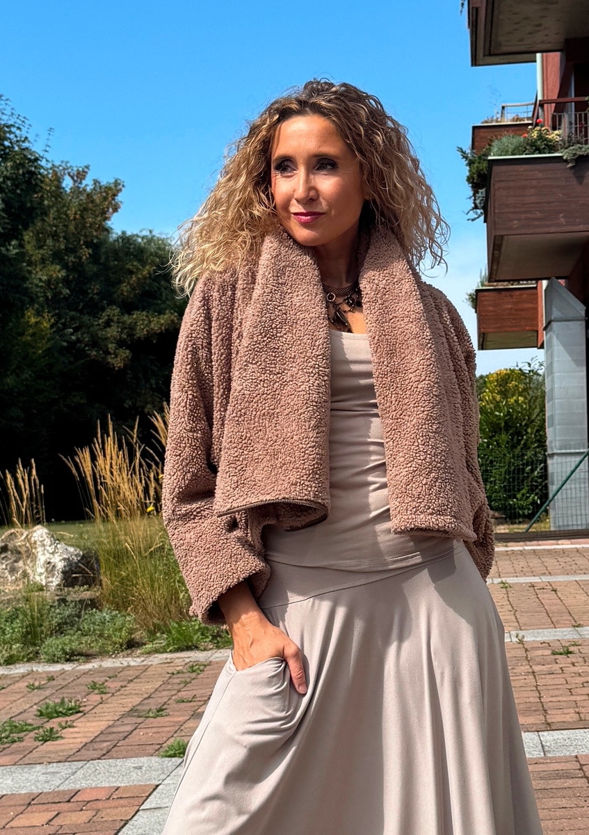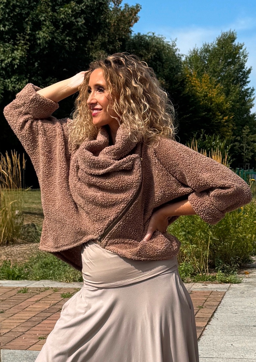Kabátek má široký límec a zapínání na zip. Rukávy jsou v hodinkové délce s možností ohrnutí .
