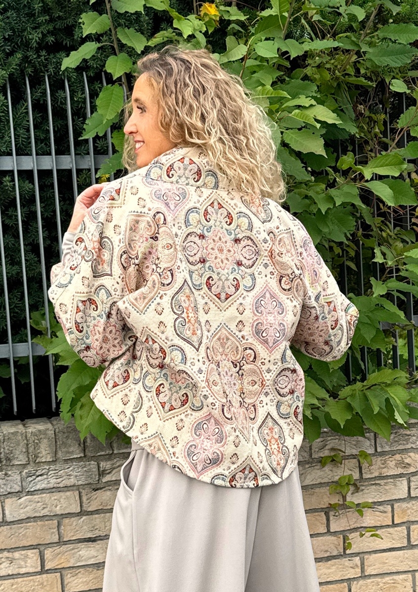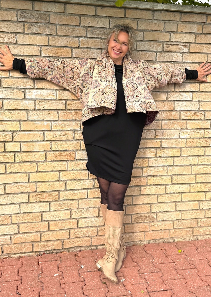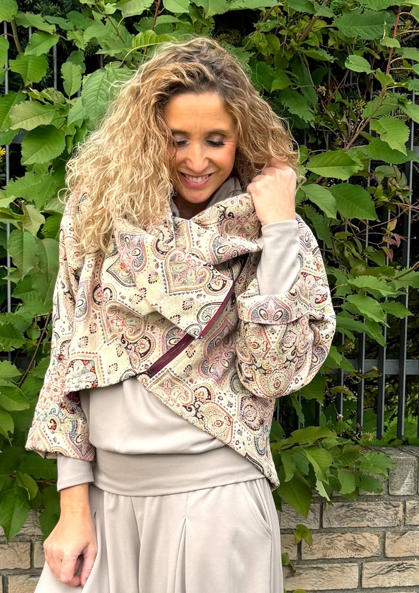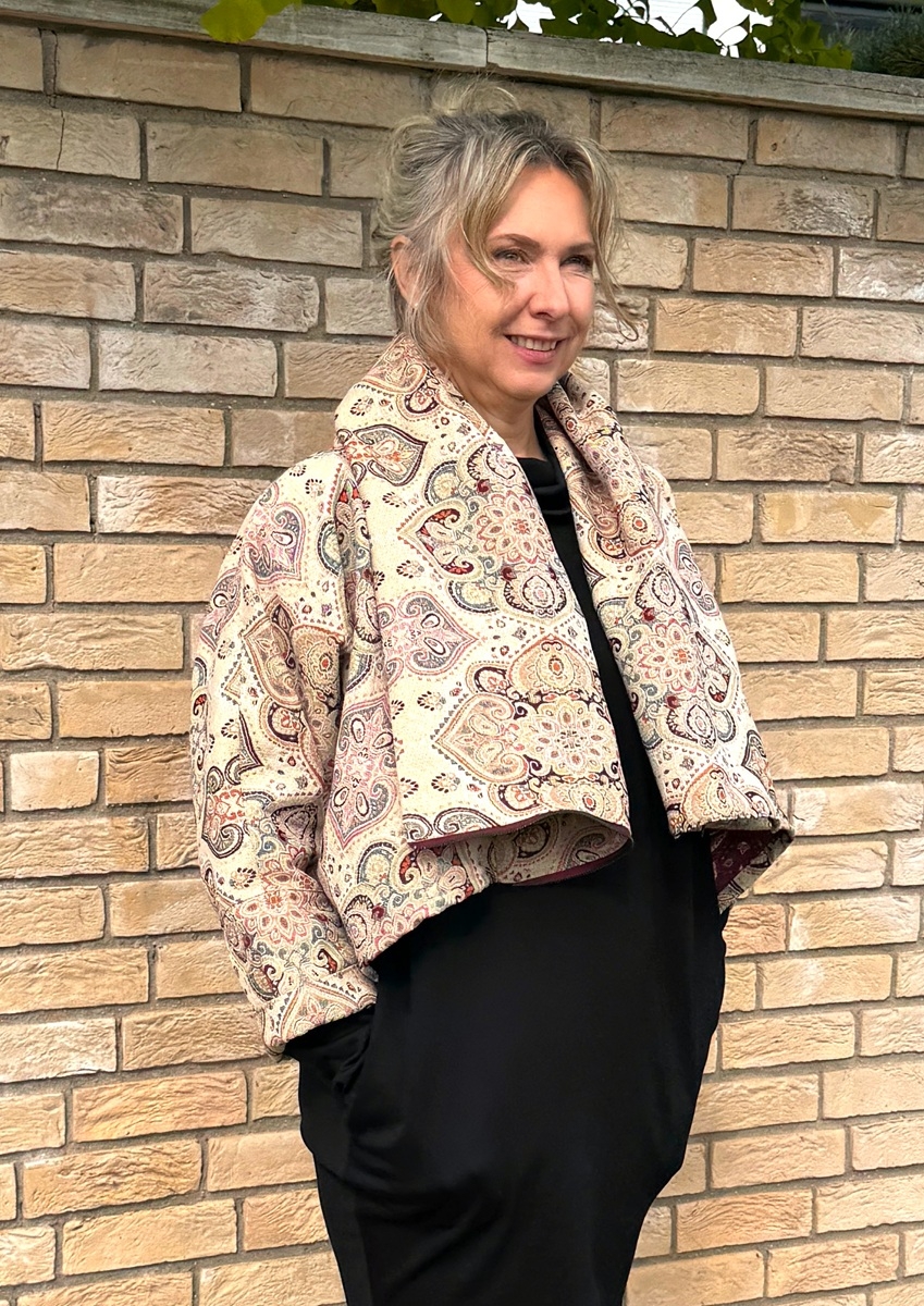 Kabátek je ušitý z gobelínové látky (50%bavlna/50%%pes).