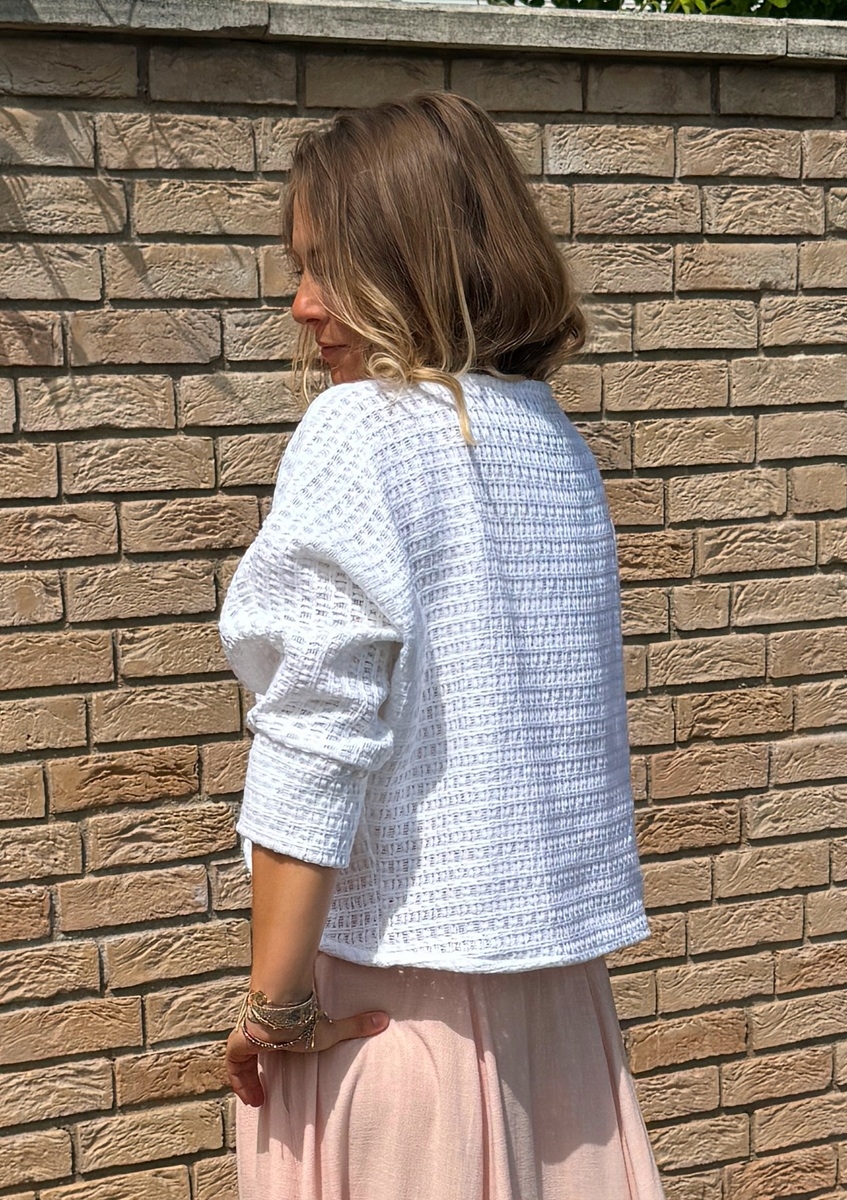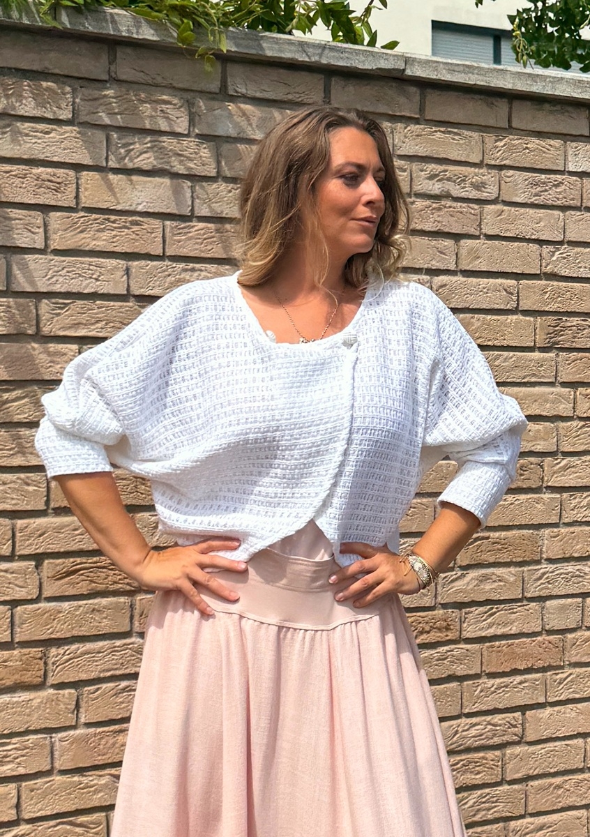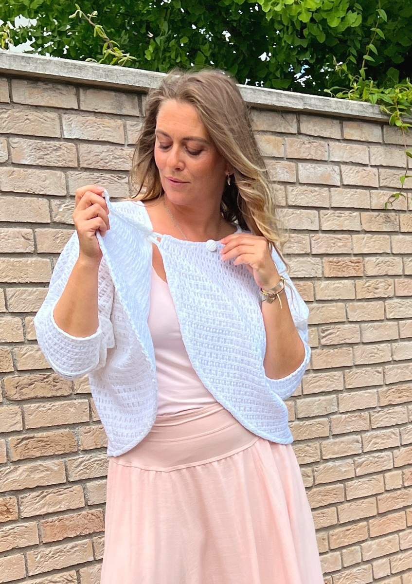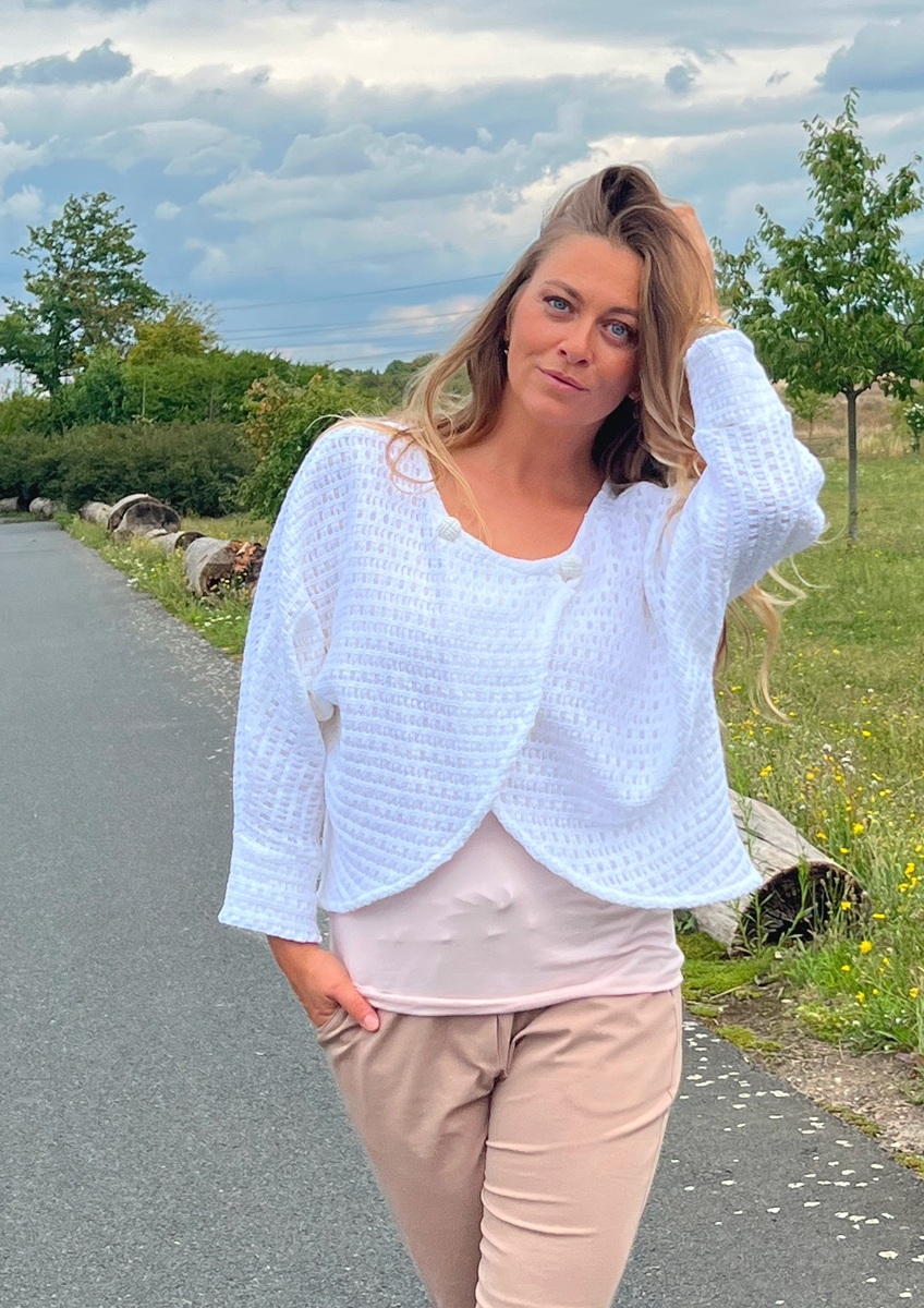 Kardigánek je ušitý z bavlněné tkaniny hrubší struktury. Má netopýří střih. Oblé přední díly jsou přeložené a zapínají se na dva knoflíky.
