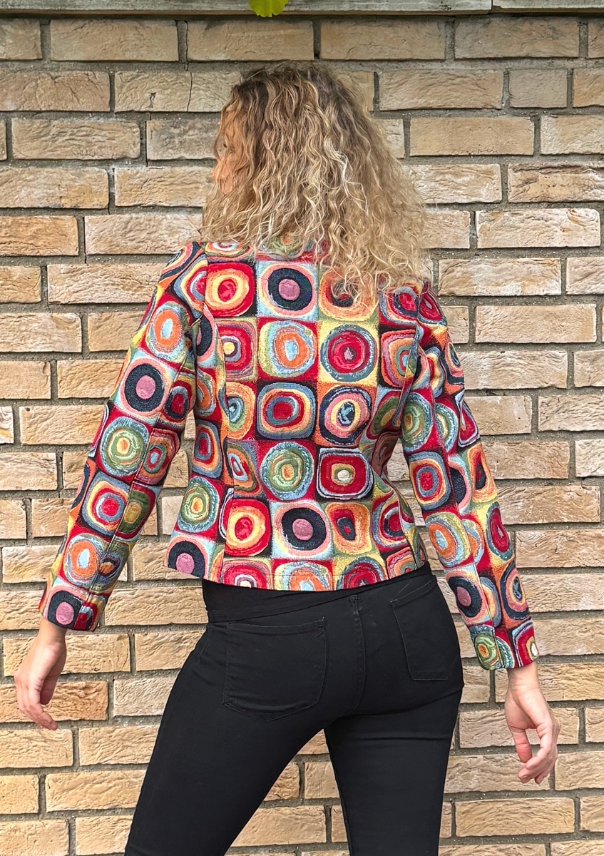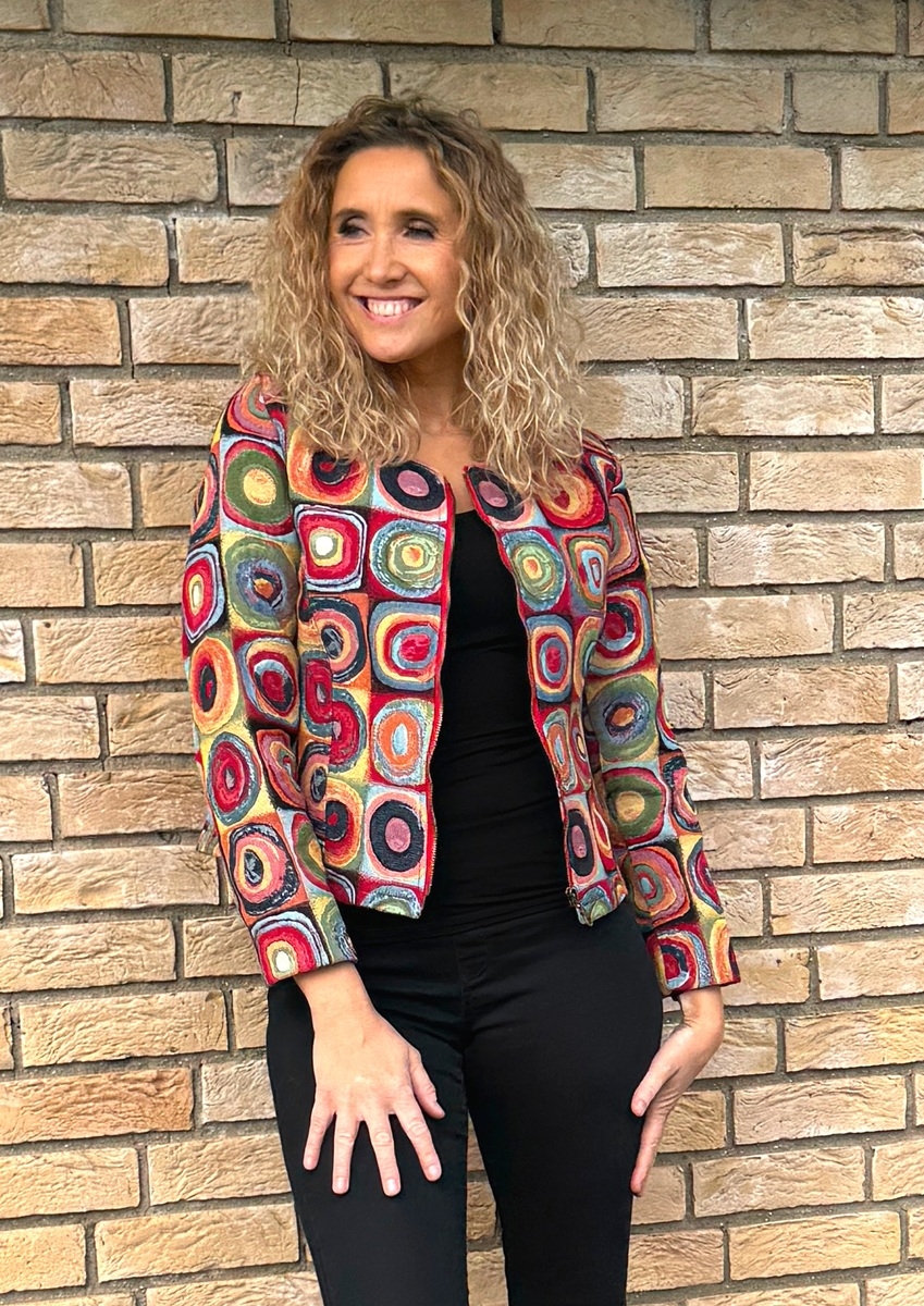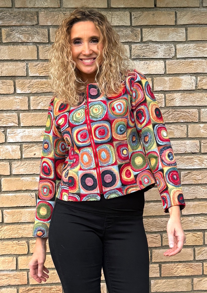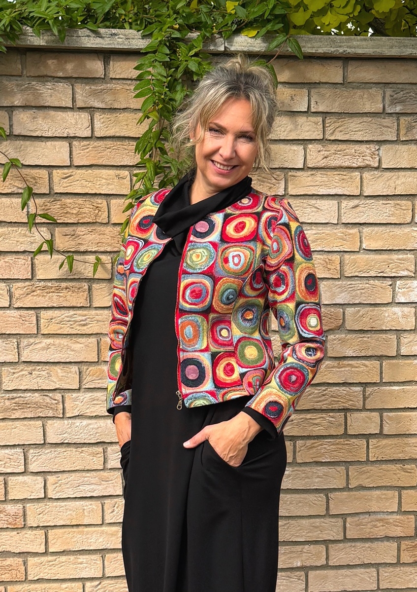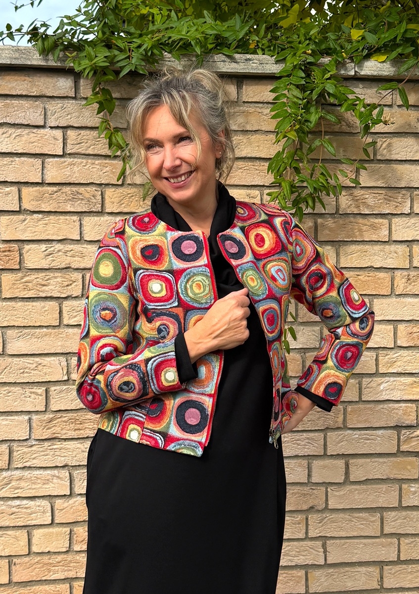 Má klasický projmutý střih, kulatý výstřih a zapínání na zip.