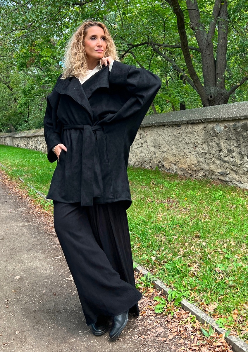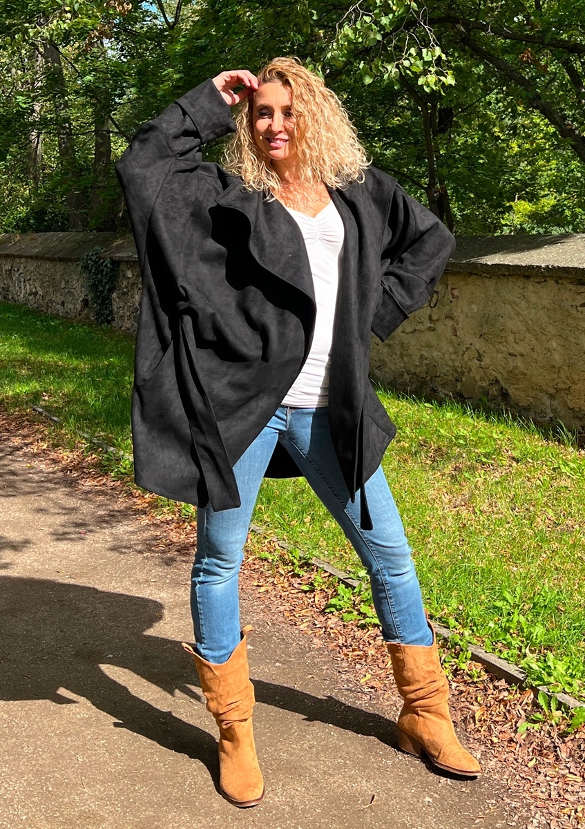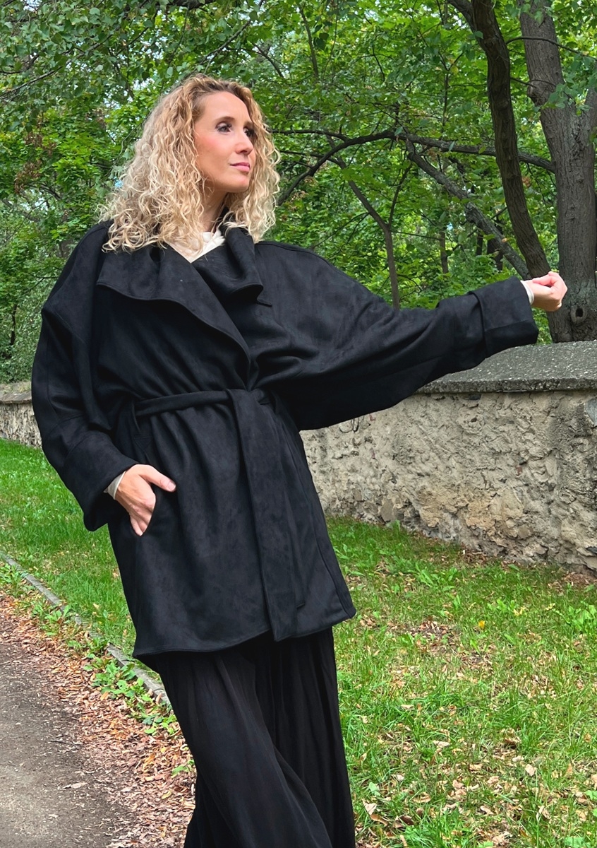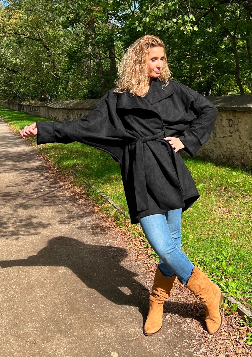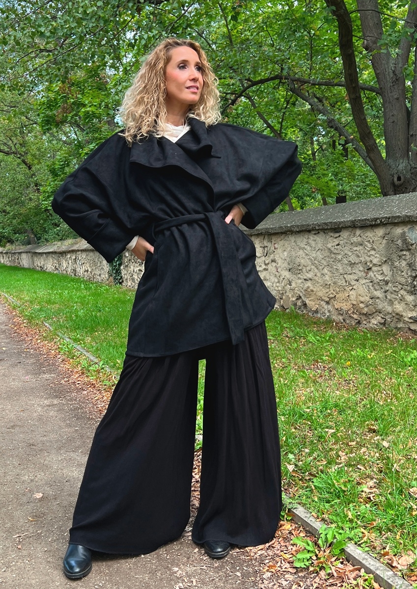 Kabát má netopýří střih. Zavazuje se pouze ve předu, záda zůstávají volná.