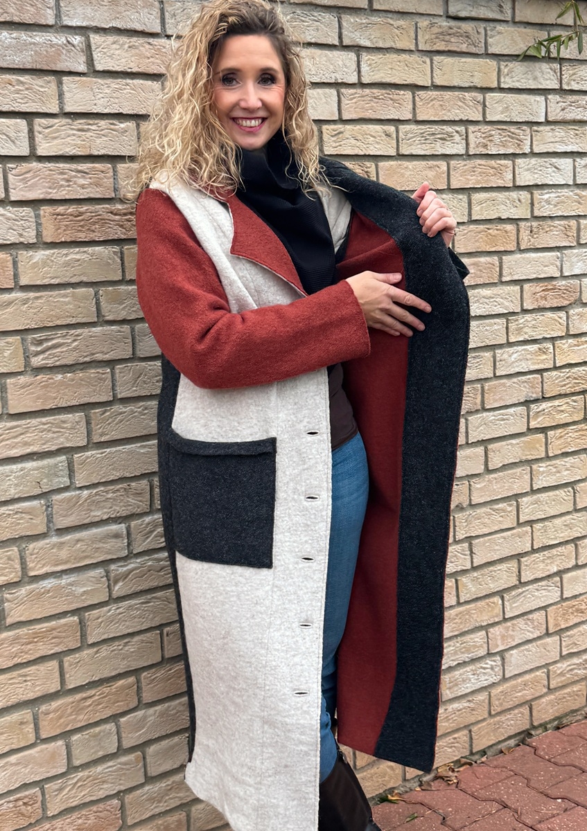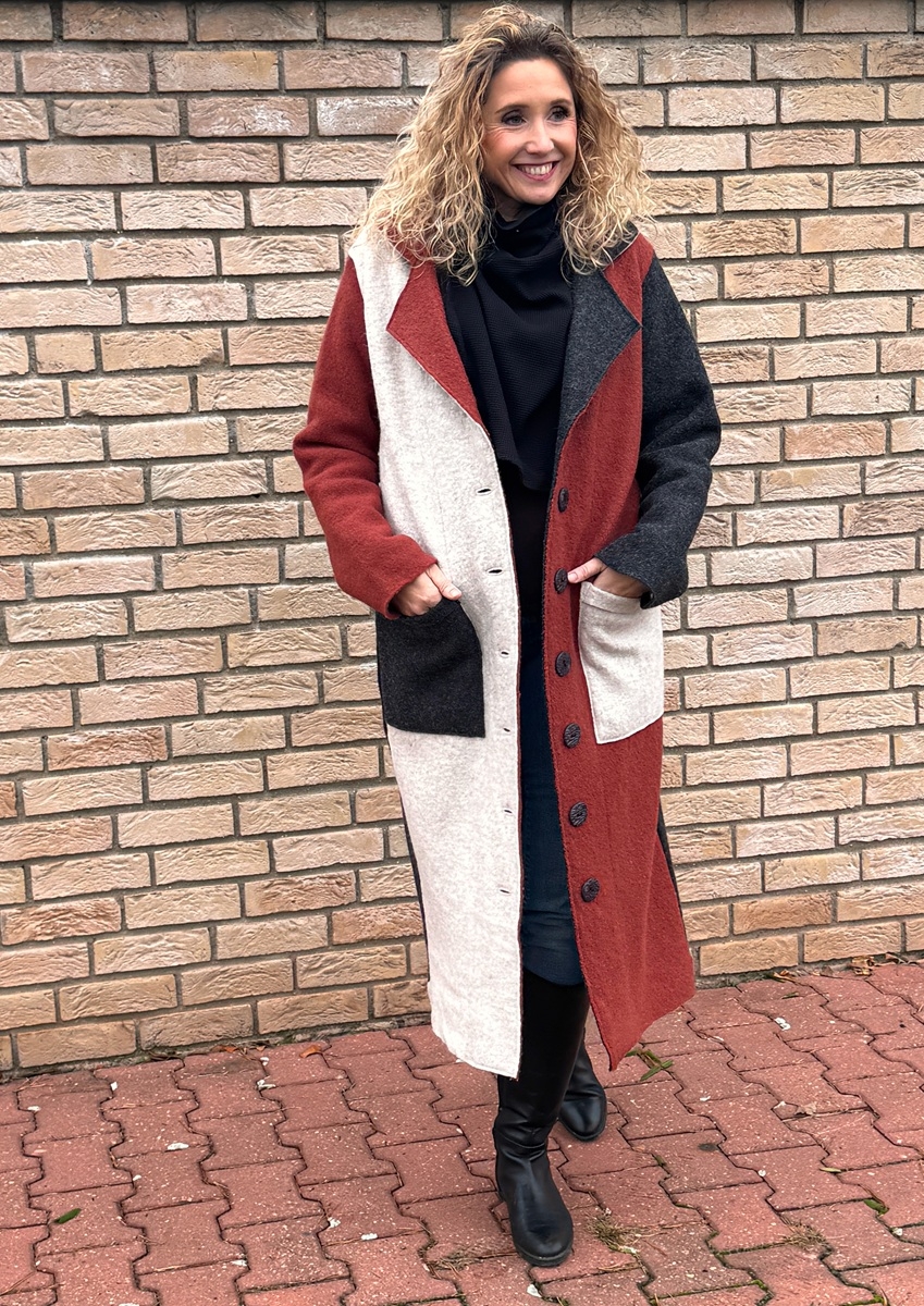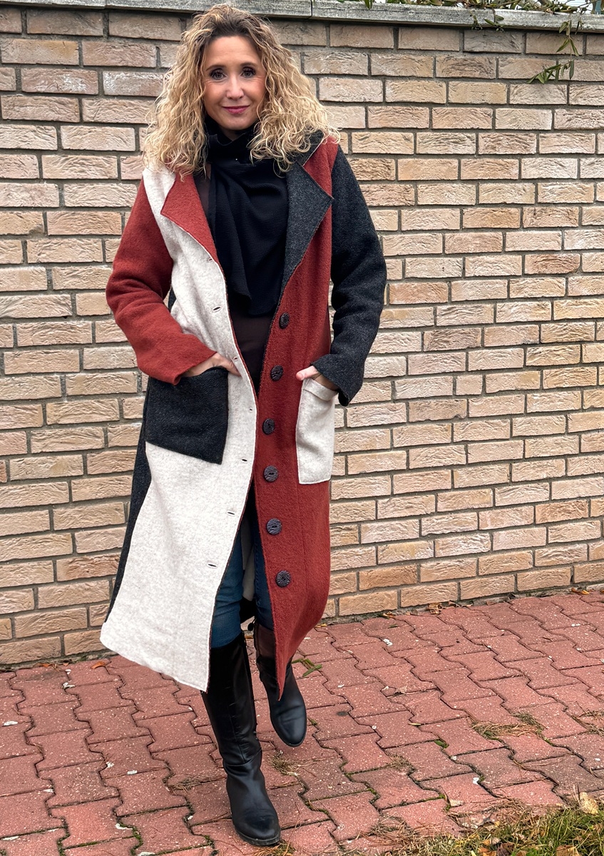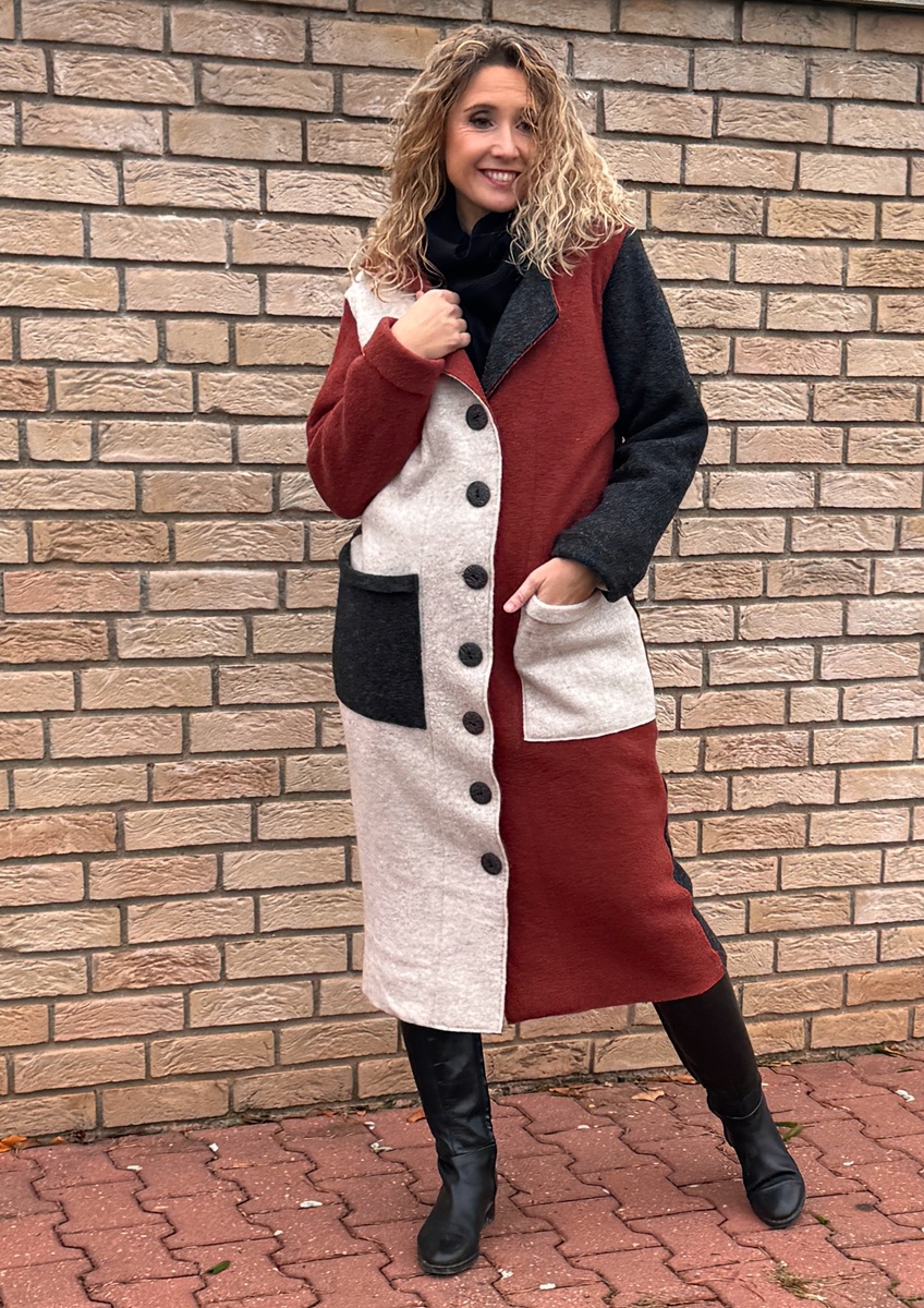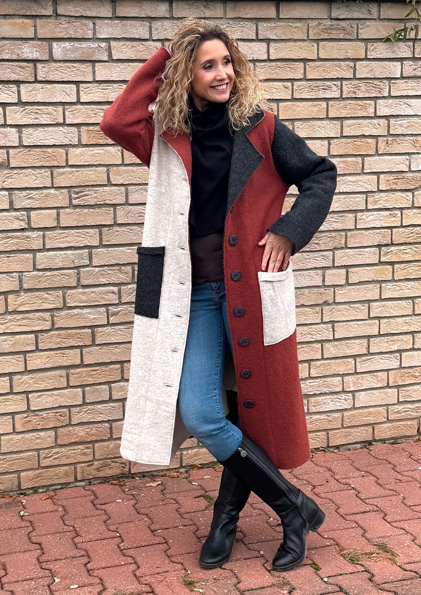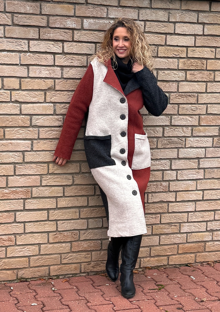 Kabát je ušitý z kabátové pařené vlny, bez podšívky. Střih je rovný a zapínání na knoflíky.