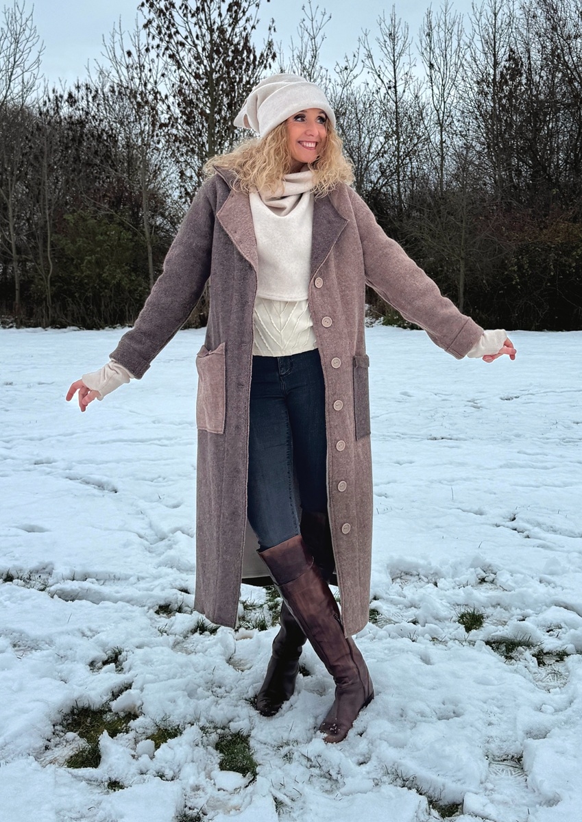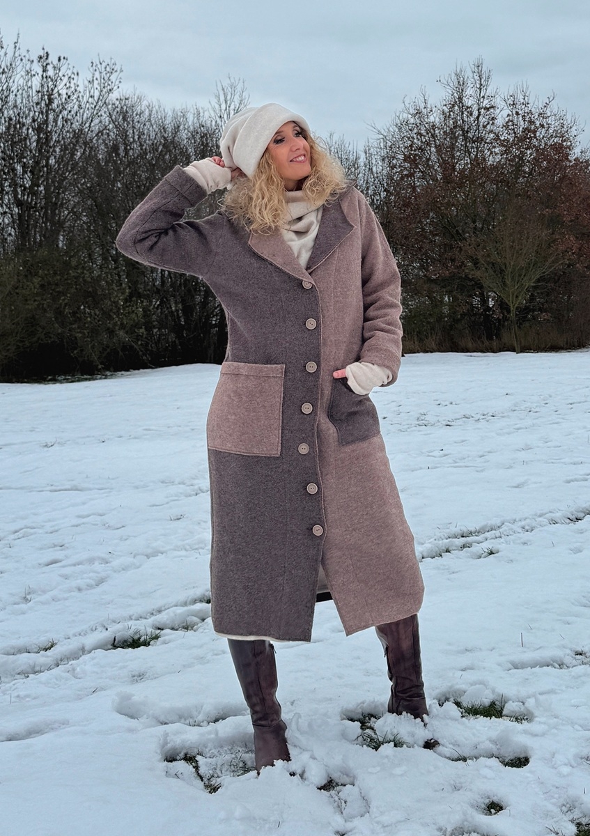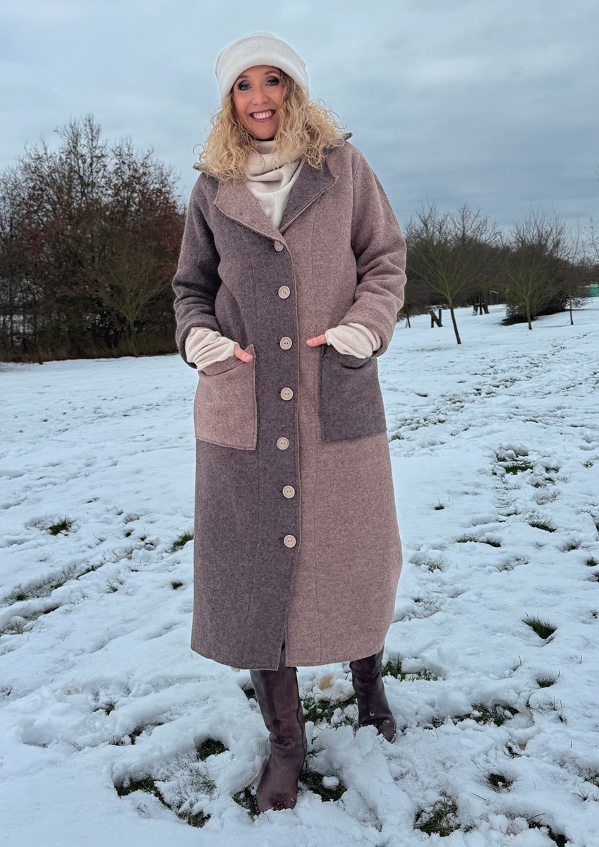 Kabát je ušitý z kabátové pařené vlny, bez podšívky. Střih je rovný a zapínání na knoflíky.