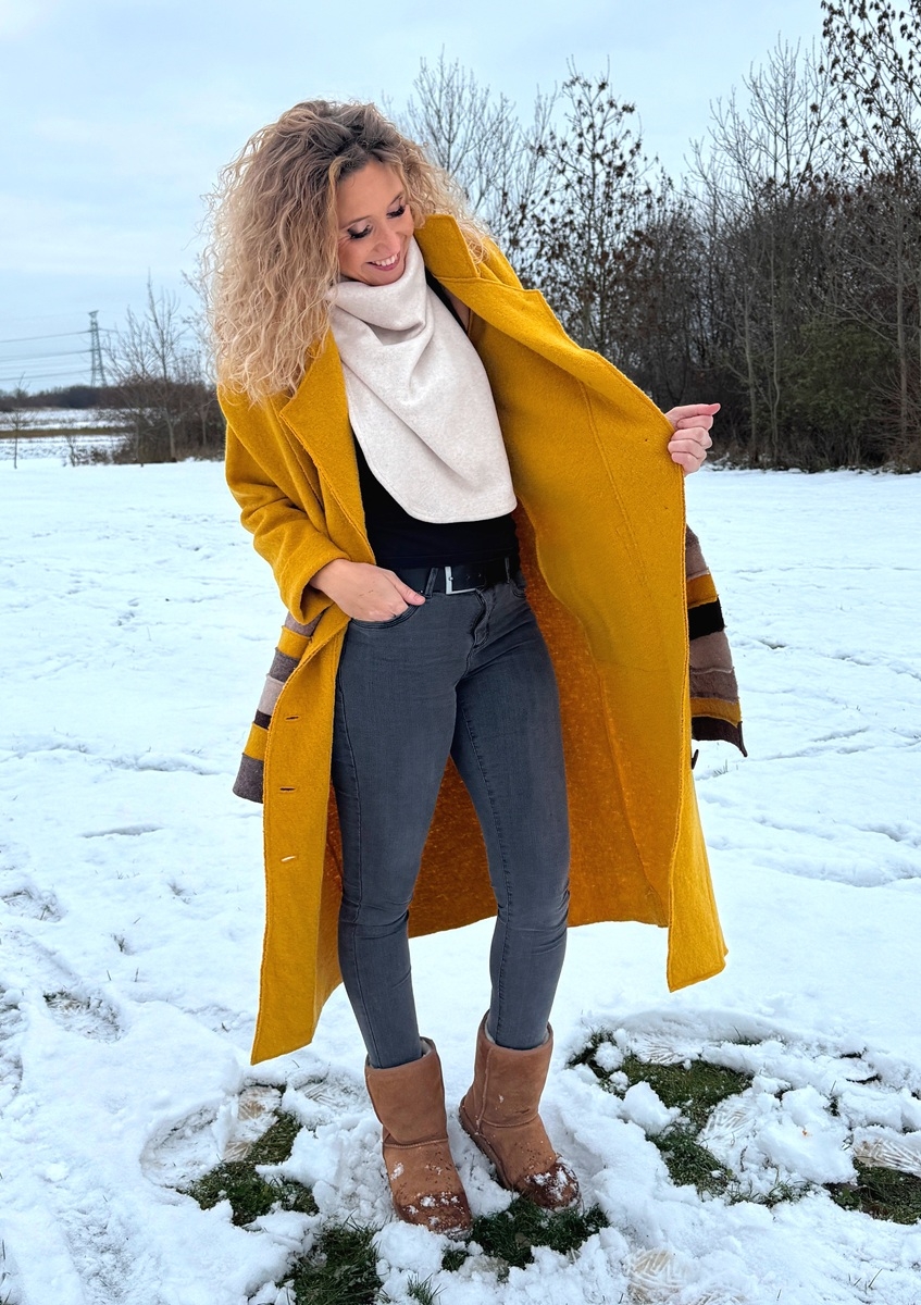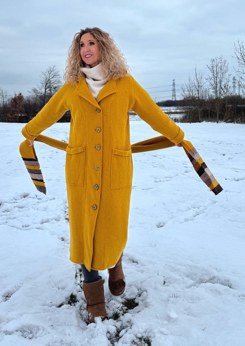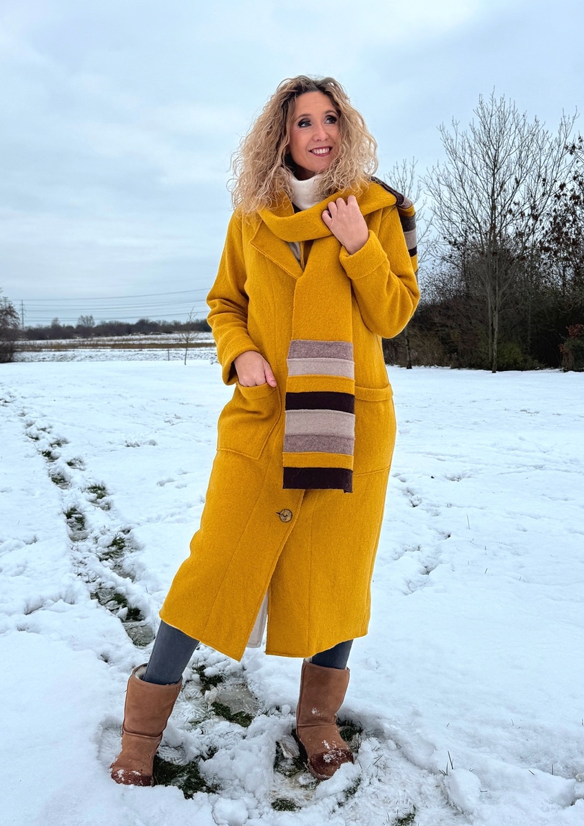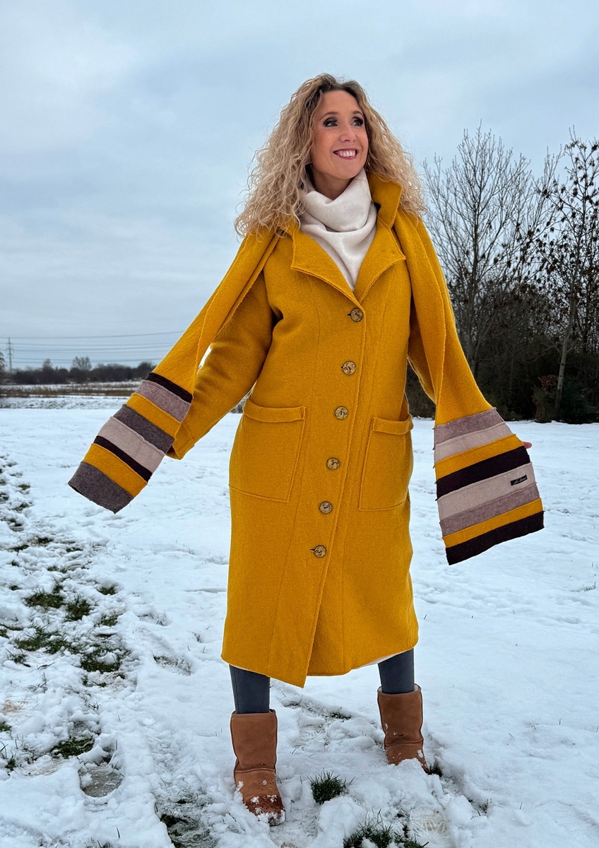 Kabát je ušitý z kabátové pařené vlny, bez podšívky. Střih je rovný a zapínání na knoflíky. Součástí je i ozdobná sešívaná šelá ze stejného materiálu.