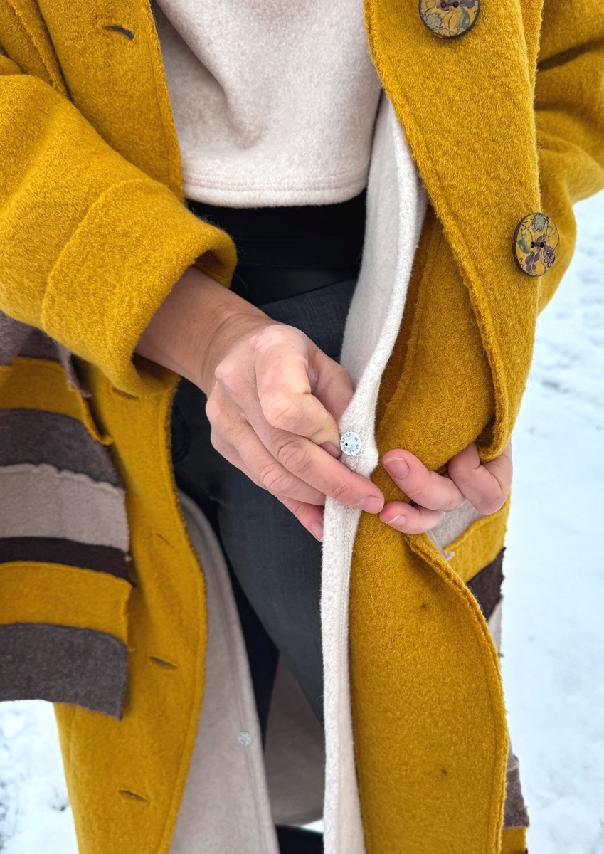 Kabát je ušitý z kabátové pařené vlny, bez podšívky Střih je rovný a zapínání na knoflíky. Součástí je i ozdobná sešívaná šelá ze stejného materiálu.