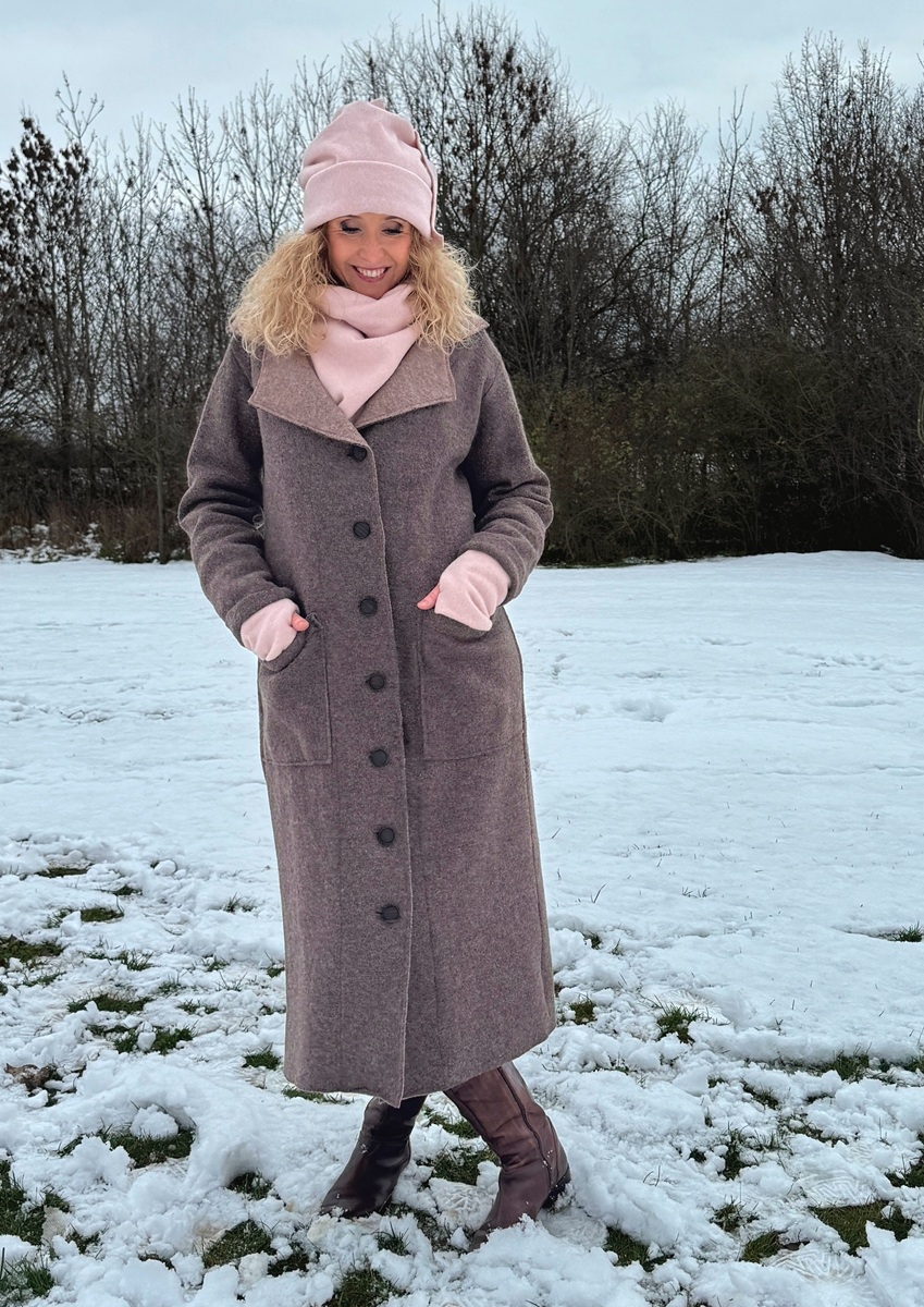 Kabát je ušitý z kabátové pařené vlny, bez podšívky. Střih je rovný a zapínání na knoflíky.