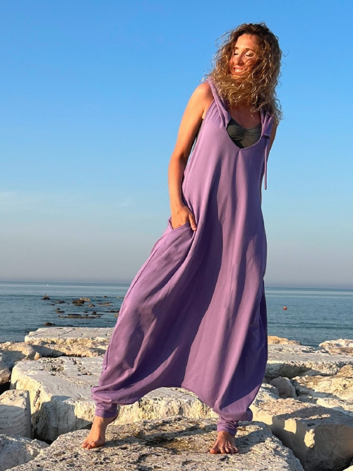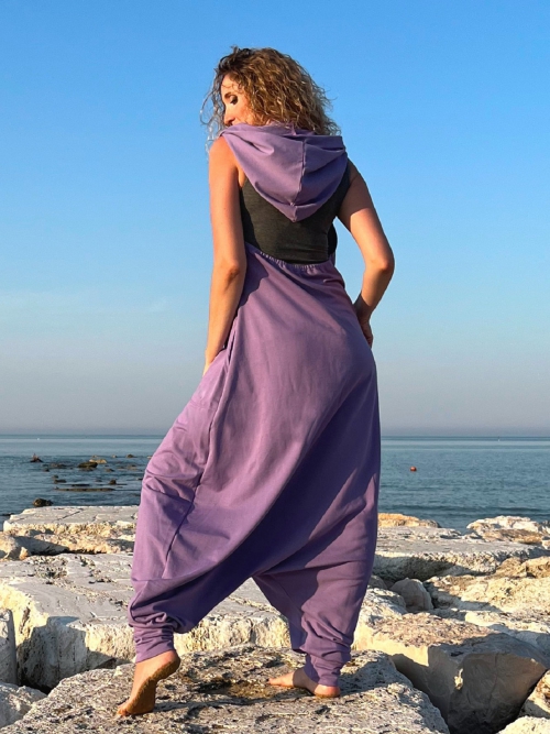 Pohodlný overal z úpletu bavlna/elastan s bočními kapsami. Overal má volná záda a kapuci. Možné je podvléci trikem nebo nosit na holé tělo.