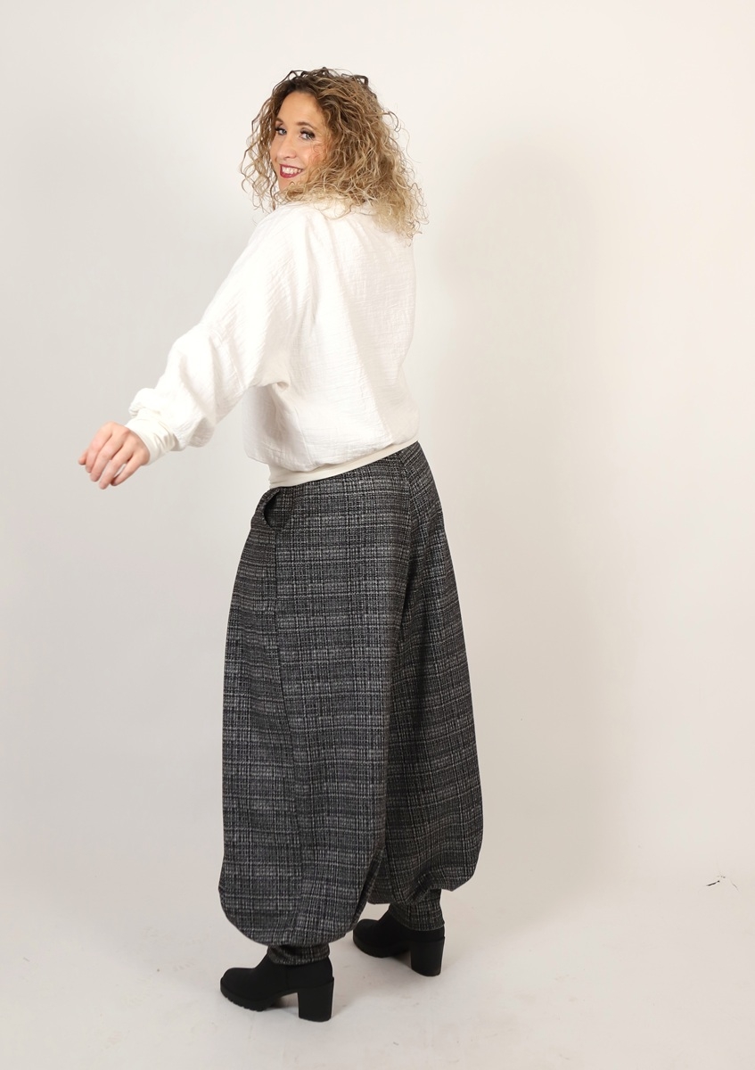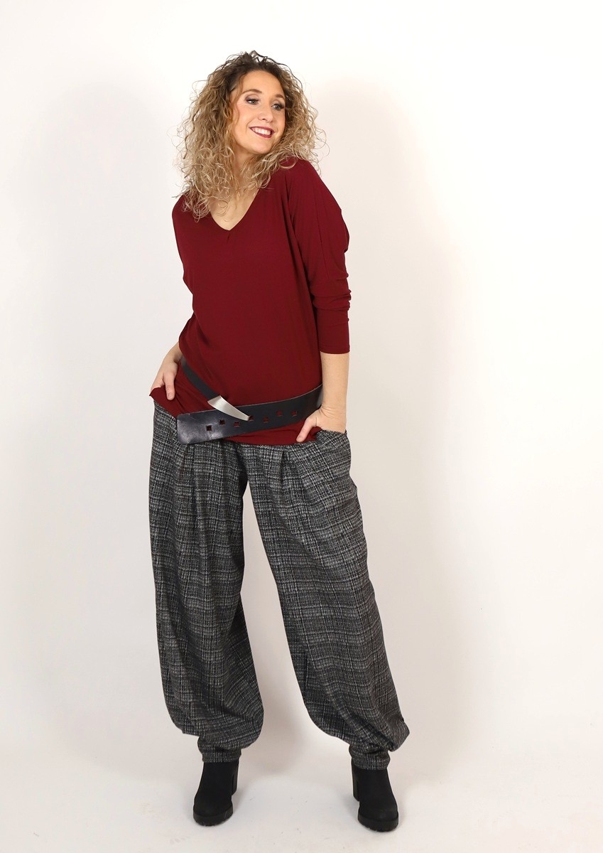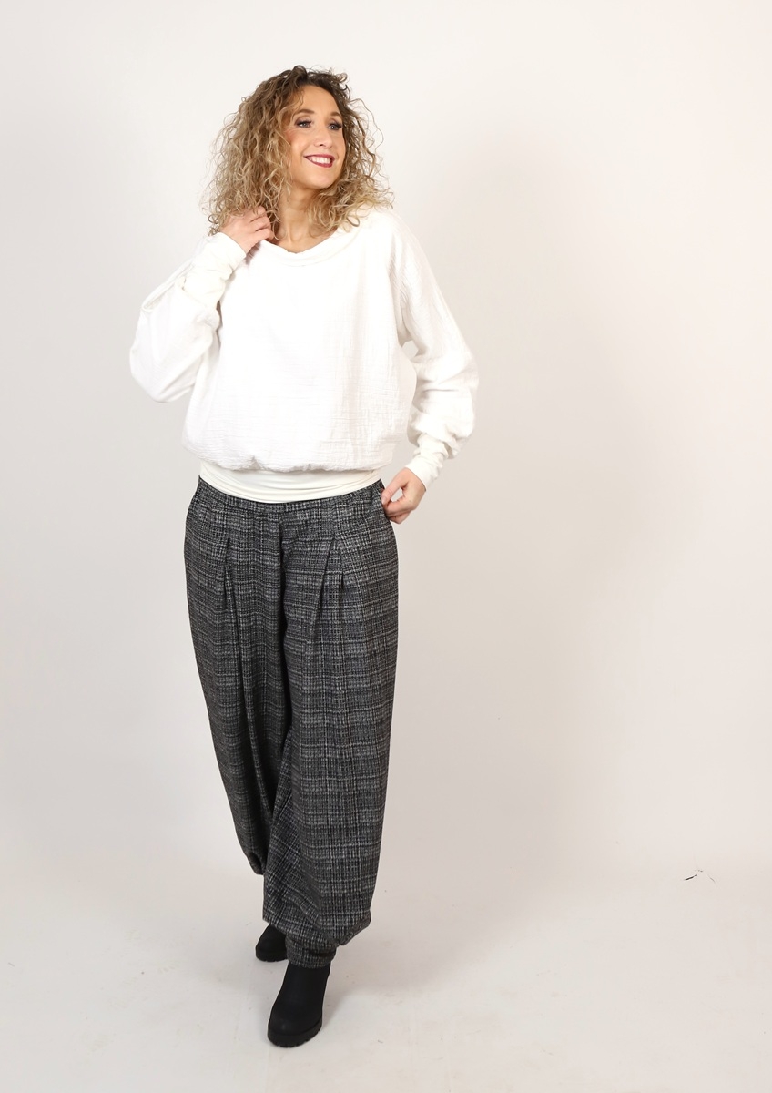 Široké dlouhé kalhoty dole stažené do širokého rantlu. Kalhoty jsou ušité ze středně silného úpletu - materiál (viskóza/polyester/elastan)
