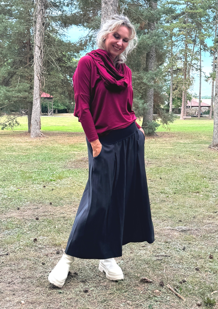 Široké kalhoty do zvonu. Na první pohled působí jako sukně. Kalhoty jsou ušité z černého tencelu.