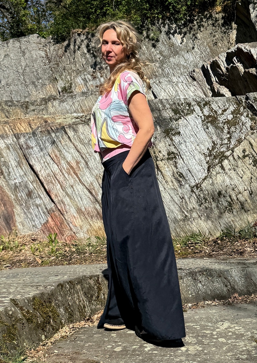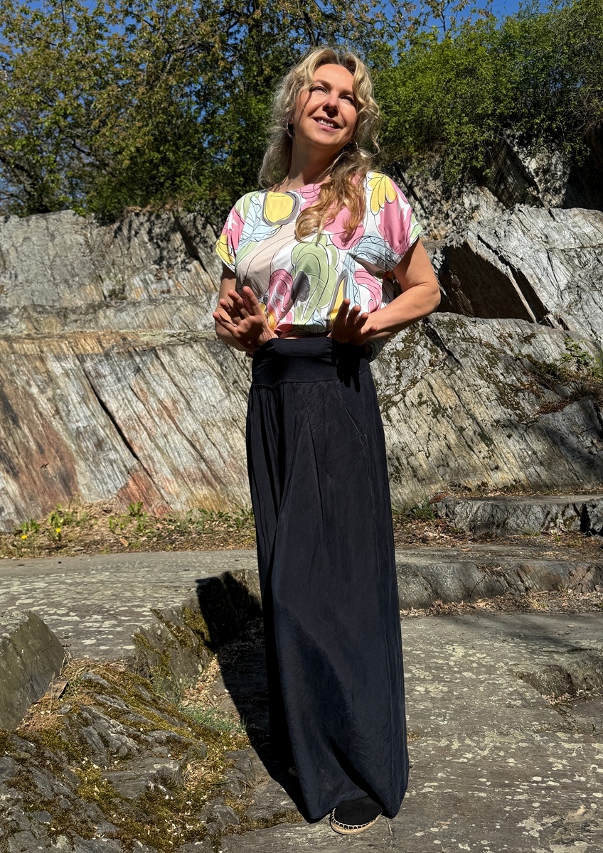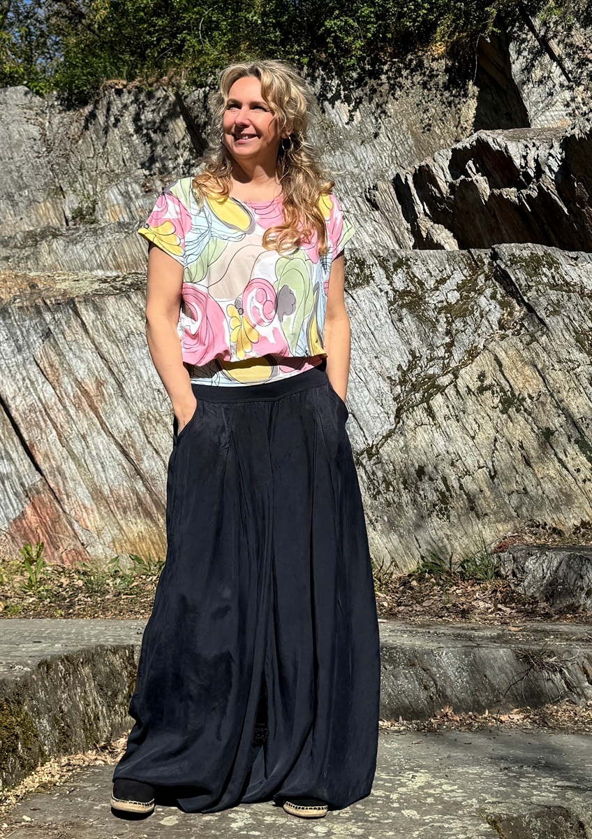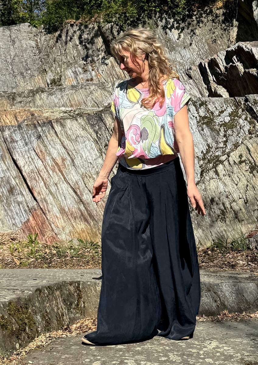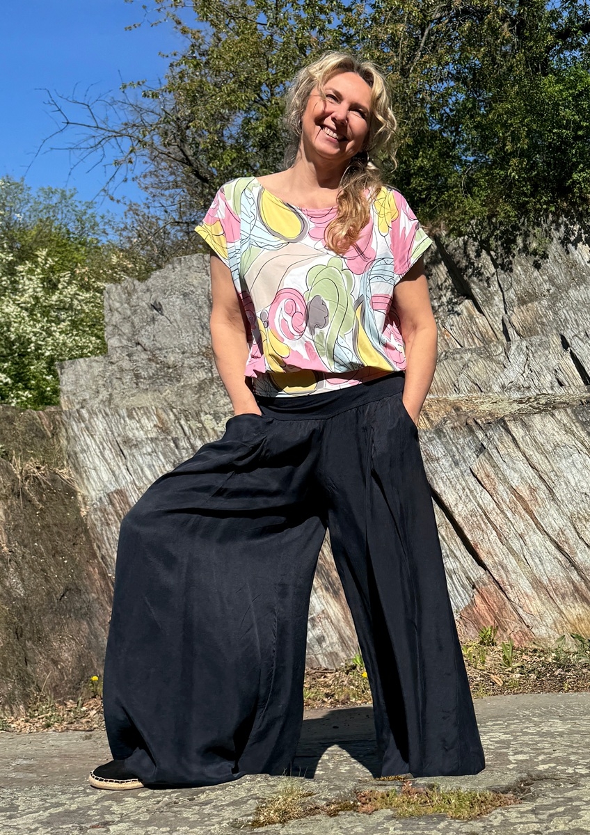 Kalhoty jsou vyrobeny ze 100% viskózy (Tenzel) , lehkého ,vzdušného , rozevlátého, s jemným sametově hedvábným leskem. . V bočních švech jsou kapsy. Pásek je pružný, vyztužený proti vytažení.