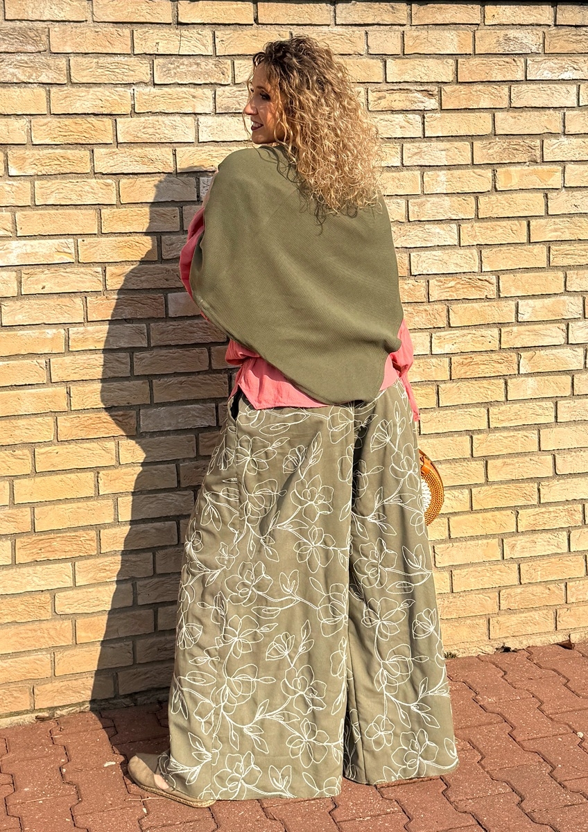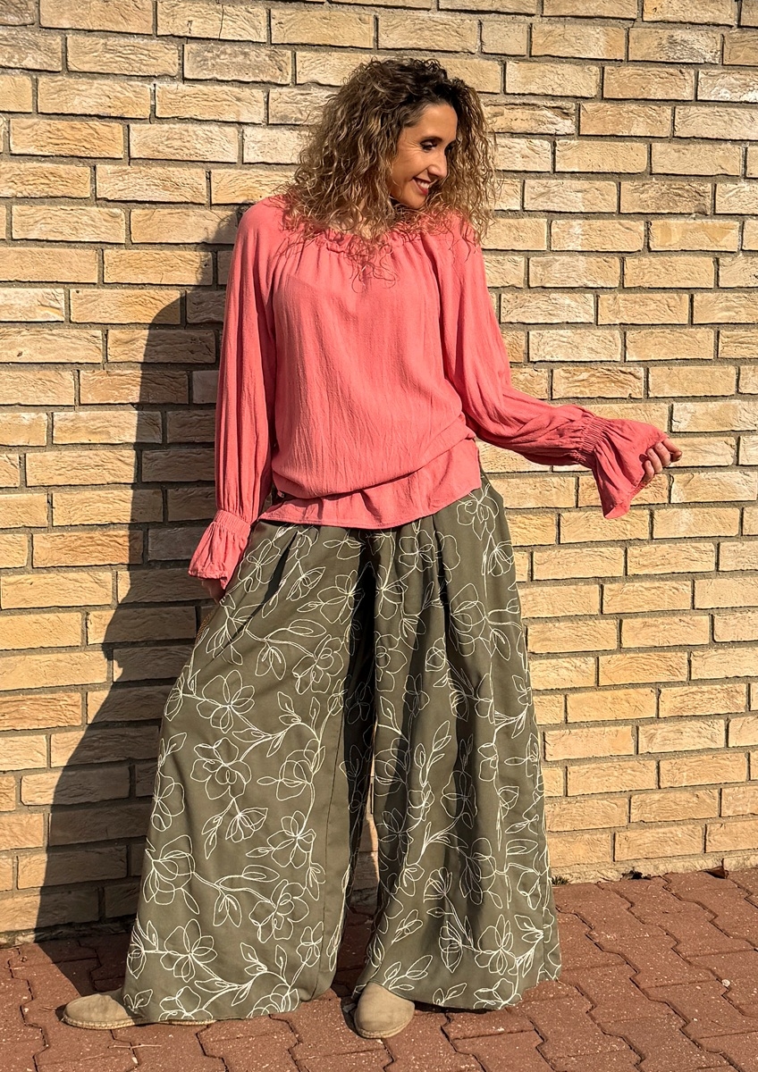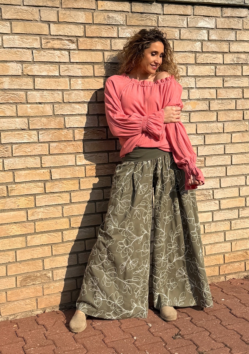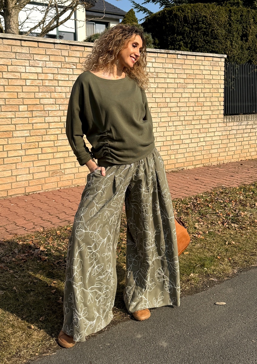 Široké kalhoty do zvonu. Na první pohled působí jako sukně.