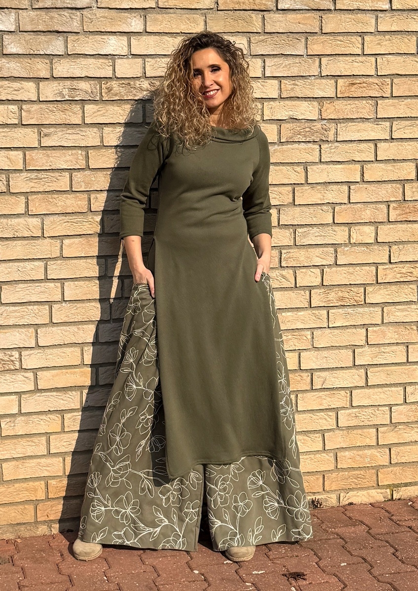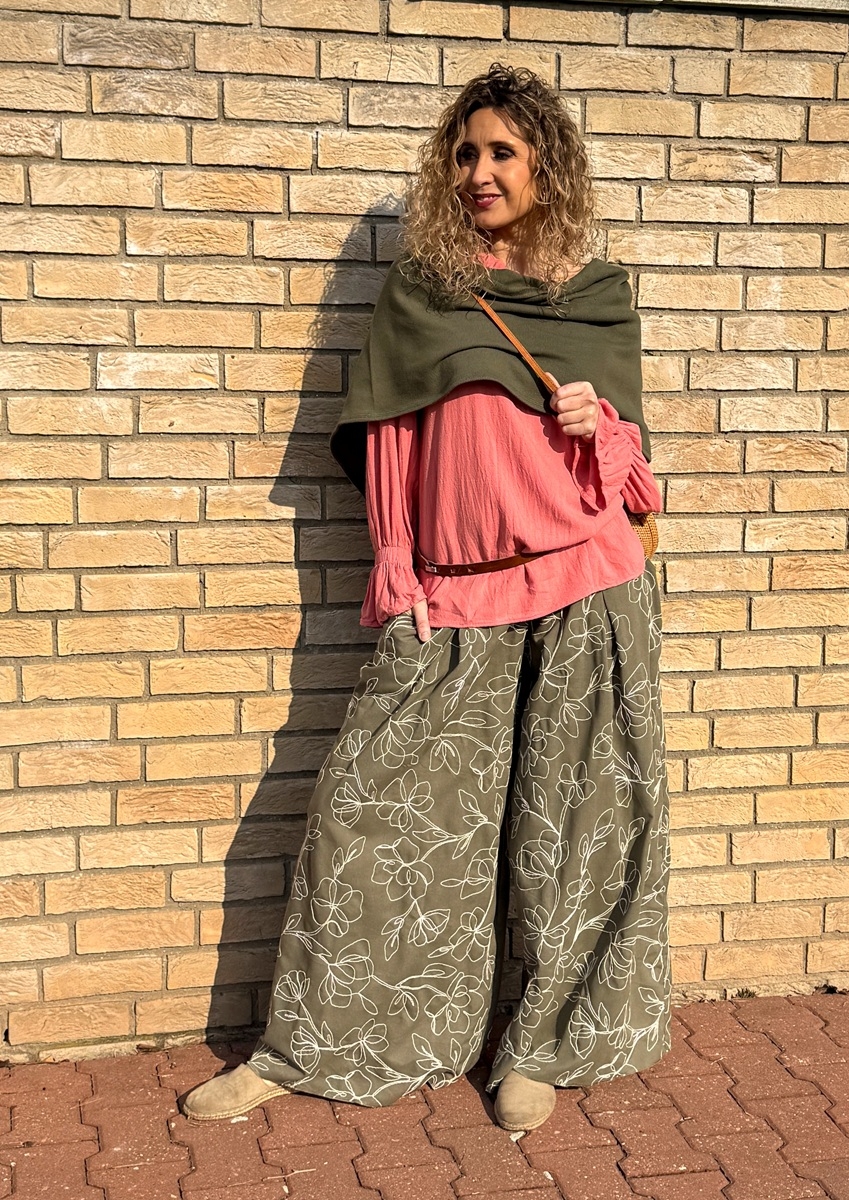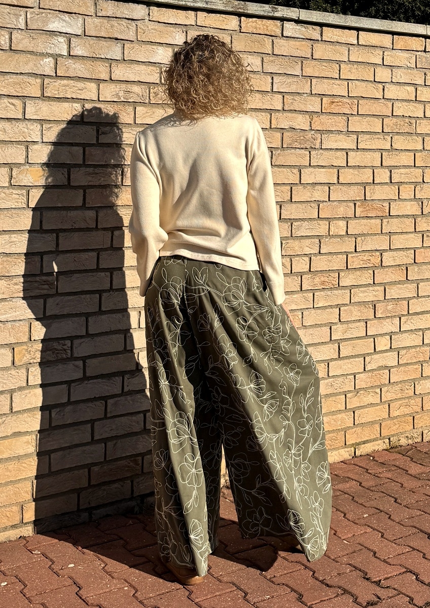 Kalhoty jsou ušité ušité ze měsového materiálu (viskóza/len). V bočních švech jsou kapsy. Pásek je pružný, vyztužený proti vytažení.