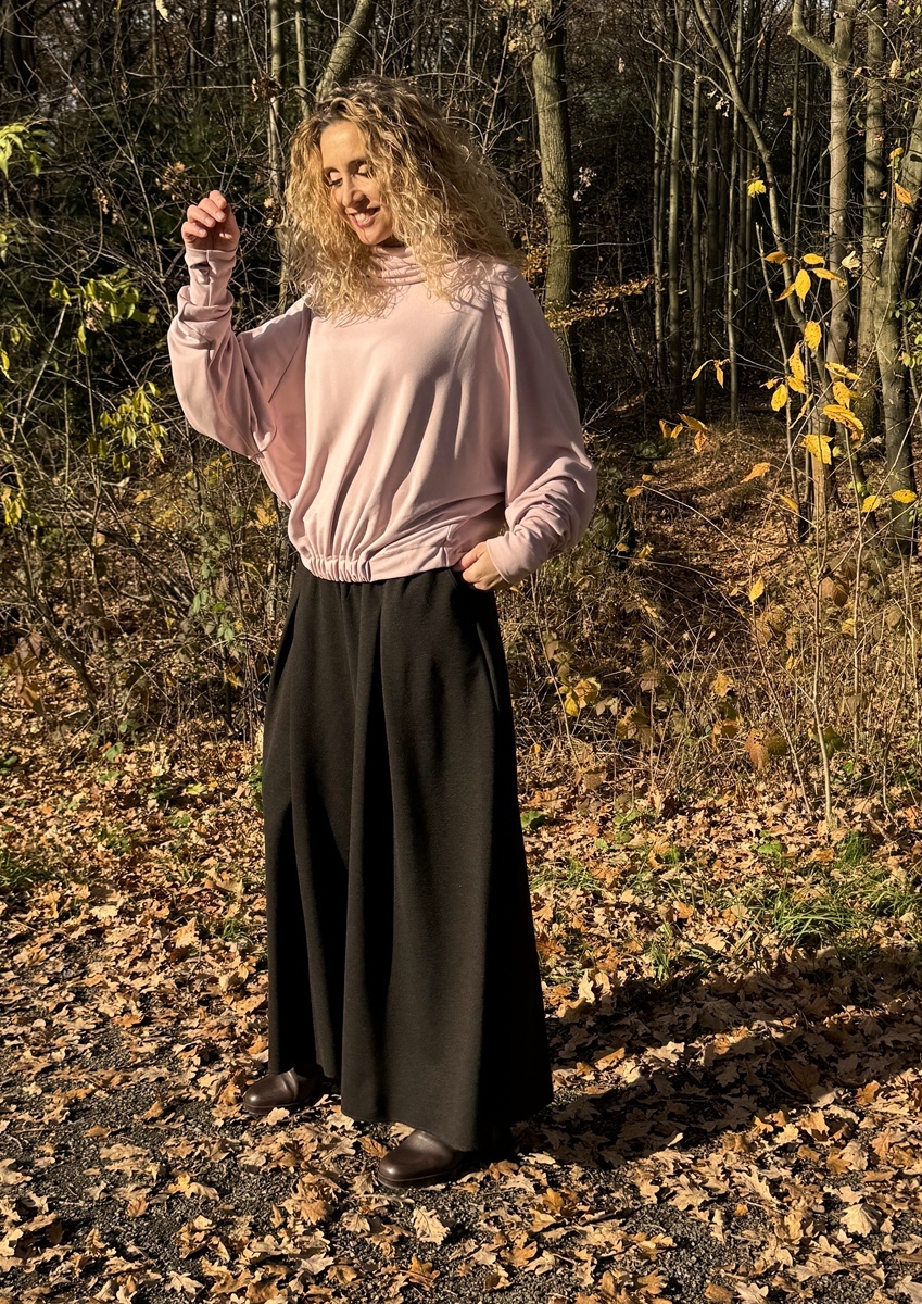 Kalhoty jsou ušité ze středně silného úpletu - materiál (viskóza/polyester/elastan) je vhodný na podzimní období.V bočních švech jsou kapsy. Pásek je pružný, vyztužený proti vytažení.