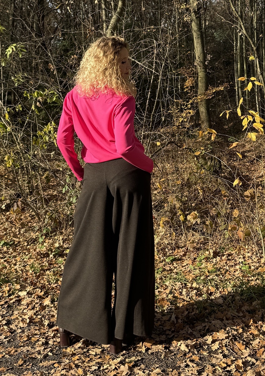 Široké kalhoty do zvonu. Na první pohled působí jako sukně.