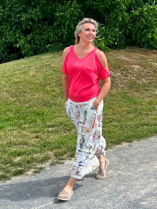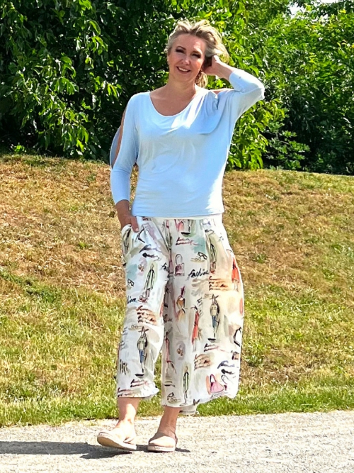 Široké lněné kalhoty do zvonu. Na první pohled působí jako sukně.