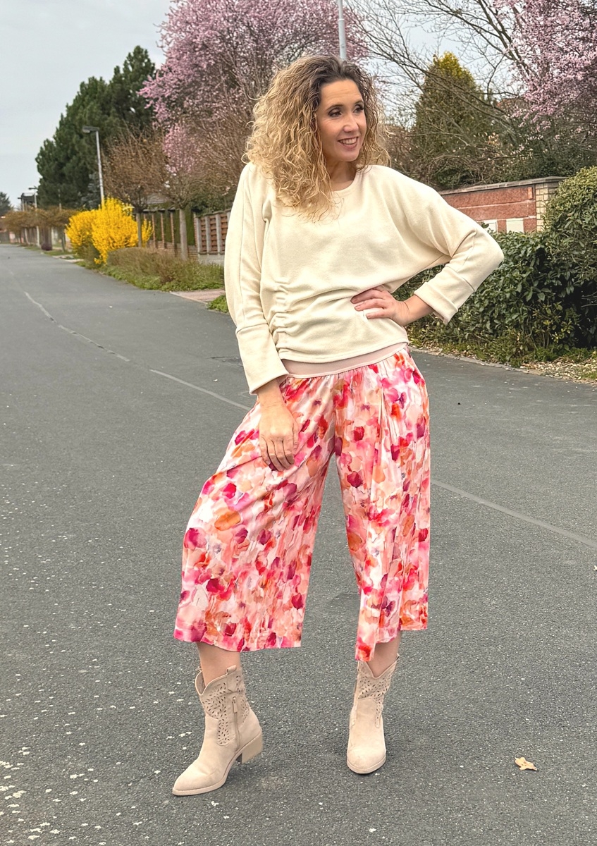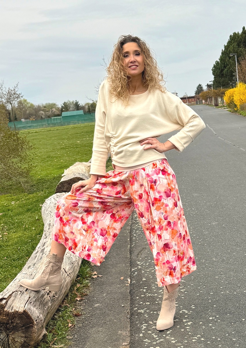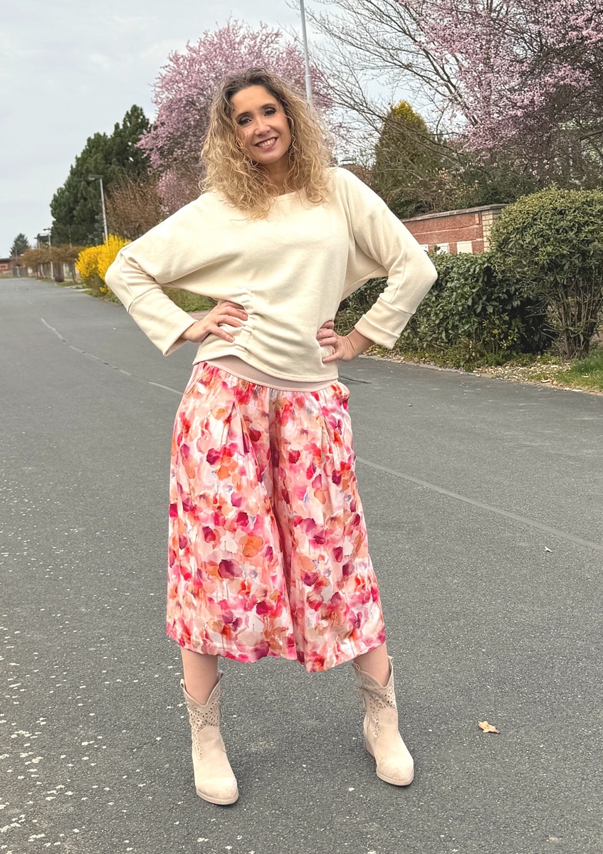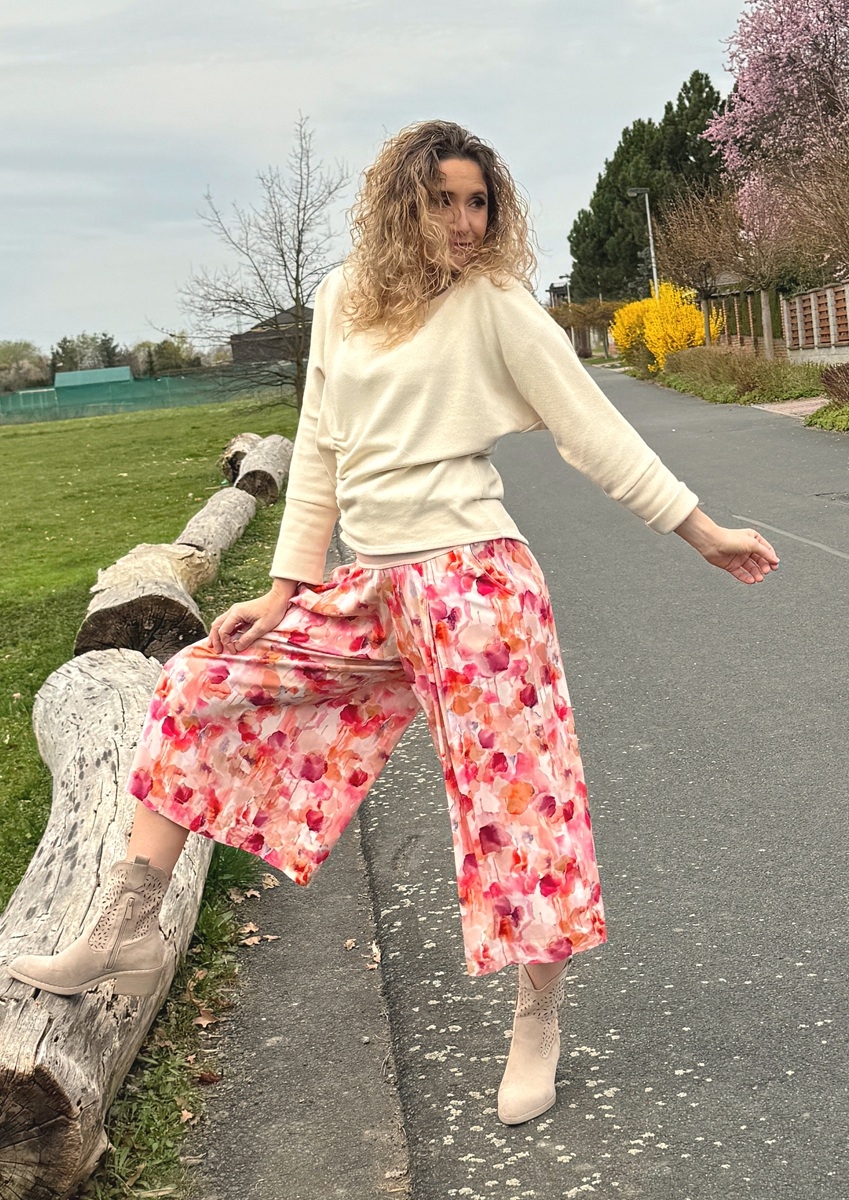 Široké kalhoty do zvonu. Na první pohled působí jako sukně. Kalhoty jsou ušité z viskózové splývavé tkaniny.