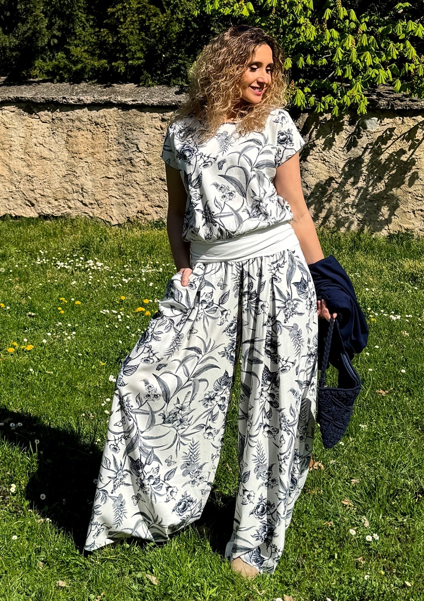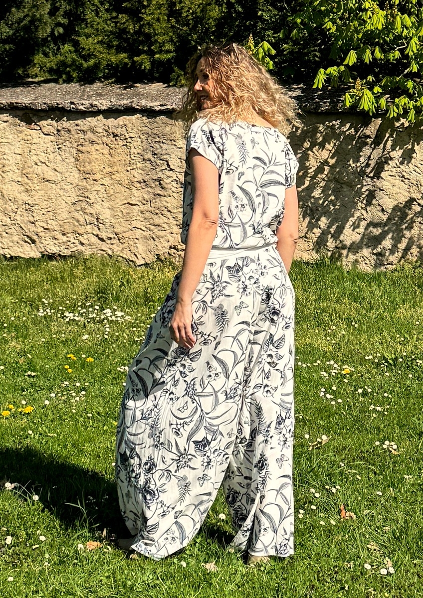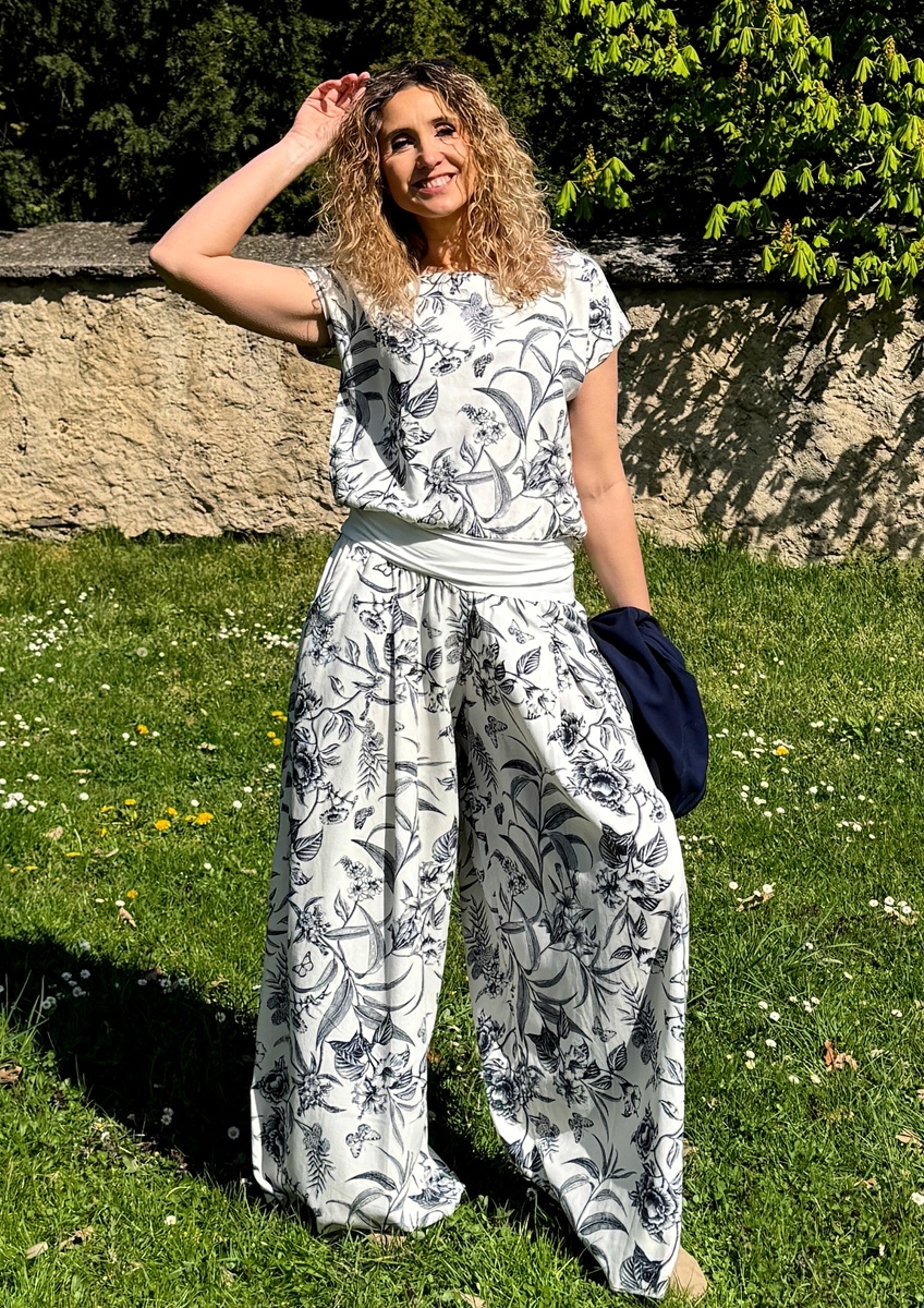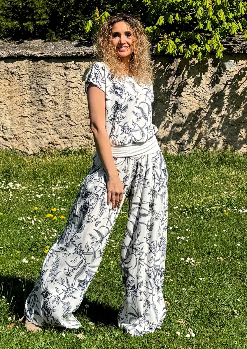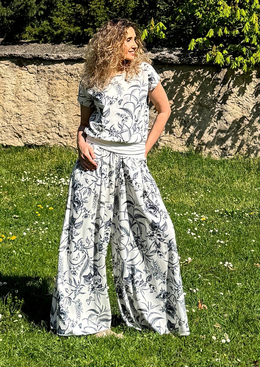Široké dlouhé kalhoty do zvonu. Na první pohled působí jako sukně. Pohodlné vzdušné kalhoty jsou ušité z krásného směsového materiálu viskóza 80%, len 20%. Pásek je pružný.