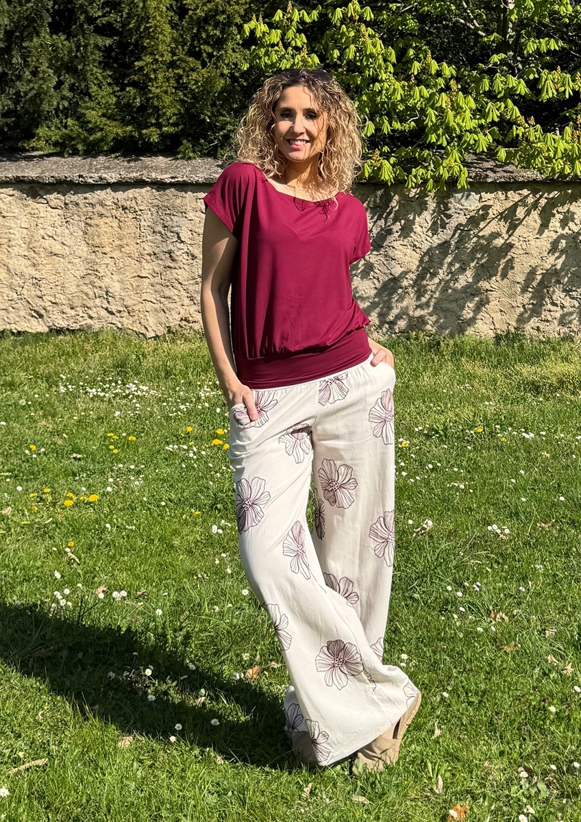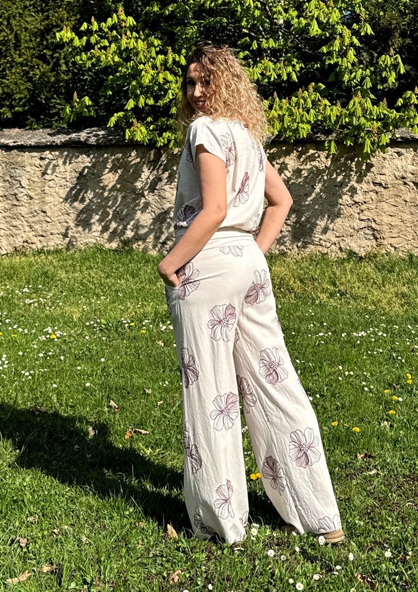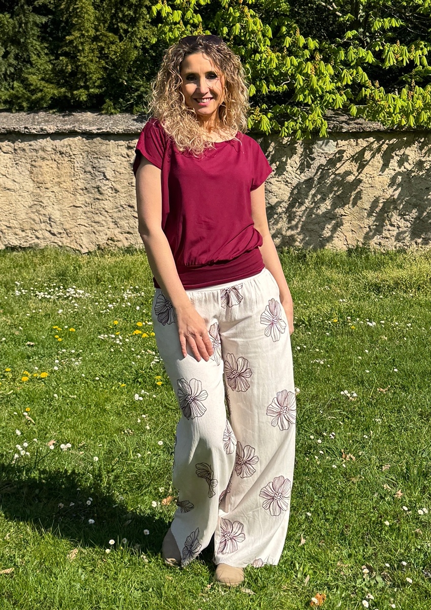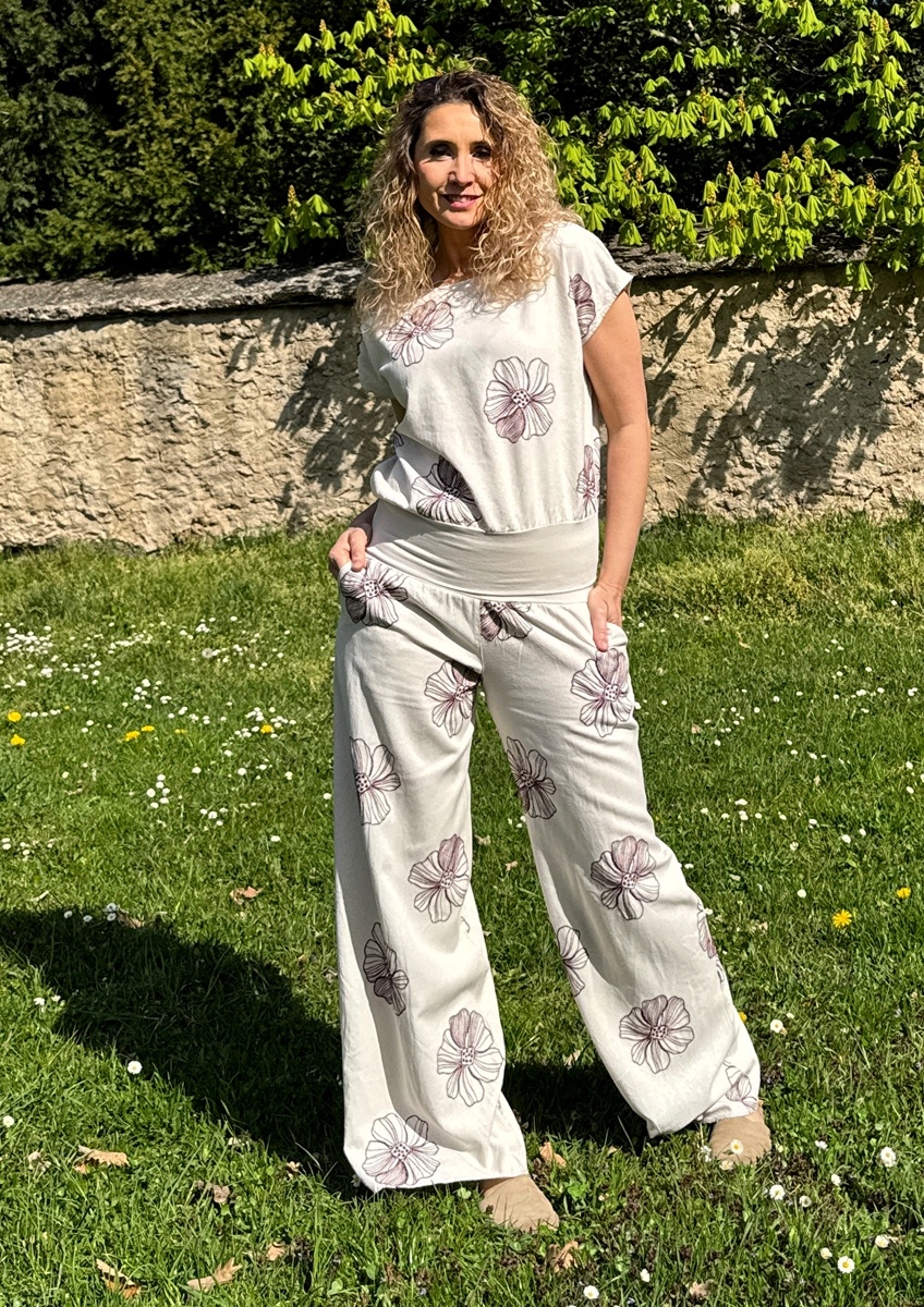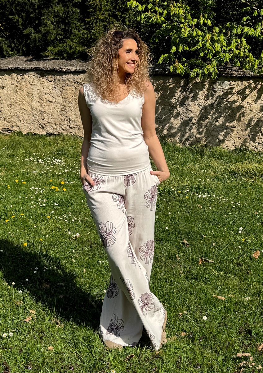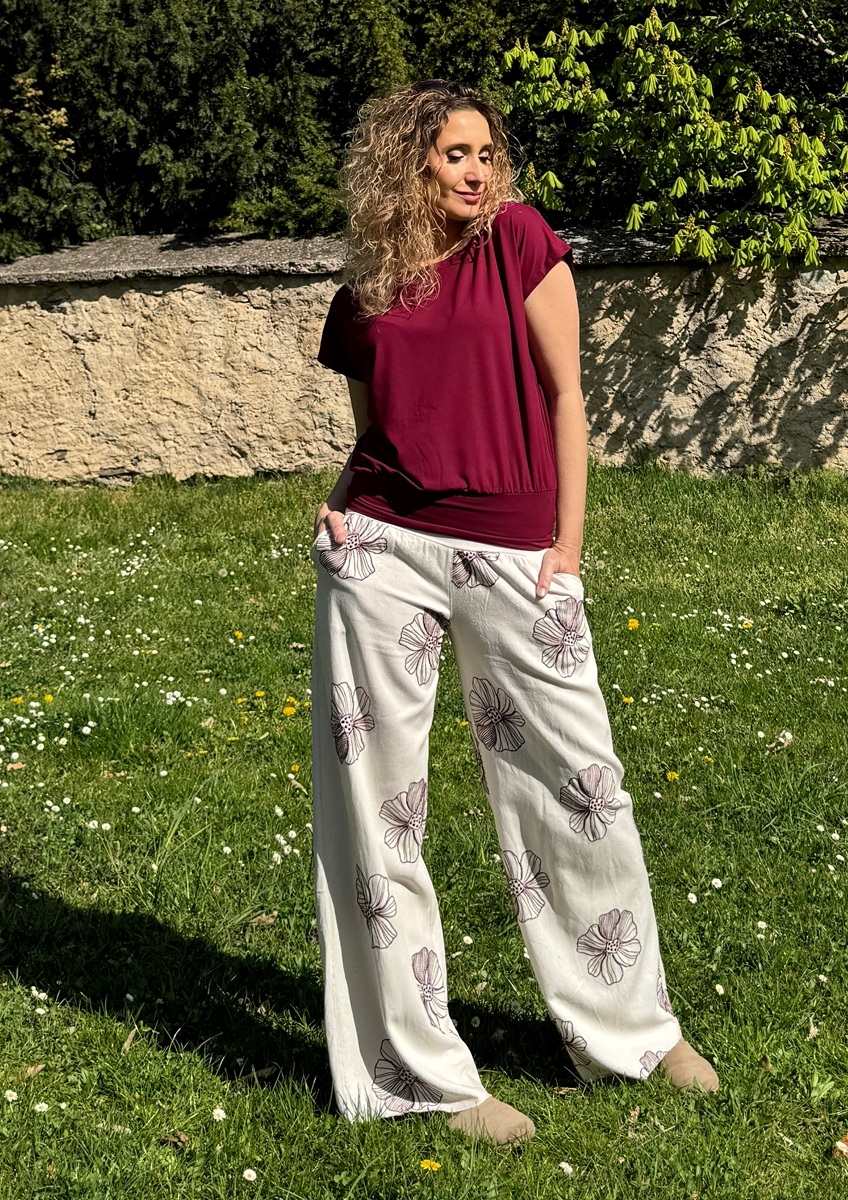 Pohodlné kalhoty jsou ušité ze středně silné směsové tkaniny (80% viskóza/20%len). S vyšívanými květy.