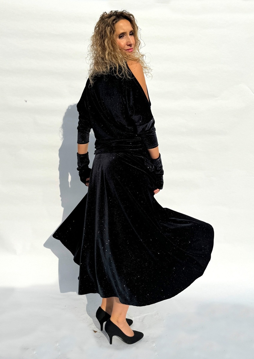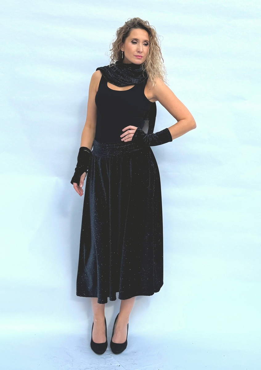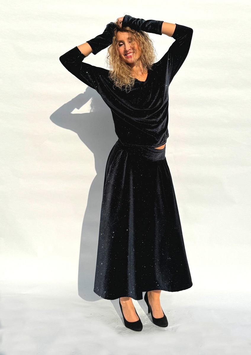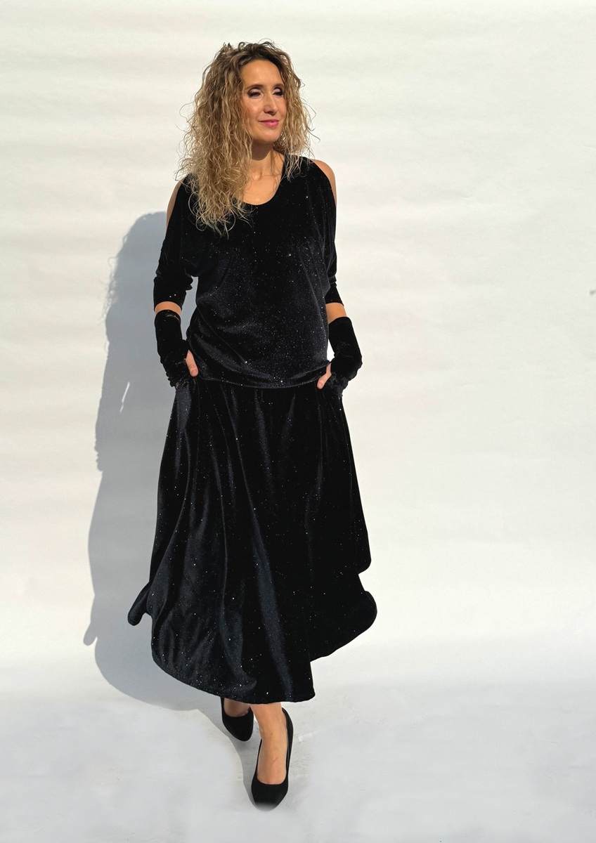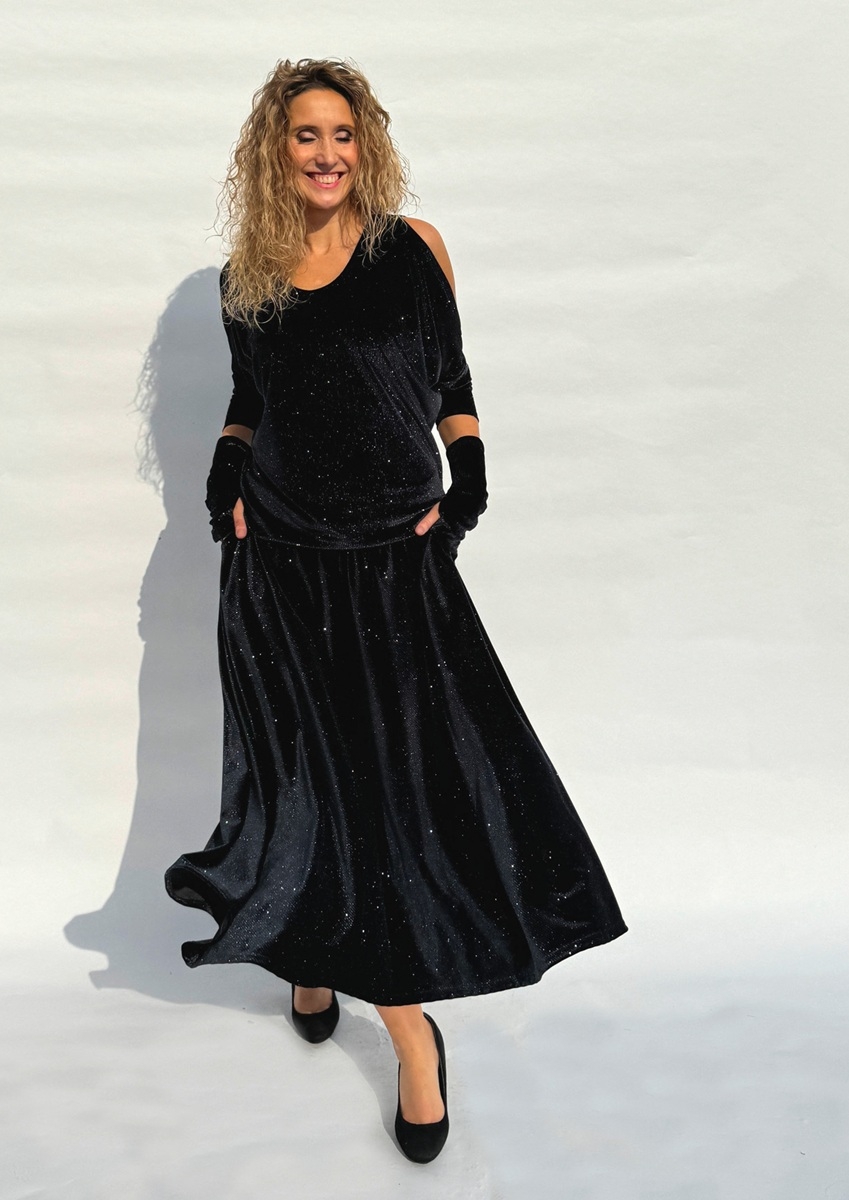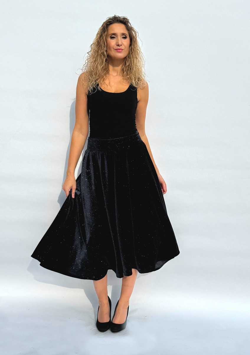 Rozšířená polokolová sukně je ušitá z pružného sametu s s třpytivou nitkou. V bočních švech jsou kapsy. Pásek je pružný a vyztužený proti vytažení.