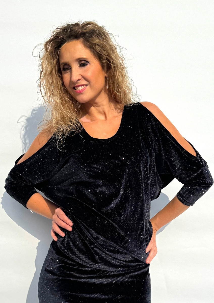 Volná tunika s vykrojením na ramenou je ušitá z sametového úpletu s lesklou nitkou.