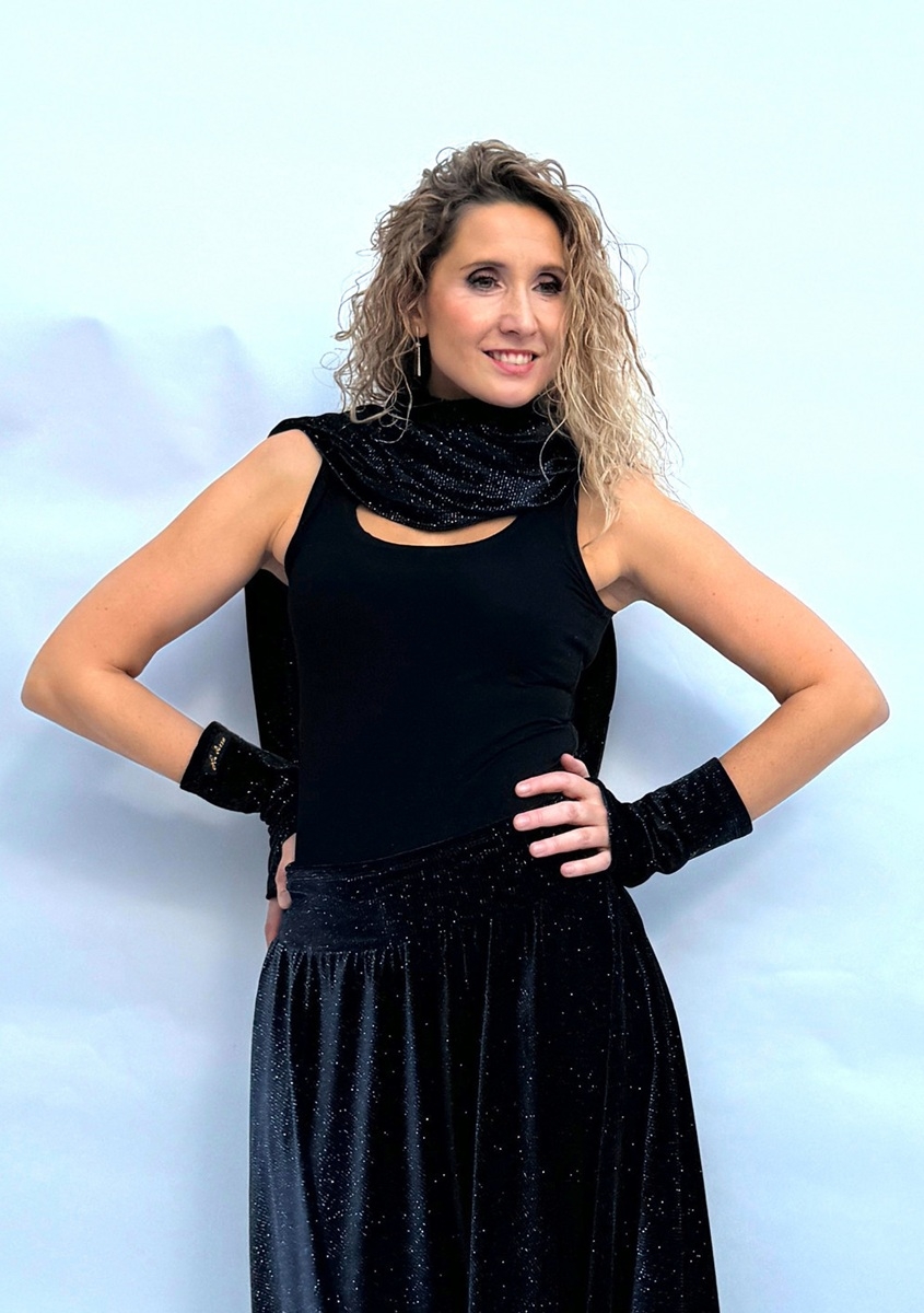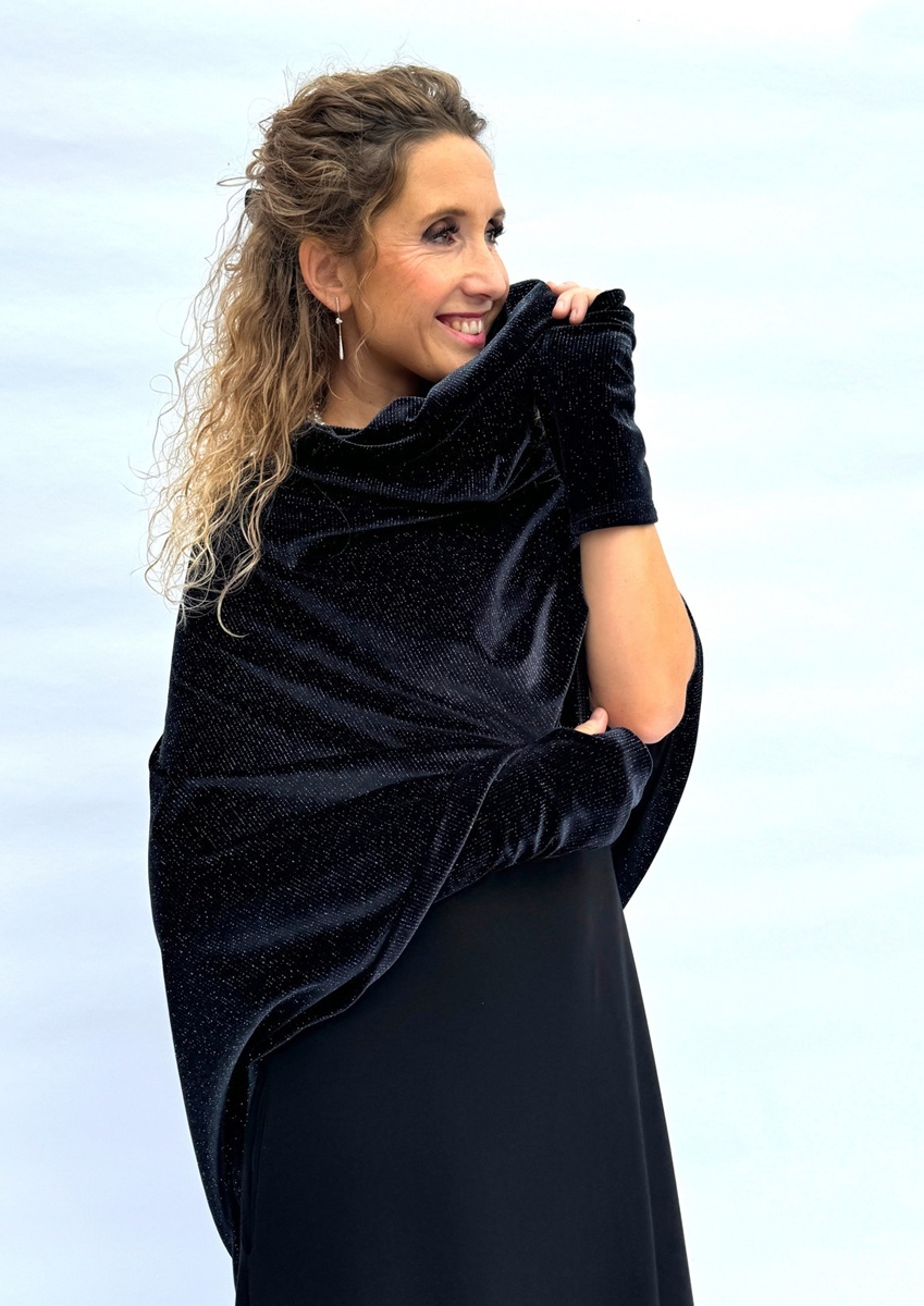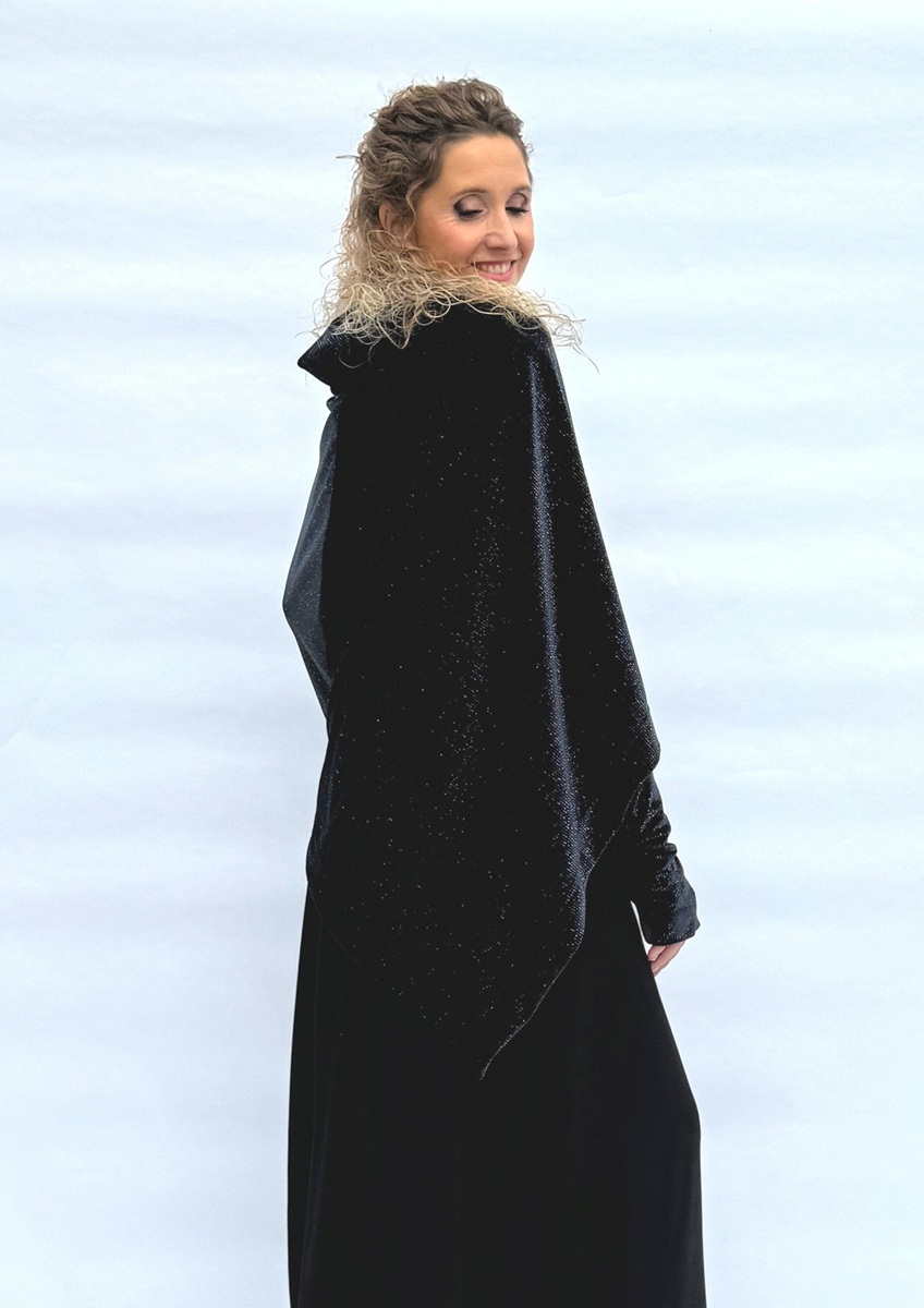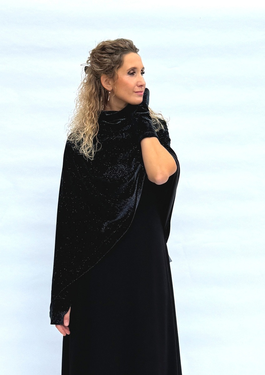 Pončo volným roláčkem je ušité zesametu  s kovovou  nitkou.