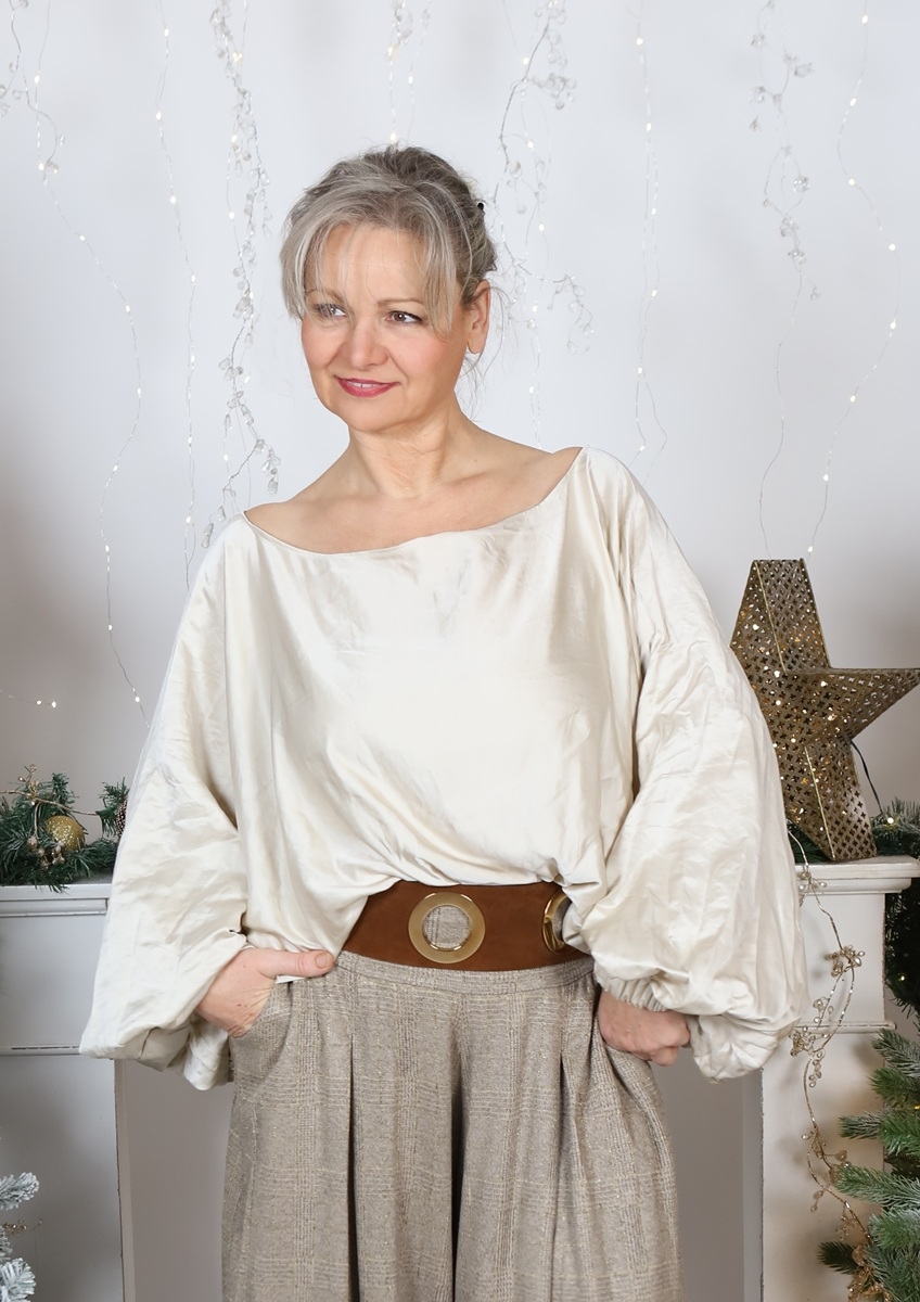 Volná tunika s lodičkovým výstřihem je ušitá z oboustranného pružného saténu vyšší gramáže.