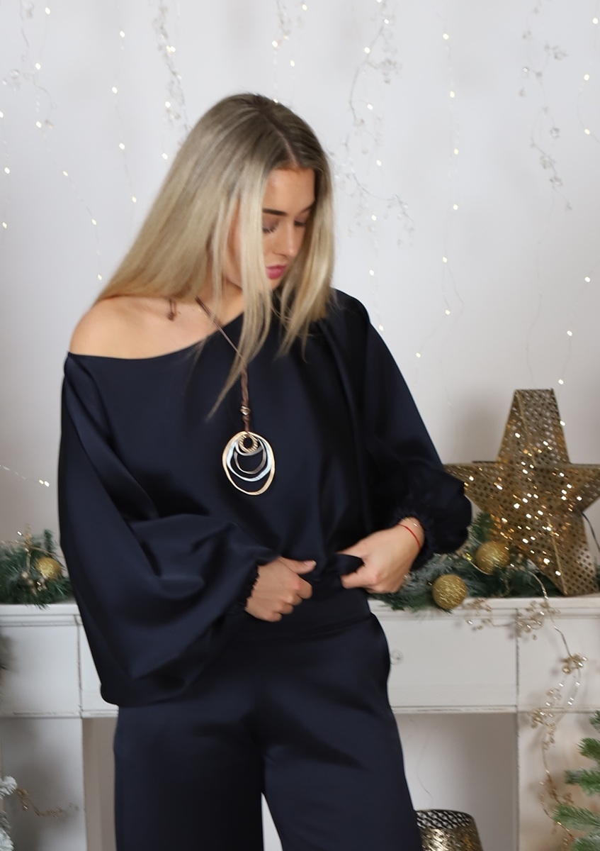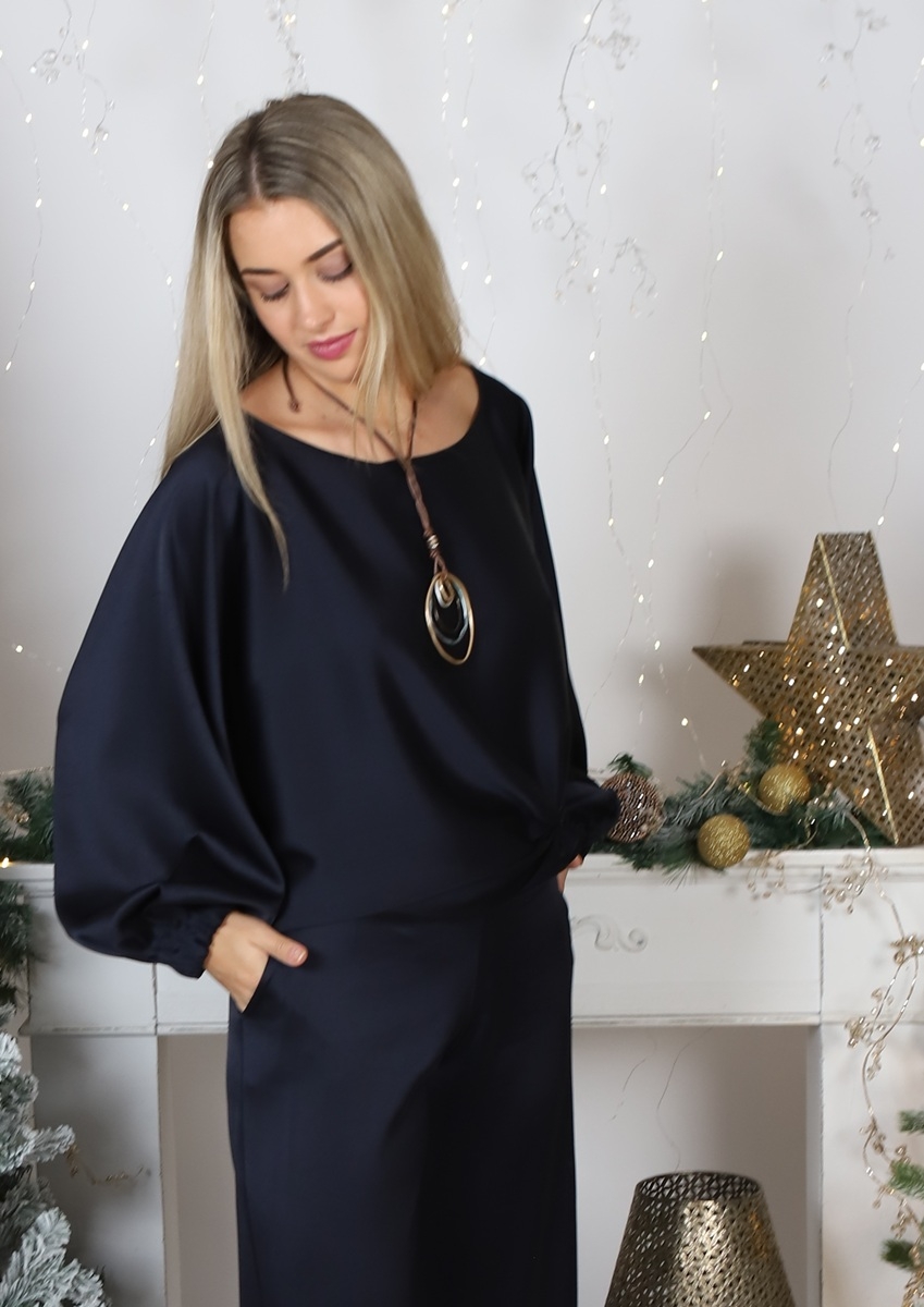 Volná tunika s lodičkovým výstřihem je ušitá z oboustranného pružného saténu vyšší gramáže.