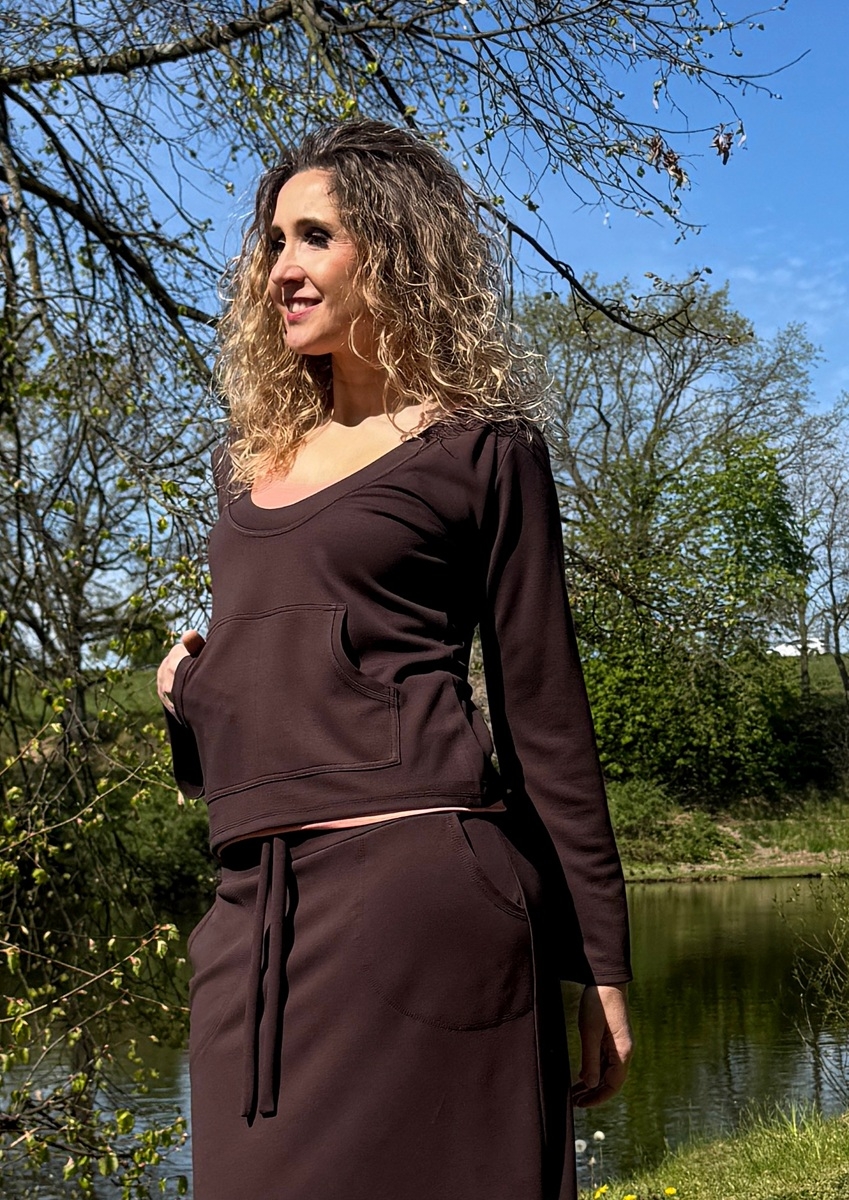 Tenká mikina s širokým rukávy, kapucí a velkým výstřihem je ušitá z úpletu viskóza/polyester/elastan. Na předním díle je klokanka. Mikinu můžete nosit jako soupravu se sukní.