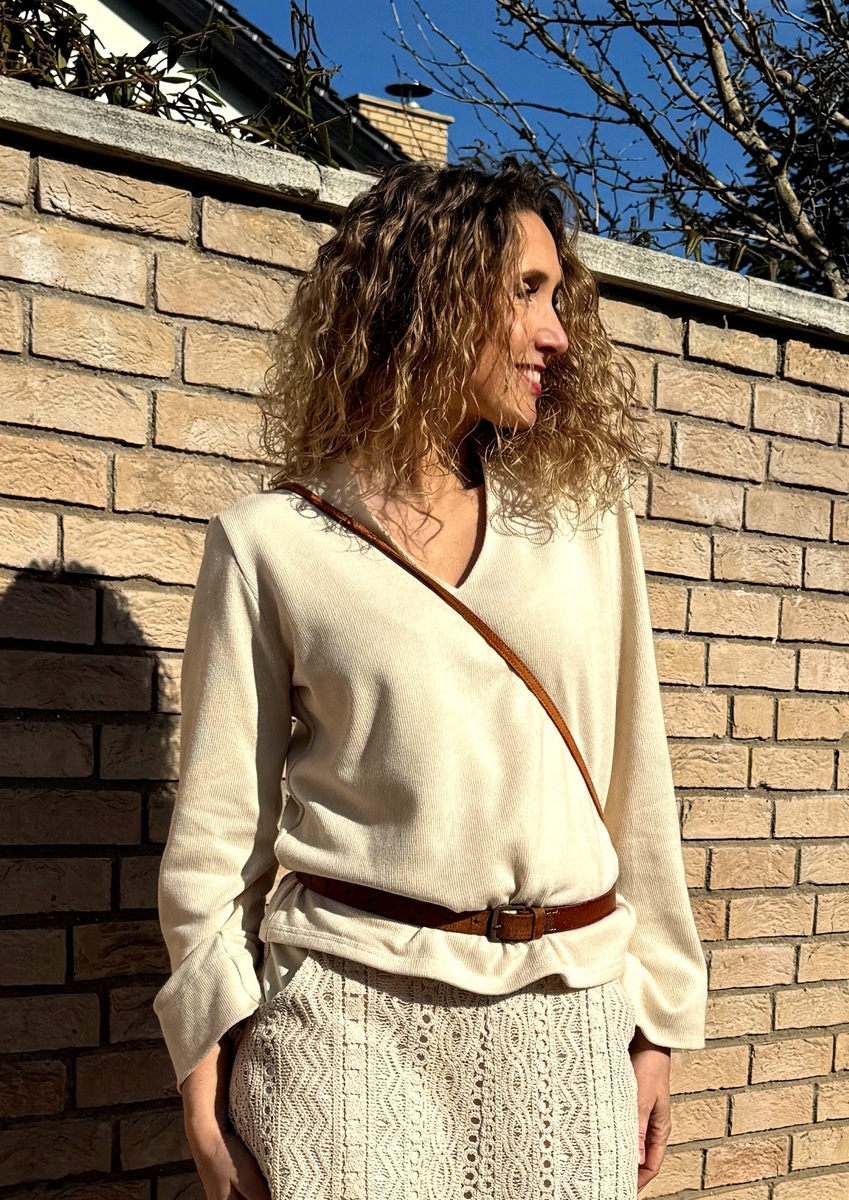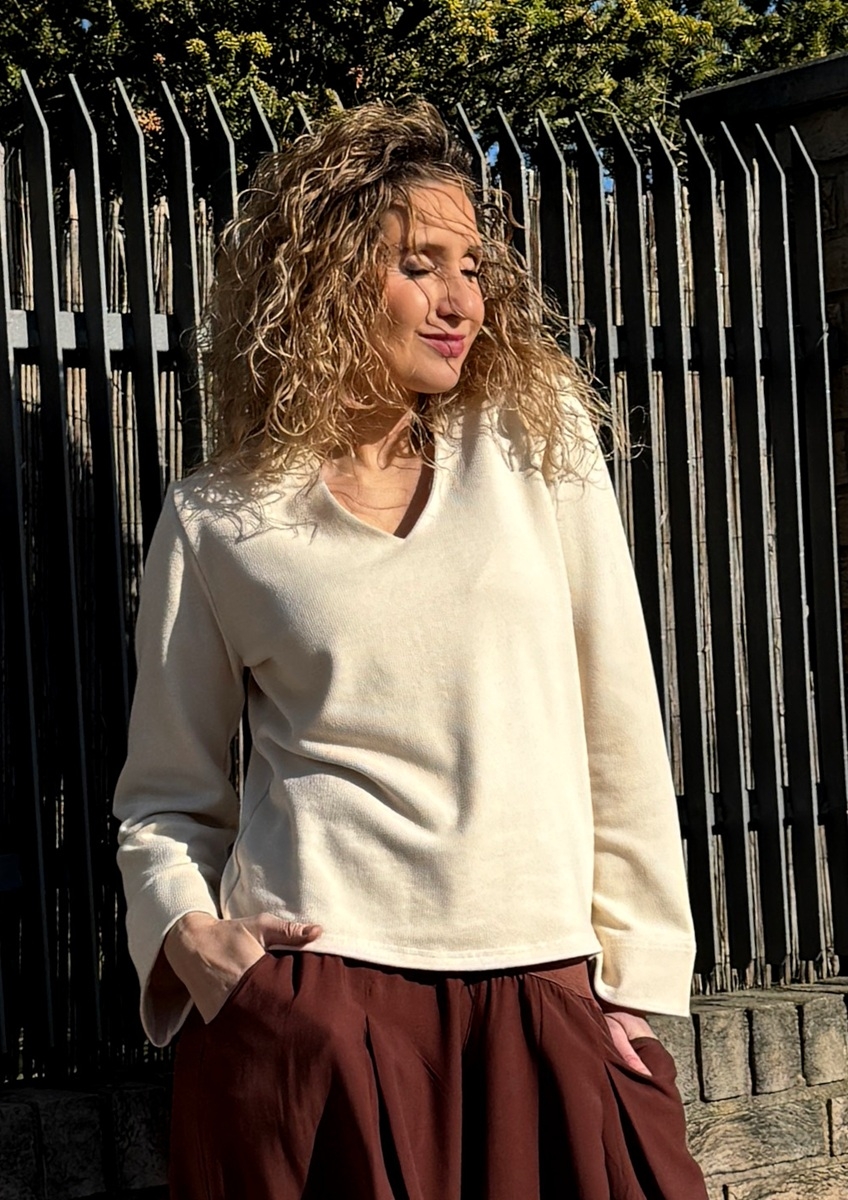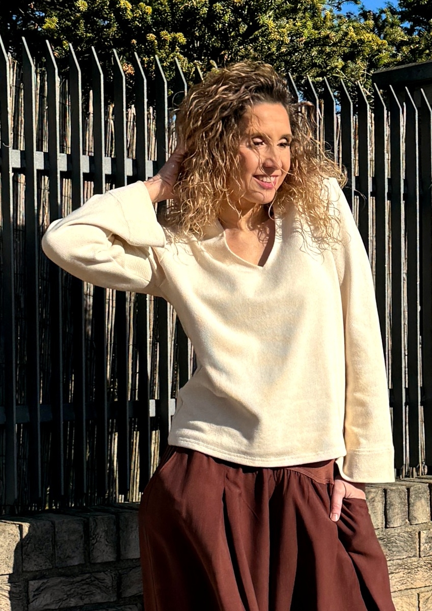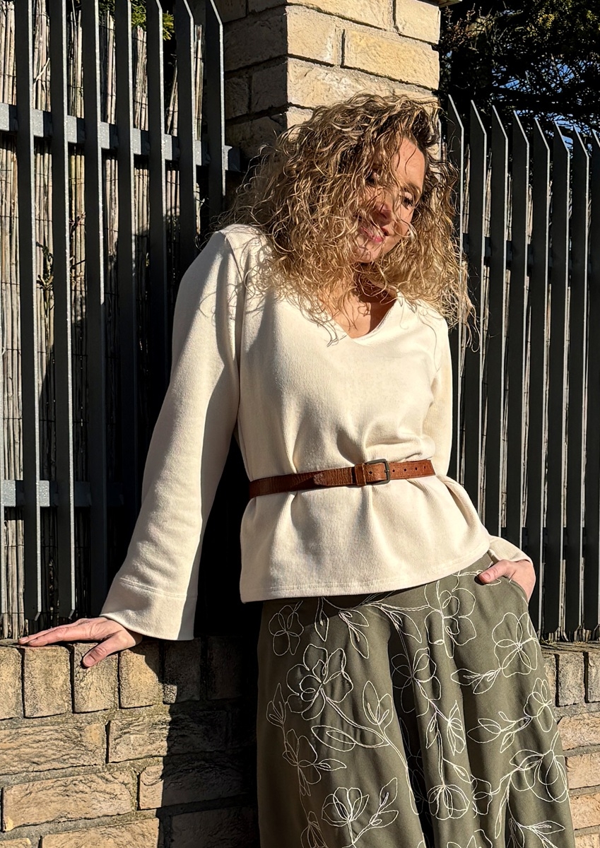 Střih je volný s širokými rukávy. Výstřih do tvaru V.