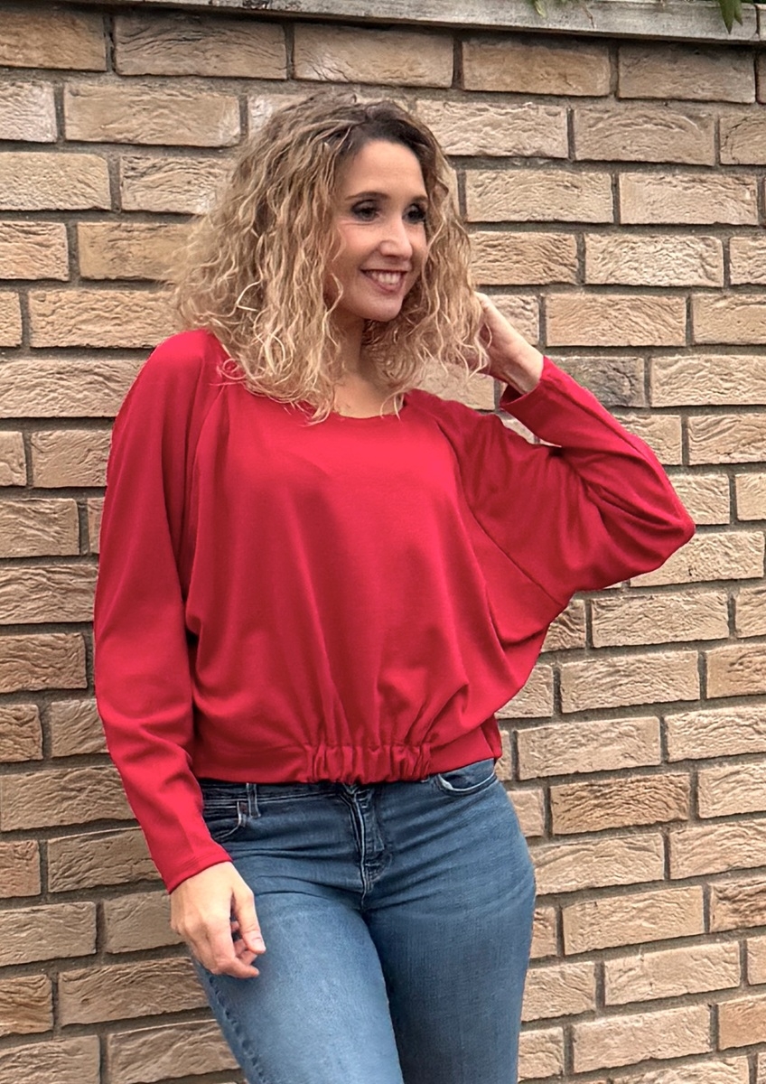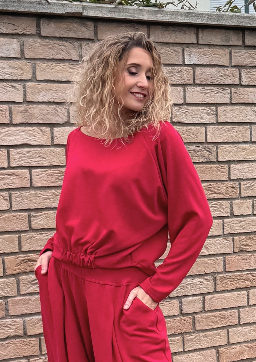 Má dlouhé rukávy se všitými nátepníky. Ne předním díle je v pase zdobený nařasením do široké gumy. Délka se mírně svažuje dozadu.