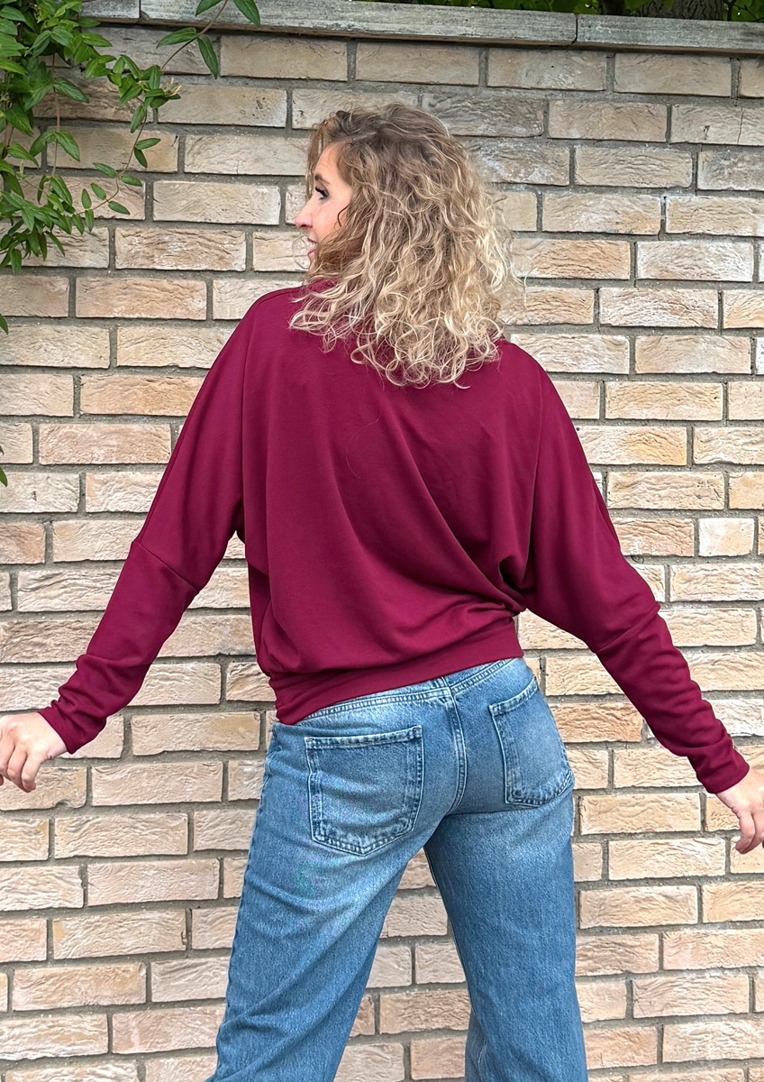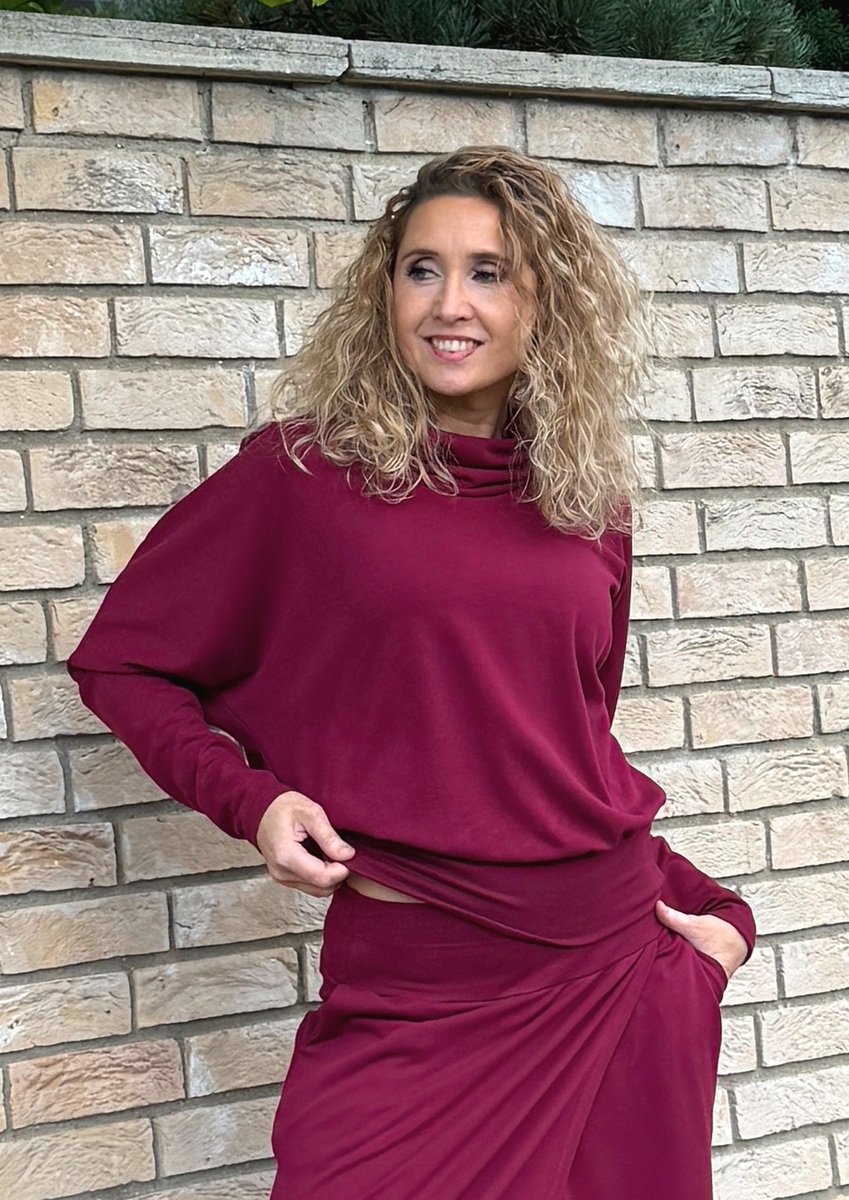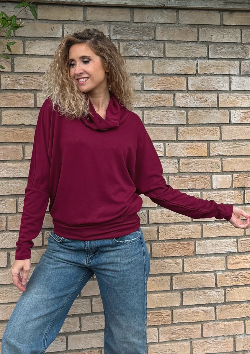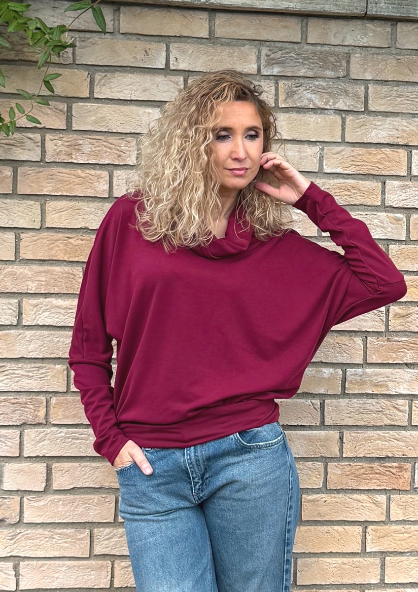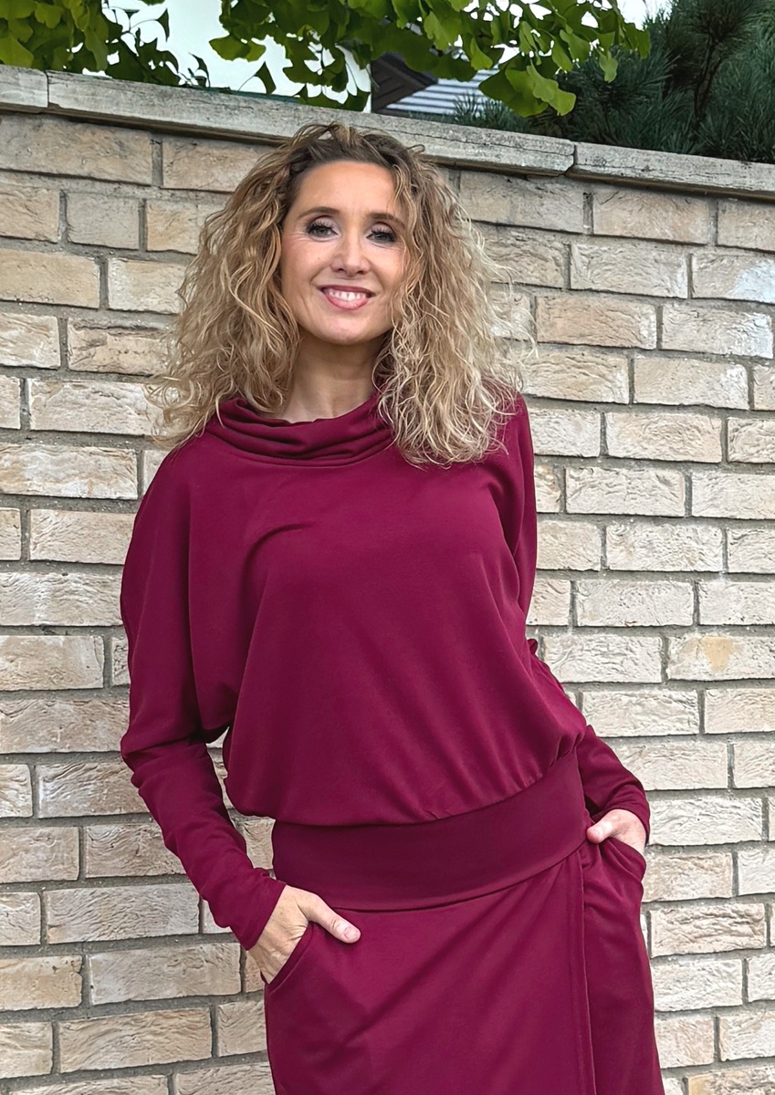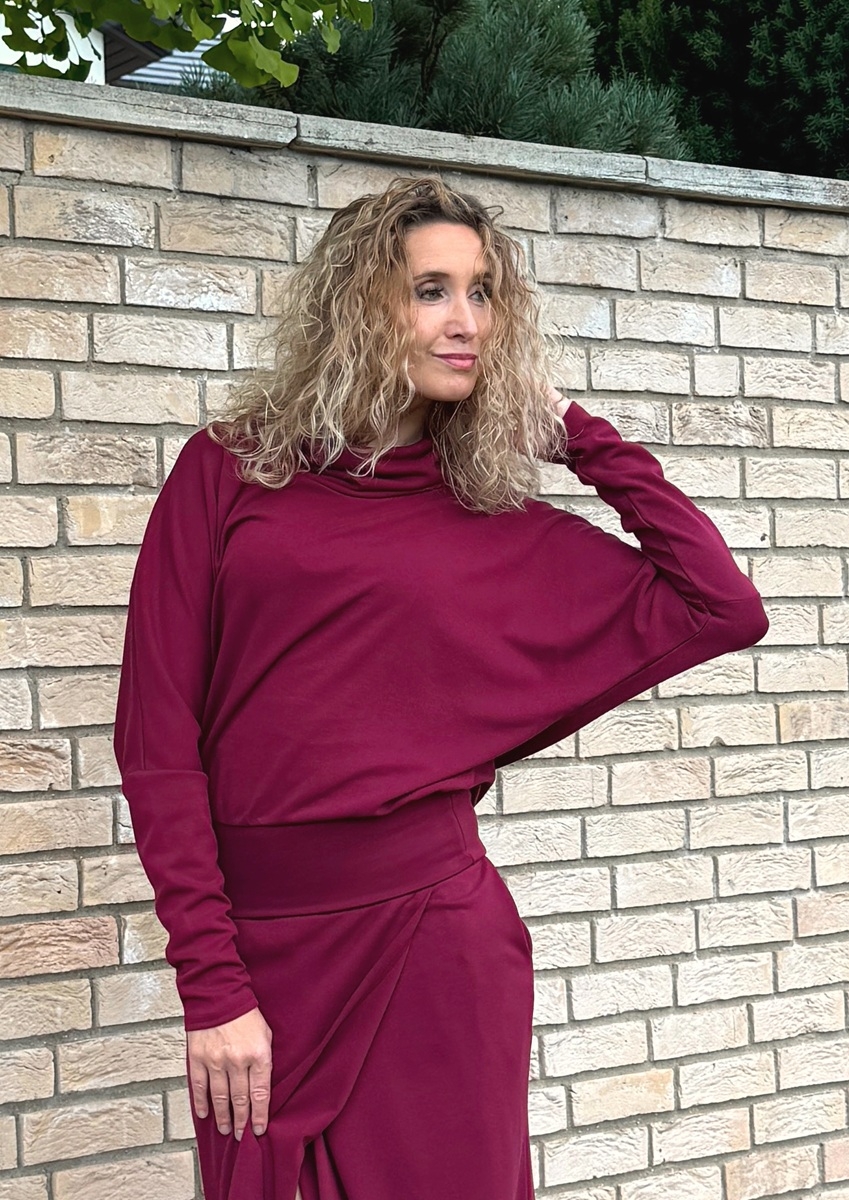 Rolák s dlouhým netopýřím rukávem je ušitý ze středně silného  směsového úpletu (68%vis/28%Pes/4%ela). Spodní díl je stažený do širokého pružného lemu.