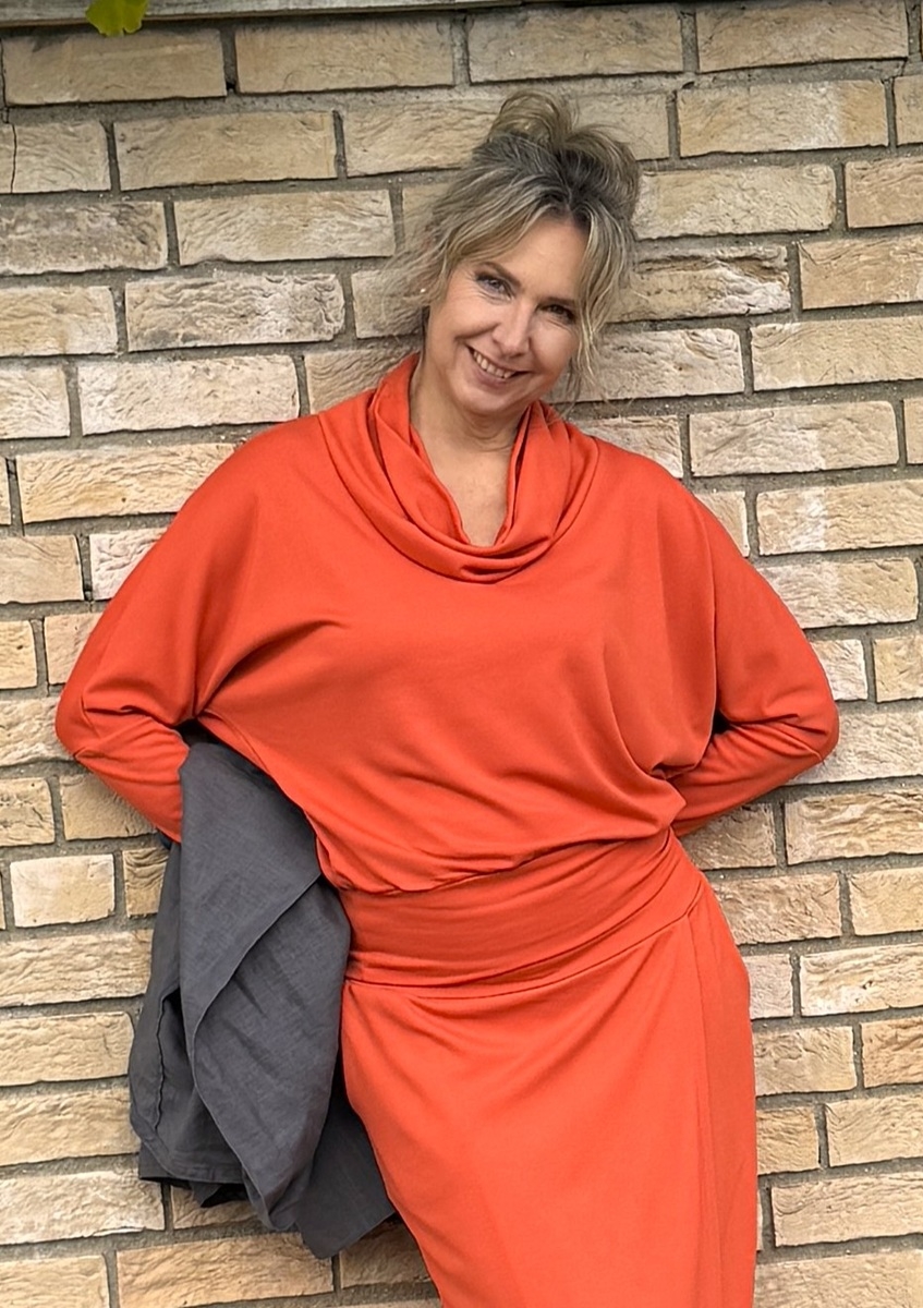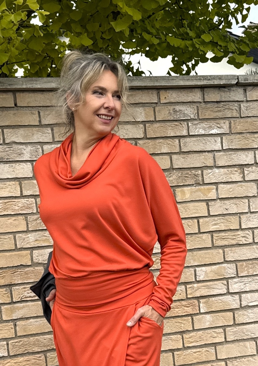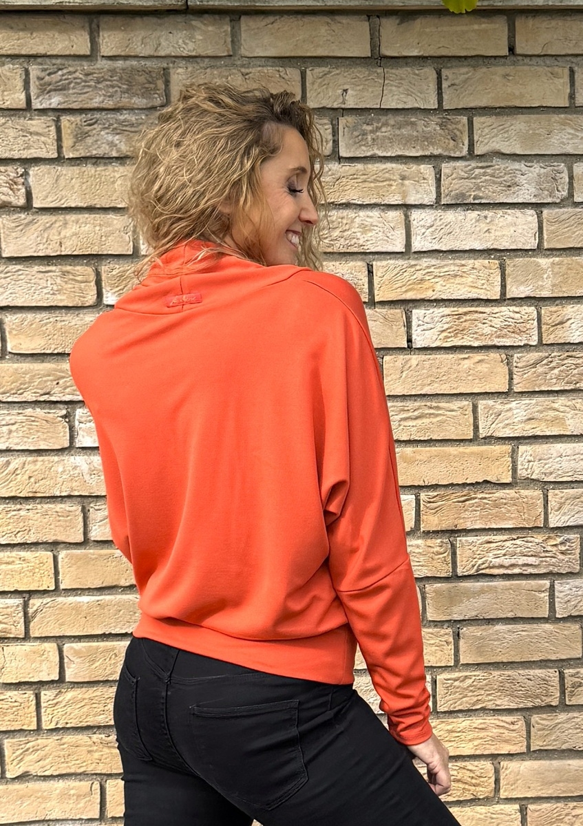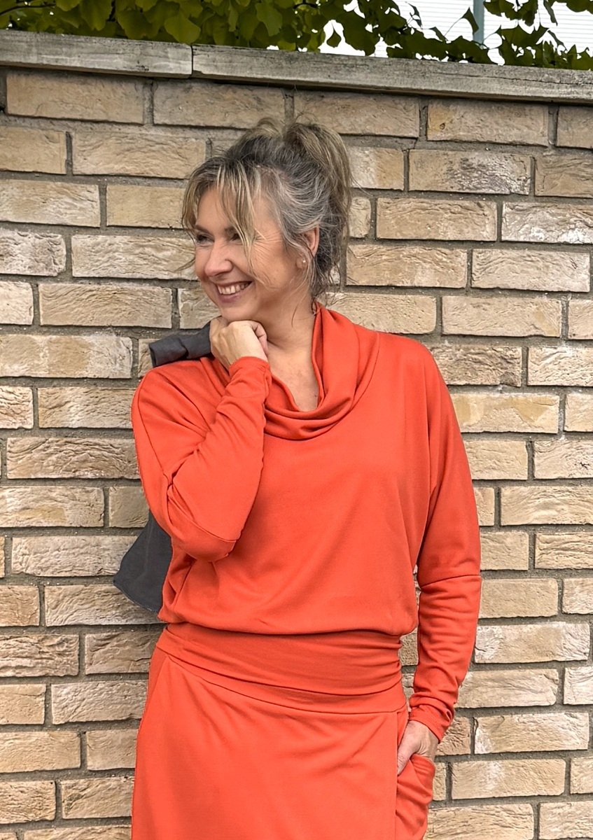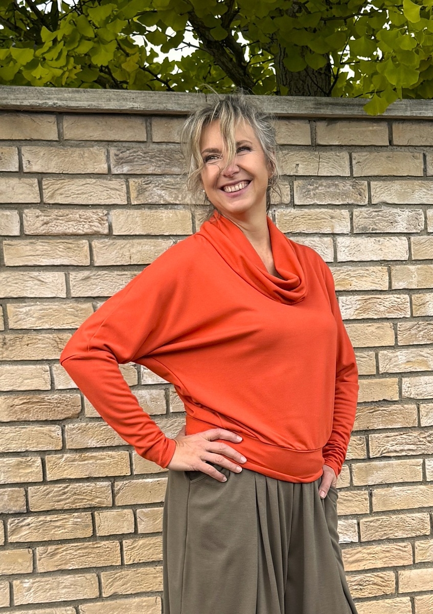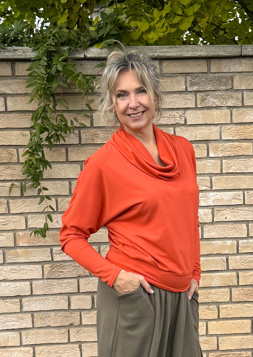 Rolák s dlouhým netopýřím rukávem je ušitý ze středně silného  směsového úpletu (68%vis/28%Pes/4%ela). Spodní díl je stažený do širokého pružného lemu.