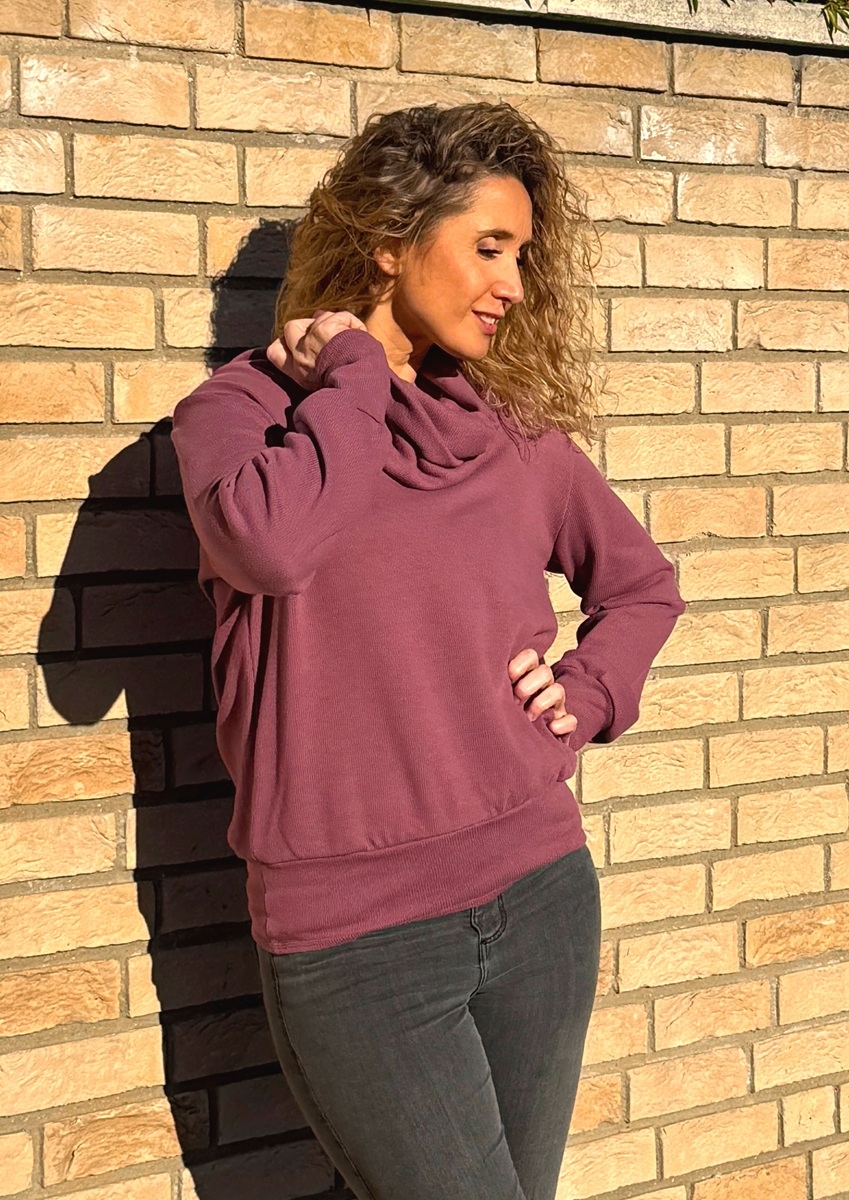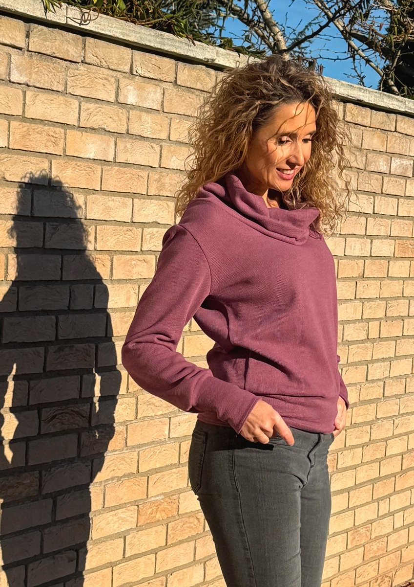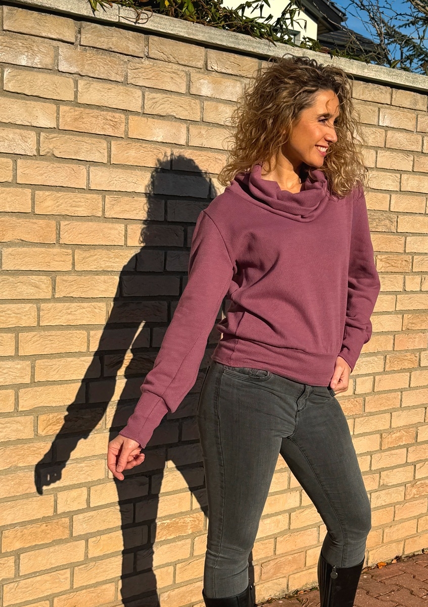 Rolák s dlouhým rukávem je ušitý z bavlněného svetrového úpletu. V pase je stažený do širokého lemu.