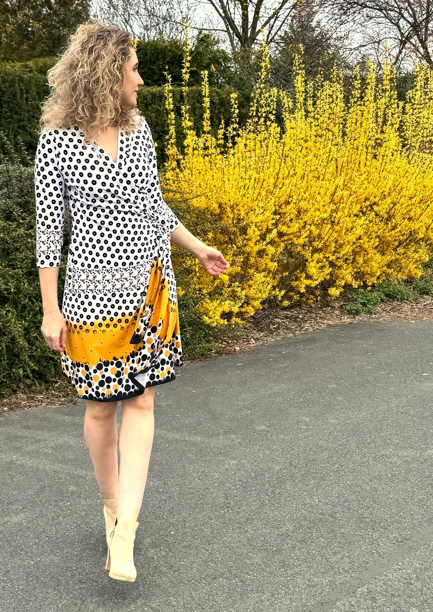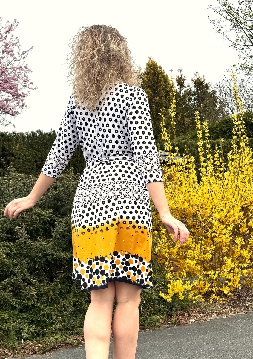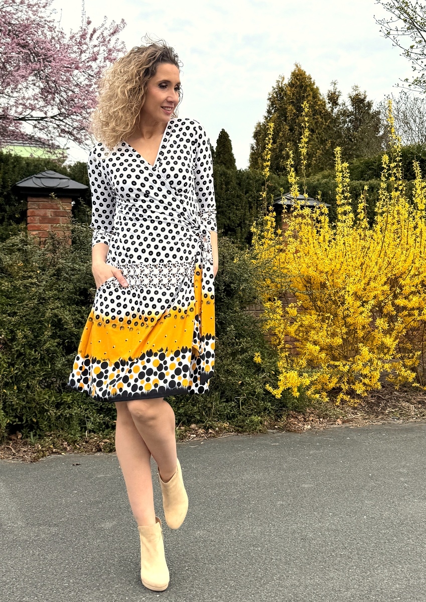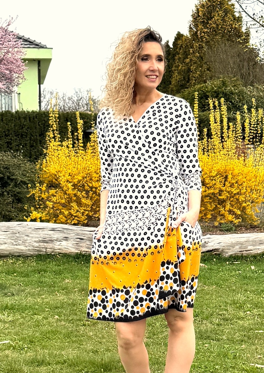 Zavinovací šaty se zvonovou sukní jsou ušité z pružného úpletu viskóza/lelastan. Na sukni jsou boční kapsy, 3/4 rukáv.
