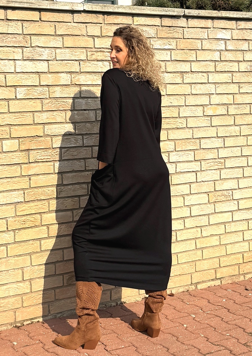 Šaty mají 3/4 rukávy a výrazné kapsy.